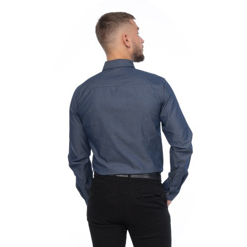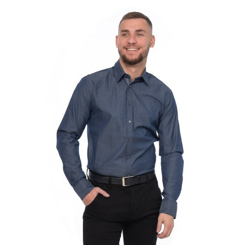 Хлопковая мужская рубашка с длинным рукавом. Силуэт приталенный с вытачками на спинке. Застежка на пуговицах. Воротник мягкий. Состав: 100% хлопок. Цвет темно-синий. Дышащий материал из денима позволя... Показать описаниеет мужчине чувствовать себя комфортно в течение всего дня. Мелкий принтованный рисунок в "горошек" на ткани. Ищете качественную рубашку для вашего мужчины? Обратите внимание на нашу мужскую рубашку из хлопка от российского бренда Maestro Fashion. Рубашка идеально подойдет как для повседневного использования, так и для торжественных случаев, для мужчины, юноши, подростка. Кроме того, она прекрасно сочетается с брюками или джинсами, создавая стильный и модный образ. Можно носить как на выпуск, так и в заправленном виде. Молодежная рубашка доступна по демократичной цене, что делает ее доступной для каждого покупателя. Не упустите возможность приобрести эту качественную и стильную вещь для гардероба вашего мужчины. Наша компания предлагает быструю доставку по всей стране. Вы можете выбрать подходящий размер из нашего широкого ассортимента. Закажите мужскую приталенную модную сорочку прямо сейчас и наслаждайтесь ее качеством и стилем!