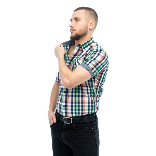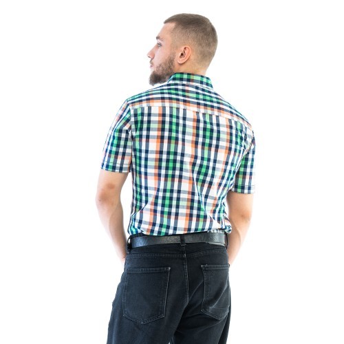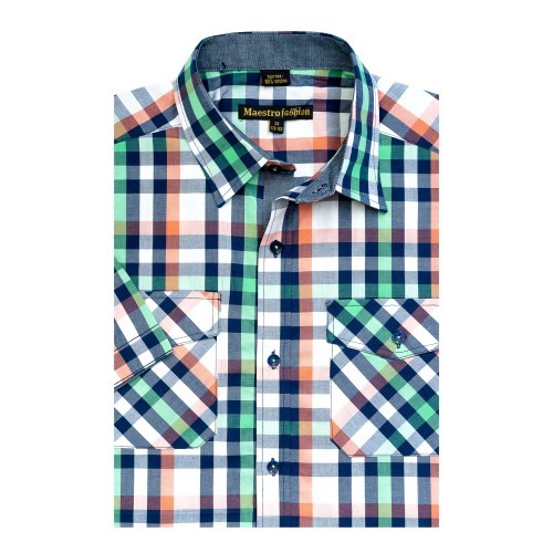Хлопковая мужская рубашка с коротким рукавом. Силуэт приталенный с вытачками на спинке. Застежка на пуговицах. Воротник мягкий. На груди два накладных кармана. Состав: 100% хлопок. Дышащая ткань позво... Показать описаниеляет мужчине чувствовать себя комфортно в течение всего дня. Пестротканый материал в крупную клетку. Контрастная отделка тканью из денима внутри ворота, манжет и по внутренней планке добавляет рубашке практичности. Цвет: синий, зеленый, оранжевый. Ищете качественную рубашку для вашего мужчины? Обратите внимание на нашу мужскую рубашку из хлопка от российского бренда Maestro Fashion. Рубашка идеально подойдет как для повседневного использования, так и для торжественных случаев, для мужчины, юноши, подростка. Кроме того, она прекрасно сочетается с брюками или джинсами, создавая стильный и модный образ. Можно носить как на выпуск, так и в заправленном виде. Молодежная рубашка доступна по демократичной цене, что делает ее доступной для каждого покупателя. Не упустите возможность приобрести эту качественную и стильную вещь для гардероба вашего мужчины. Наша компания предлагает быструю доставку по всей стране. Вы можете выбрать подходящий размер из нашего широкого ассортимента. Закажите мужскую приталенную модную сорочку прямо сейчас и наслаждайтесь ее качеством и стилем!