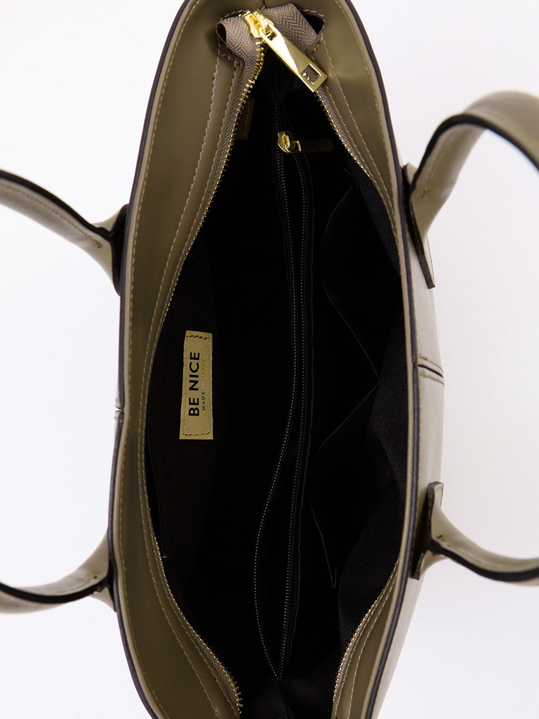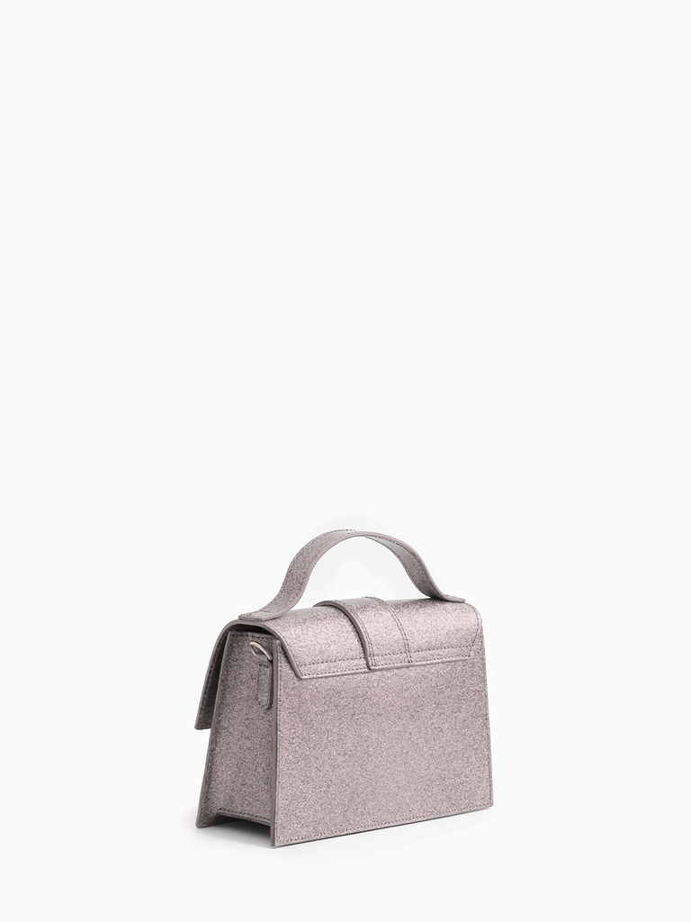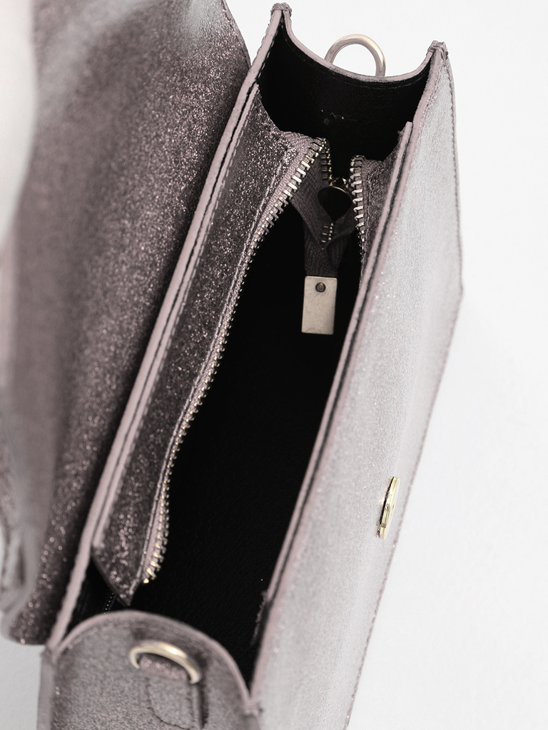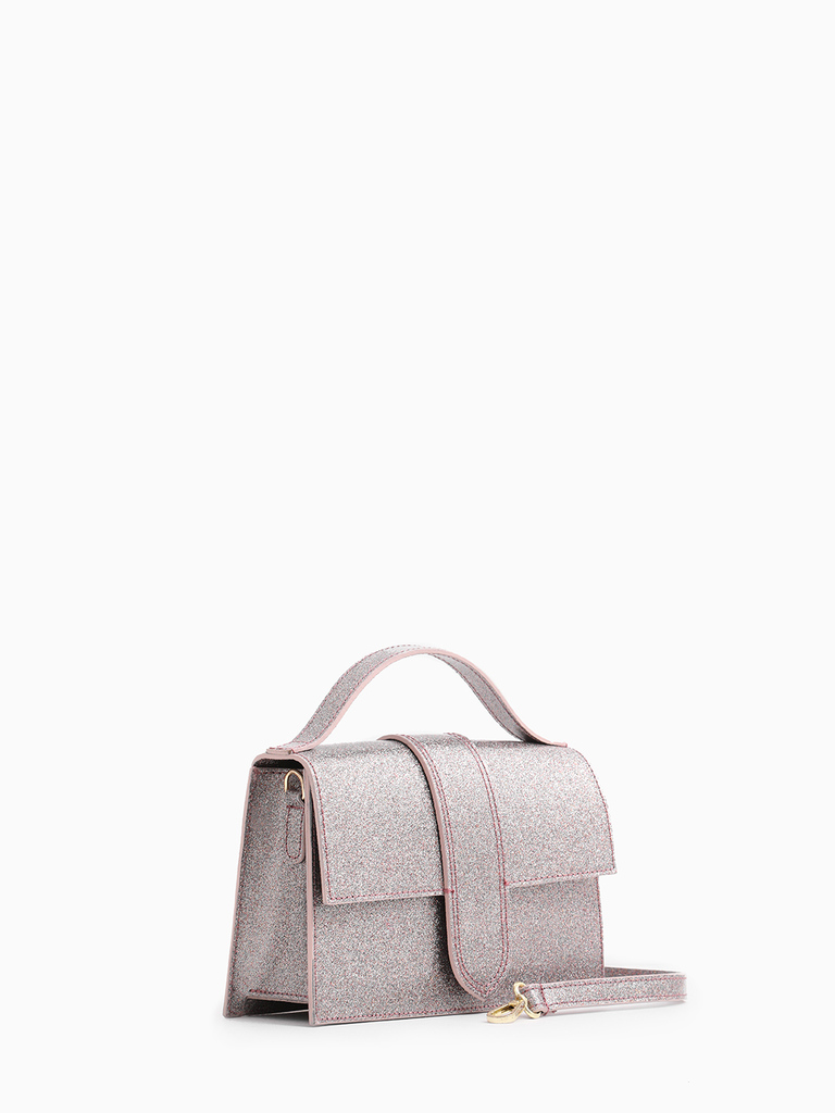 Небольшой сэтчел с глиттером от BE NICE в пудровом оттенке Материал: натуральная кожа Размеры: Длина по дну: 23 см Длина по верхнему краю: 21 см Ширина по дну: 8 см Высота: 15 см Высота с ручкой: 21см... Показать описание Описание: Небольшой сэтчел от итальянского бренда BE NICE выполнен из лаковой натуральной кожи с глиттером, декорирован фирменной строчкой. Данная модель закрывается на молнию и клапаном на магнитную кнопку, носится на сгибе руки, в руке или на плече на ремне, максимальная длина которого - 139 см (регулируется) Внутри: одно отделение, боковой карман на молнии Производитель: BE NICE, Италия Расположение производства: Италия
