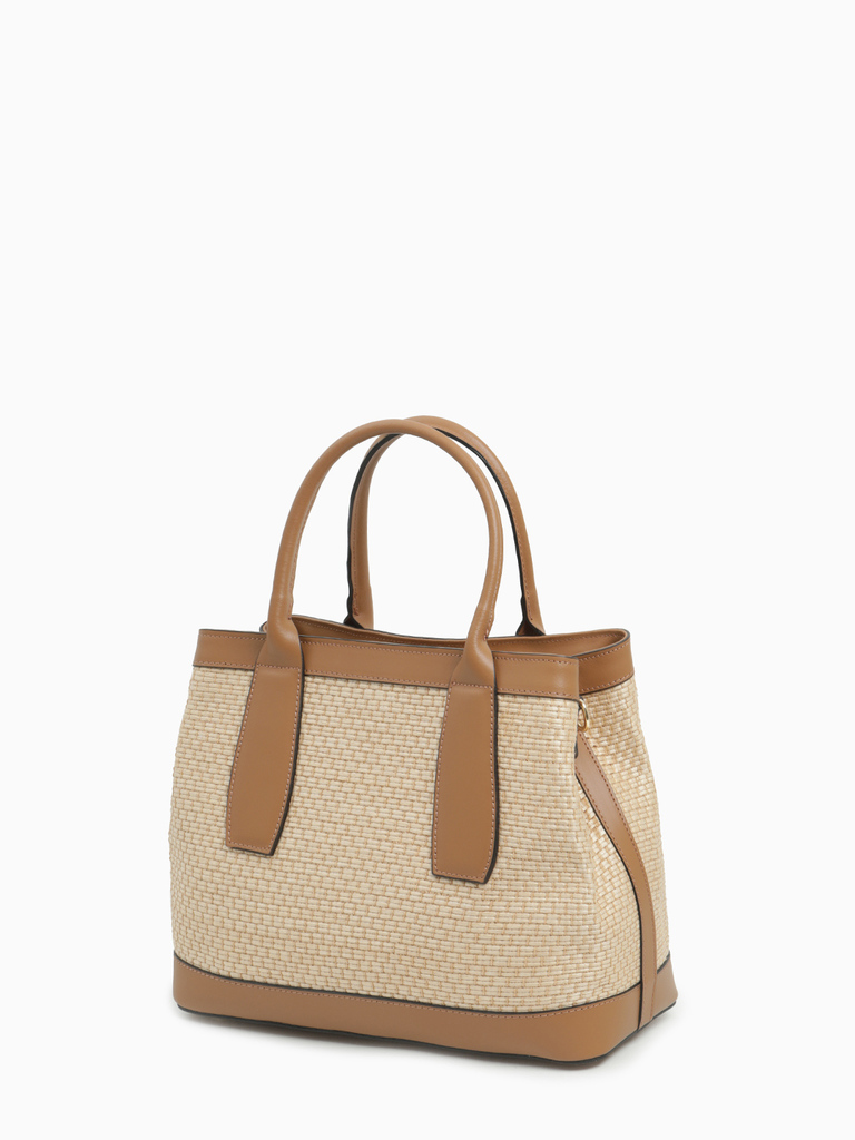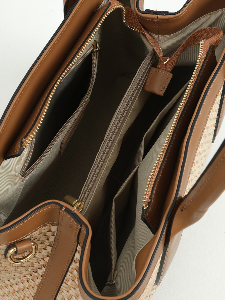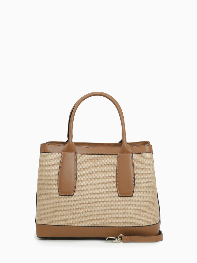 Сумка-тоут с регулируемым плечевым ремнём от BE NICE из рафии и натуральной кожи оттенка кэмел Материал: натуральная кожа / рафия Размеры: Длина по дну: 32 см Длина по верхнему краю: 29,5 см Ширина по... Показать описание дну: 14 см Высота: 26 см Общая высота с ручками: 40 см Описание: Трендовый тоут от итальянского бренда BE NICE выполнен в сочетании из натуральной кожи и соломки рафии, декорирован фирменной строчкой. Данная модель закрывается на молнию, носится на сгибе руки или в руке Внутри: центральное отделение на молнии, боковой карман на молнии, карманы для мелочей В комплекте: длинный ремень на плечо, максимальная длина - 110 см (регулируется) Производитель: BE NICE, Италия Расположение производства: Италия