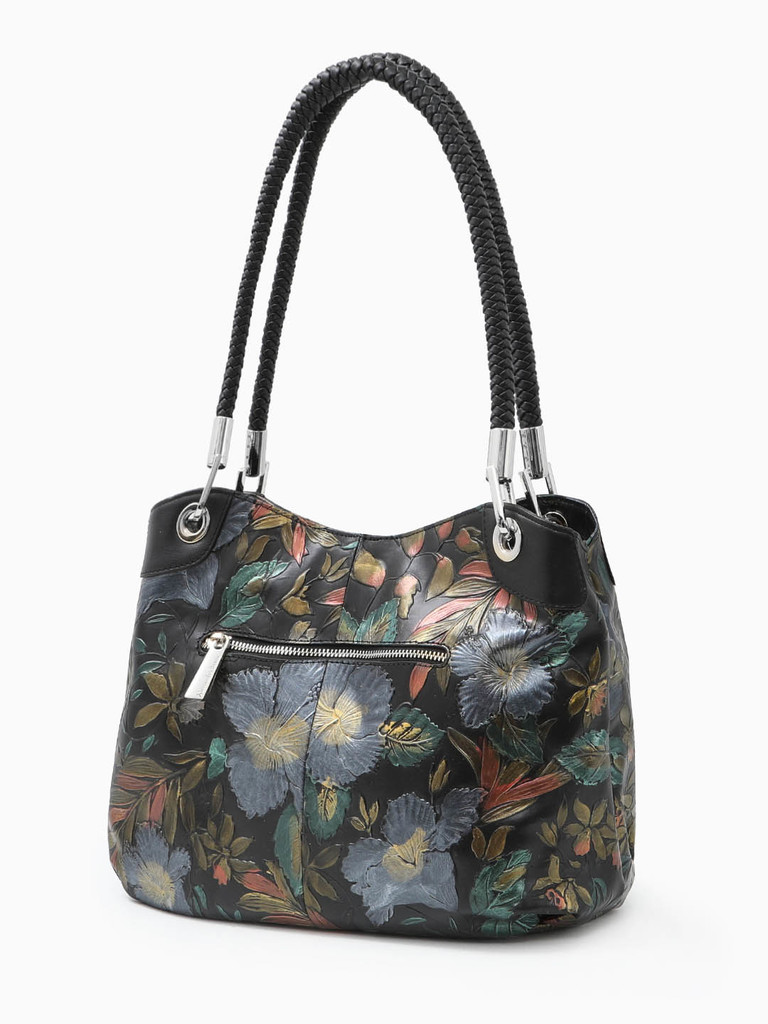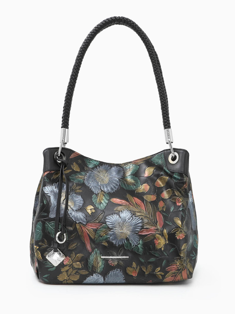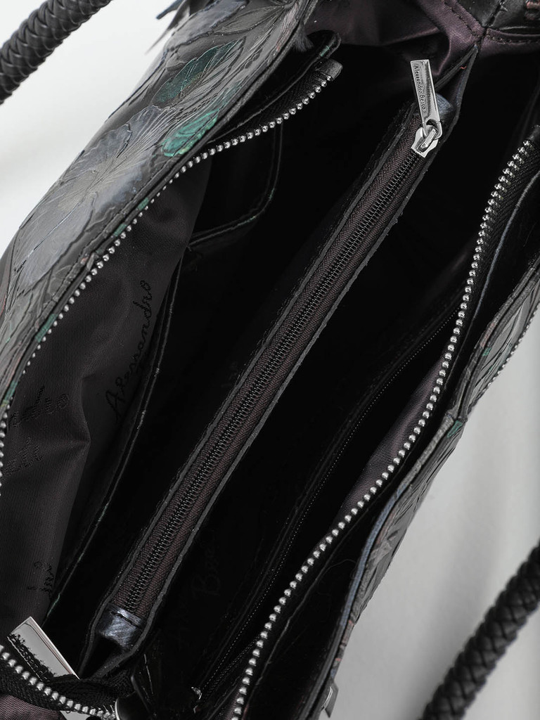 Шоппер с длинными плетёными ручками от Alessandro Beato из натуральной кожи черного цвета с объемным тиснением и цветочным принтом Длина сумки Алессандро Беато (Alessandro Beato) - 33 (30) см, ши... Показать описаниерина по дну - 15 см, высота - 27 см, общая высота - 57 см. Сумочка закрывается на молнию. Внутри центральное отделение на молнии, сбоку карман на молнии, карманы для мелочей. Снаружи сзади карман на молнии. Сумочка носится на плече.