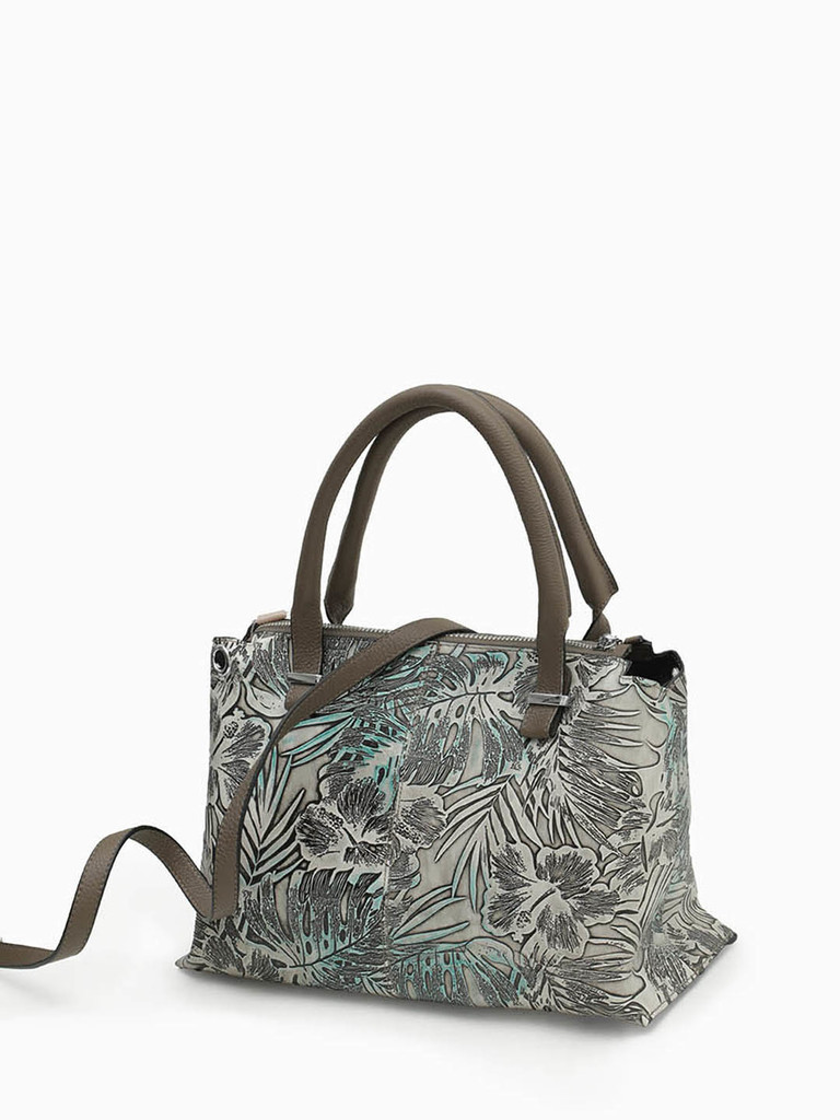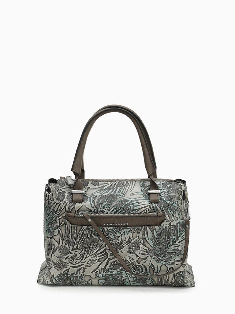 Тоут от Alessandro Beato из натуральной кожи цвета тауп с объемным тиснением и цветочным принтом Длина сумочки Алессандро Беато (Alessandro Beato) - 34 см (по дну), 30 см (по верхнему краю), шир... Показать описаниеина по дну - 13 см, высота - 23,5 см, общая высота с ручками - 39 см. Сумочка состоит из трех автономных отделений, центральное закрывается на молнию, боковые на магнитные кнопки. Внутри центральное отделение на молнии, сбоку карман на молнии, карманы для мелочей. Сумочка носится на плече, на сгибе руки или в руке. Прилагается длинный регулируемый ремешок на плечо, максимальная длина - 120 см.