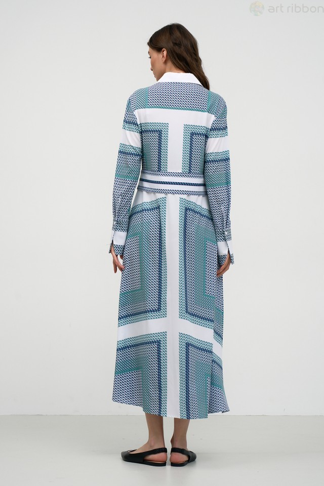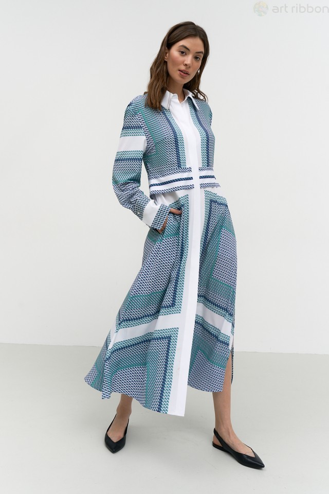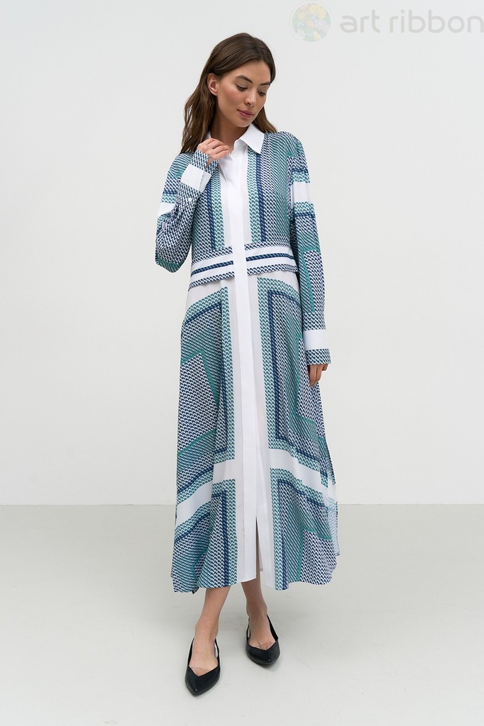 MILANO. Возможные размеры: 46-48-50-52. Платье полуприлегающего силуэта, выполнено из трикотажного полотна, с принтом. Платье с отложным воротником и застежкой на петли и пуговицы в плечевом шве. Рука... Показать описаниев спущенный, втачной. В Пройме платья обработан отделочный кант. Изделие без подкладки.. Возможно отличие фотографии по оттенку, связанное с разной цветопередачей монитора. Состав ткани:Вискоза: 70%, Полиэстер: 27%, Спандекс: 3%. Длина по центру спинки (см): 125, 125, 125, 125. По груди (см): 49, 51, 53, 55. По бедрам (см): 52, 54, 56, 58. По талии (см): 47, 49, 51, 53. Длина рукава (см): 58, 58, 58, 58. Ширина рукава (см): 17.8, 18.5, 19.2, 19.9. Ширина плеча (см): 13.1, 13.3, 13.5, 13.7. Ширина спинки (см): 37.5, 38.5, 39.5, 40.5. Подробное описание: https://artribbon.ru/m1047p-plat-e-zhenskoe.html