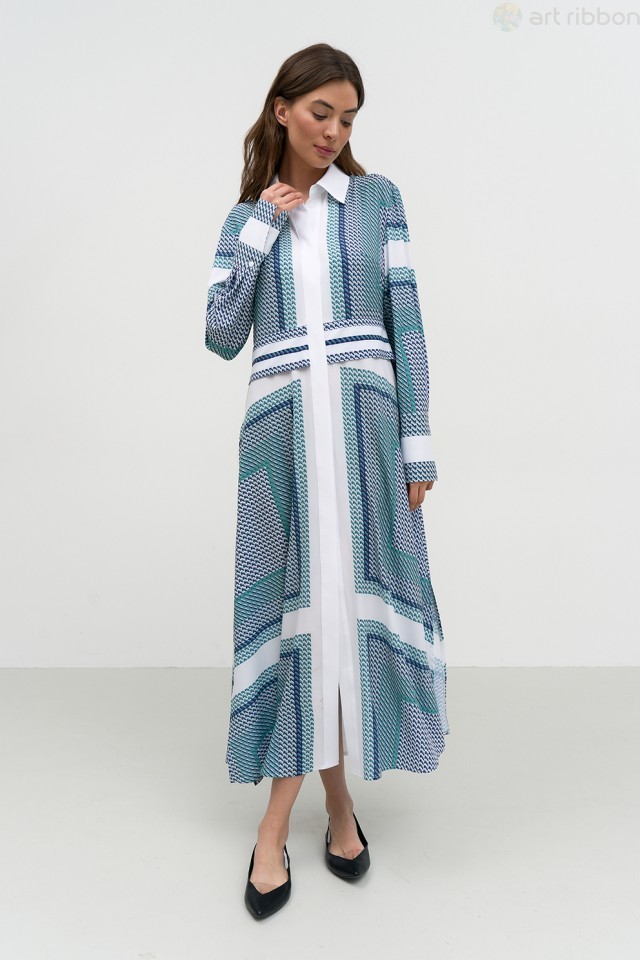 MILANO. Возможные размеры: 46-48-50-52-54. Платье полуприлегающего силуэта, выполнено из трикотажного полотна в комбинации с шелком армани. Дизайнерское сочетание принтов делает модель платья оригинал... Показать описаниеьной и яркой. Платье отрезное по линии талии. На переде обработана планка -застежка на петли и пуговицы. Воротник - стояче-отложной. Рукав длинный, втачной с манжетой. Юбка с разрезом. Изделие на подкладке. Возможно отличие фотографии по оттенку, связанное с разной цветопередачей монитора. Состав ткани:Вискоза: 70%, Полиэстер: 27%, Спандекс: 3%. Длина по центру спинки (см): 118, 118, 118, 118, 118. По груди (см): 45, 47, 49, 51, 53. По бедрам (см): 51, 53, 55, 57, 59. По талии (см): 38, 40, 42, 44, 46. Длина рукава (см): 65, 65, 65, 65, 65. Ширина рукава (см): 21.6, 22.3, 23, 23.7, 24.4. Ширина плеча (см): 9.6, 9.8, 10, 10.2, 10.4. Ширина спинки (см): 33, 34, 35, 36, 37. Подробное описание: https://artribbon.ru/m1043p-plat-e-zhenskoe.html