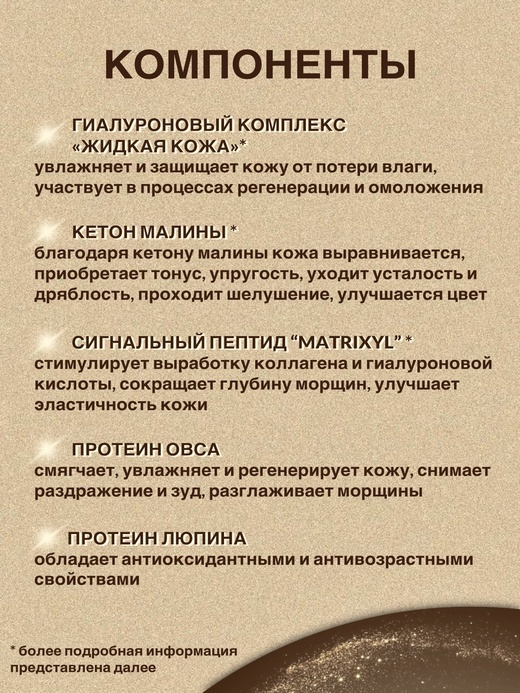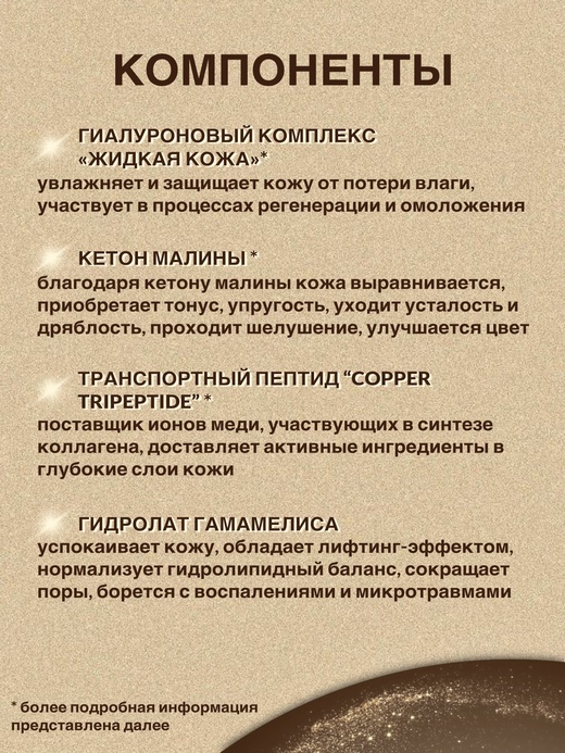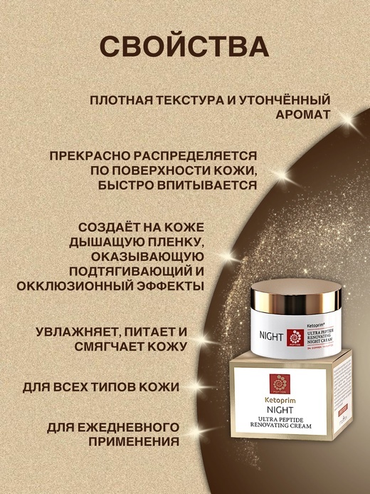 Рекомендованная розничная цена 2425 руб. Ночной реновационный ультрапептидный крем Ketoprim на основе транспортного пептида меди Copper Tripeptide, системы активного молекулярного транспорта ATMS™ и г... Показать описаниеиалуронового комплекса «Жидкая кожа» АНТИВОЗРАСТНОЙ НОЧНОЙ КРЕМ ОТ МОРЩИН KETOPRIM Ночной реновационный ультрапептидный крем Ketoprim – профессиональный продукт с мощной рабочей концентрацией «транспортного» пептида меди Copper Tripeptide, который заставляет активные компоненты крема проникнуть в самые глубокие слои кожи. «Пептид красоты» устраняет существующие морщины и предотвращает появление новых. Гиалуроновый комплекс «Жидкая кожа», органические масла энотеры (примулы вечерней) и черного тмина, содержащие Омега-3-6-9 кислоты, фито-экстракт зеленого чая, витамины А, Е, С на протяжении всей ночи оказывают омолаживающее и питающее действие, делая кожу здоровой, свежей и отдохнувшей. ОСОБЕННОСТИ ПРОДУКТА Ночной реновационный крем Ketoprim разработан с таким расчетом, чтобы все его активные компоненты являлись «помощниками» в действии друг для друга. Кремовая база из редких, ценных масел макадамии, кукуи, энотеры (примулы), черного тмина – сама по себе является премиальным продуктом. А наличие пептида-поставщика ионов меди, необходимых для активного синтеза компонентов внеклеточного матрикса кожи (эластина и коллагена), а так же ряда фито-экстрактов, витаминов и активных антивозрастных компонентов, делают ночной крем незаменимой «палочкой-выручалочкой». Такая эффективность обусловлена уникальной системой активного молекулярного транспорта ATMS™. Пептиды и антивозрастные компоненты имеют кумулятивное действие, поэтому максимальный эффект достигается при постоянном, регулярном использовании продукта, хотя первый зримый эффект может быть уже после первых применений крема. У крема нейтральный рН 5,5. Продукт не содержит парабенов, ПАВ, продуктов животного происхождения. Подходит для всех типов кожи. ПОТРЕБИТЕЛЬСКИЕ СВОЙСТВА Крем имеет утонченный, быстро исчезающий аромат, не раздражающий обоняние во время ночного отдыха. Текстура крема плотная за счет большого количества природных масел и гиалуроновой кислоты. Хорошо распределяется по поверхности кожи, быстро впитывается. После впитывания кожа становится увлажненной, приятной и мягкой на ощупь. При нанесении второго слоя крема может образоваться незаметная дышащая пленка, которая помимо лифтинга будет иметь окклюзионный эффект, необходимый при уходе за зрелой и возрастной кожей. СИСТЕМА АКТИВНОГО МОЛЕКУЛЯРНОГО ТРАНСПОРТА ATMS™ ATMS™ (Active Transporting Molecular System) – собственная уникальная разработка Ketoprim, служит для усиления проникновения активных ингредиентов косметических средств в глубокие слои кожи, преодолевая трудно проницаемый роговой слой. Это позволяет в разы увеличить эффективность активной косметики, а так же использовать невысокие концентрации потенциально аллергенных фито-компонентов. Благодаря системе ATMS™ все продукты Ketoprim гипоаллергенны и во много раз более эффективны по сравнению с пептидными аналогами других брендов, использующих те же пептиды, но без «умной» транспортной системы. СПОСОБ ПРИМЕНЕНИЯ Нанести на чистую, тонизированную, сухую кожу лица и шеи, распределить тонким слоем, дать впитаться. Не втирать. Наилучший эффект достигается при ежедневном п