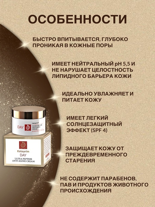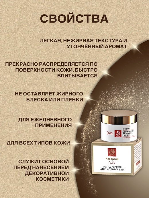 Кетоприм® Пептид – современная косметика с активными молекулами и уникальной мульти-системой трансдермальной доставки их в кожу ATMS™ < Active Transporting Multi-System >. Исключительно эффективная антивозрастная формула на основе пептидов красоты и витаминов пробуждает кожу, наполняет ее жизненной силой, возвращает молодость и свежесть. Достигнутый эффект придает лицу здоровый, ухоженный вид, черты лица становятся более четкими и выразительными, а овал – более подтянутым.