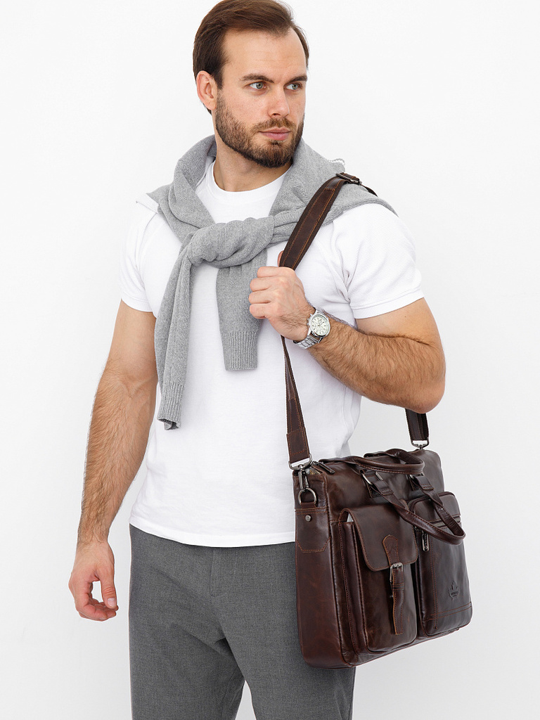 Ширина (см): 8. Длина (см): 34. Высота (см): 28. Вес (г): 950. Бренд: Tough Ryder. Материал: Натуральная кожа. Мужской портфель выполнен из натуральной кожи. Дополнен  фурнитурой темное сере... Показать описаниебро или матовое золото. Данная модель закрывается на молнии. Каркас полужесткий. Носится в руке за встроенные ручки или на плече. В комплекте имеется съемный ремень-стропа с регулировкой длины. Внутри: подкладочная ткань. На боковых частях карман на молнии и без. Снаружи: два отдела закрываются на молнии. На передней части и задней карманы на молниях. Подробное описание: https://www.sumka-style.ru/catalog/muzhskie/sumki/portfeli/1811-tough-ruder-/offer/21951/