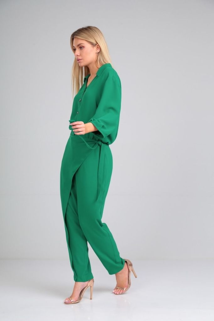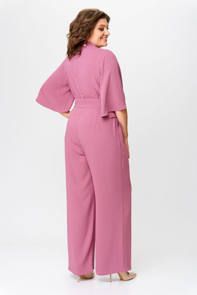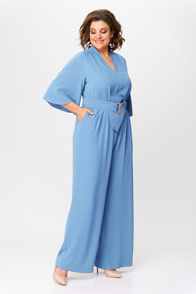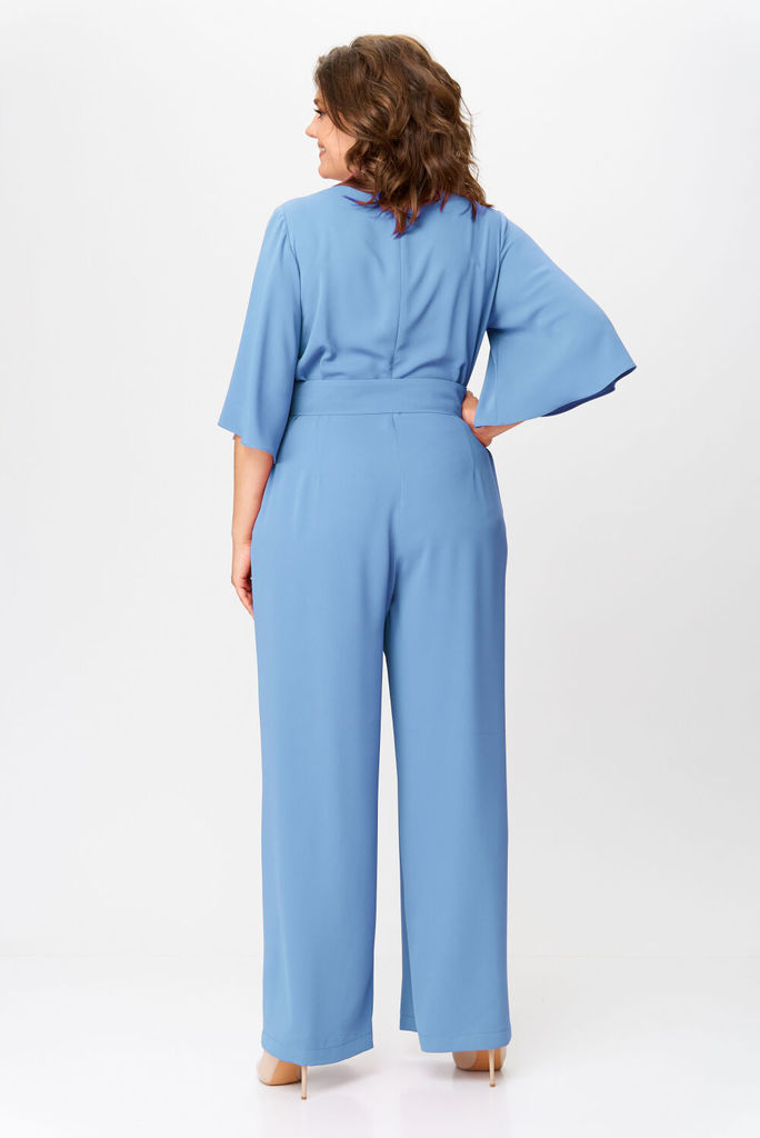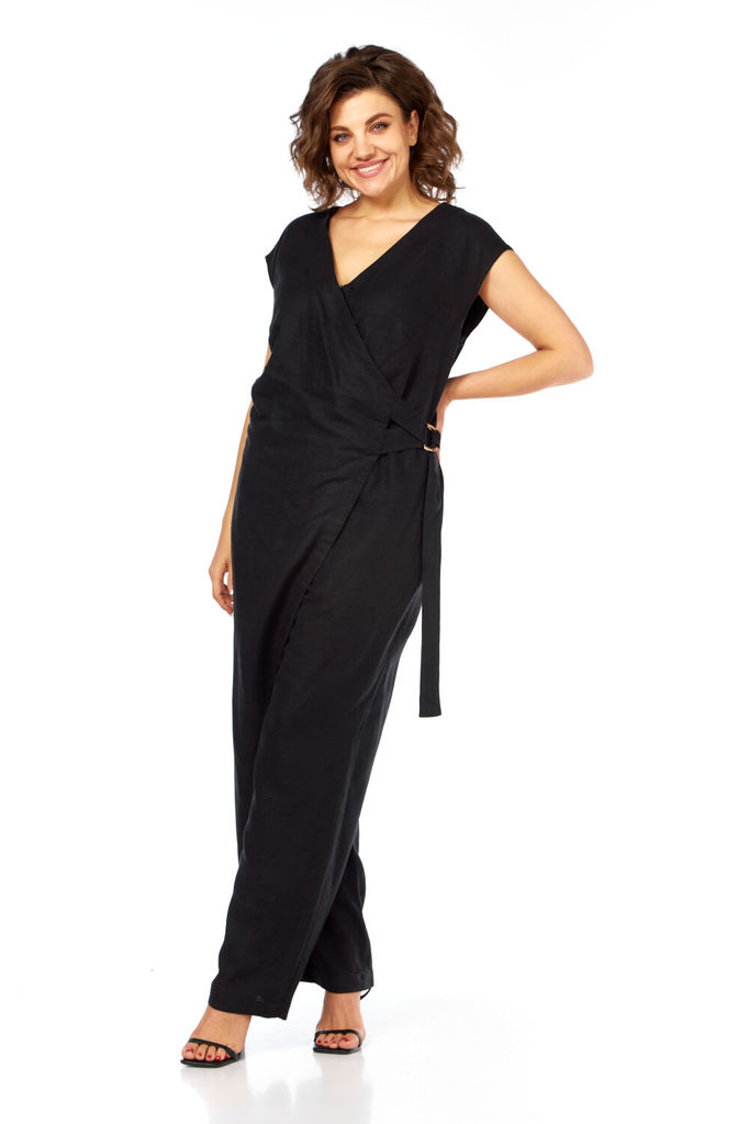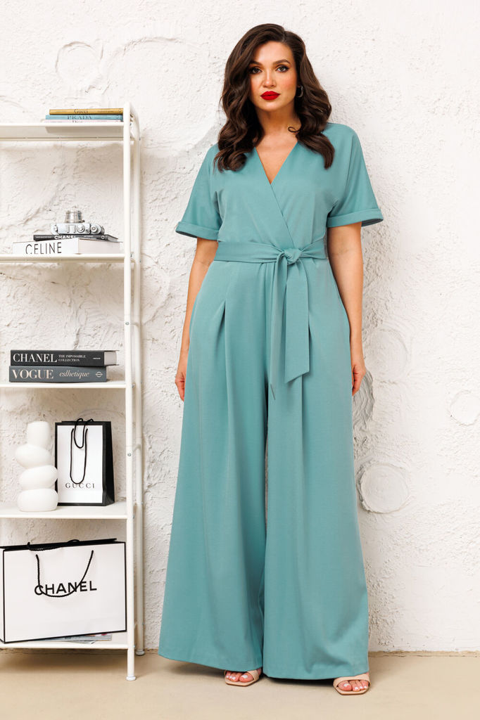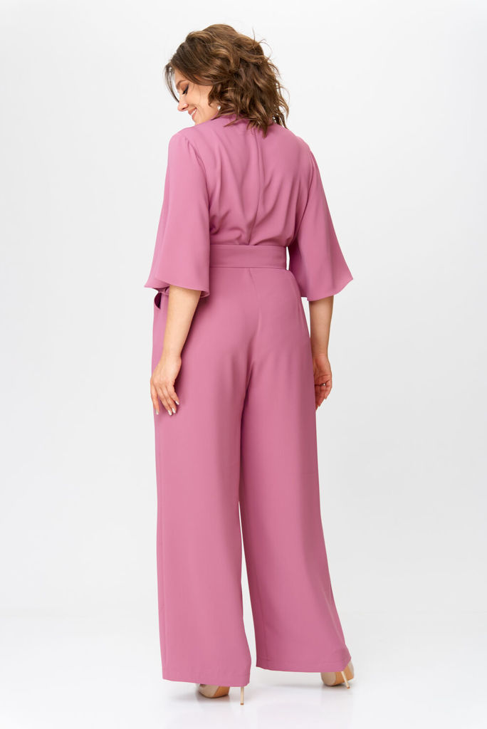 Состав: Вискоза-18%; ПЭ-80%; Спандекс-2%; Комбинезон женский отрезной по линии талии, со спущенной линией плеча понизу с отделочной тесьмой «бахрама», с притачным поясом и съёмным завязывающимся поясо... Показать описанием по линии талии. С застёжкой по среднему шву спинки на потайную молнию. Лиф переда на запах. Лиф спинки с талевыми выточками. Брюки расширенного силуэта, передние части с косыми боковыми карманами, задние с талевыми выточками.