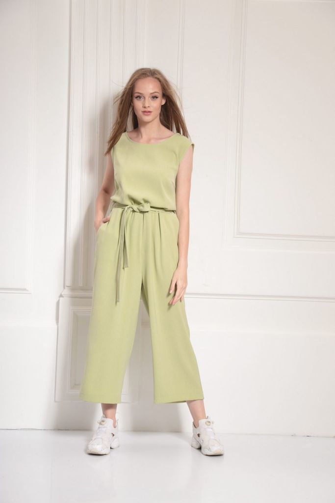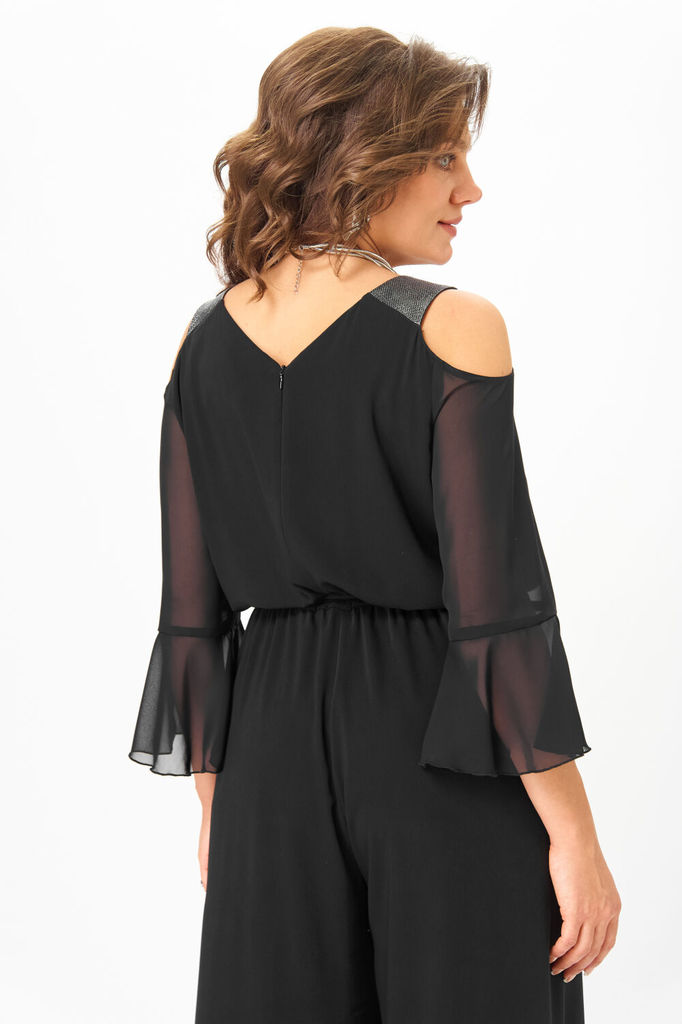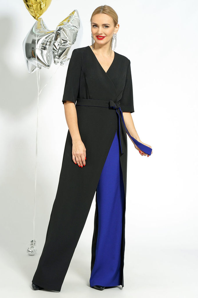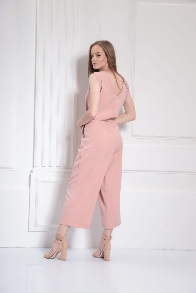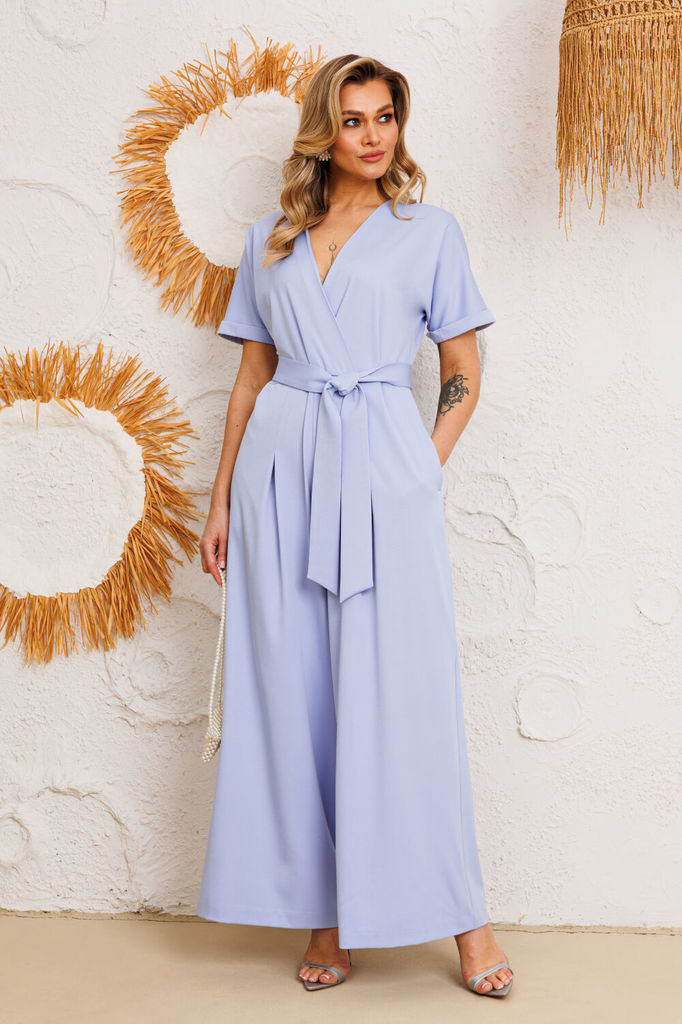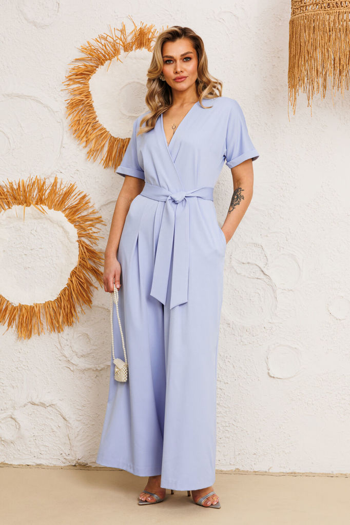 Состав: Вискоза-18%; ПЭ-80%; Спандекс-2%; Комбинезон женский отрезной по линии талии, со спущенной линией плеча понизу с отделочной тесьмой «бахрама», с притачным поясом и съёмным завязывающимся поясо... Показать описанием по линии талии. С застёжкой по среднему шву спинки на потайную молнию. Лиф переда на запах. Лиф спинки с талевыми выточками. Брюки расширенного силуэта, передние части с косыми боковыми карманами, задние с талевыми выточками.