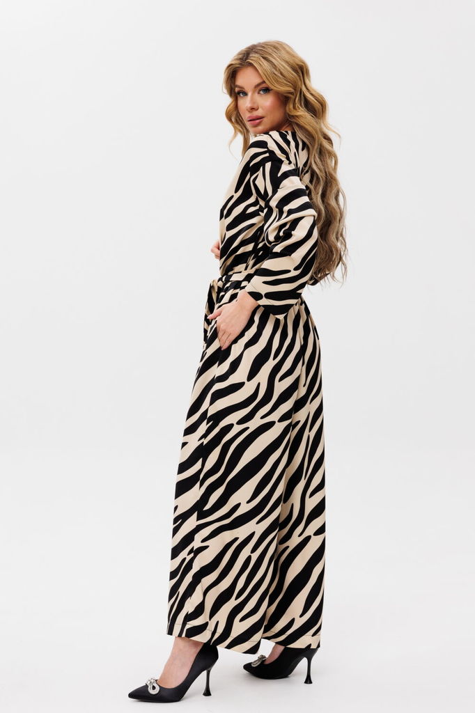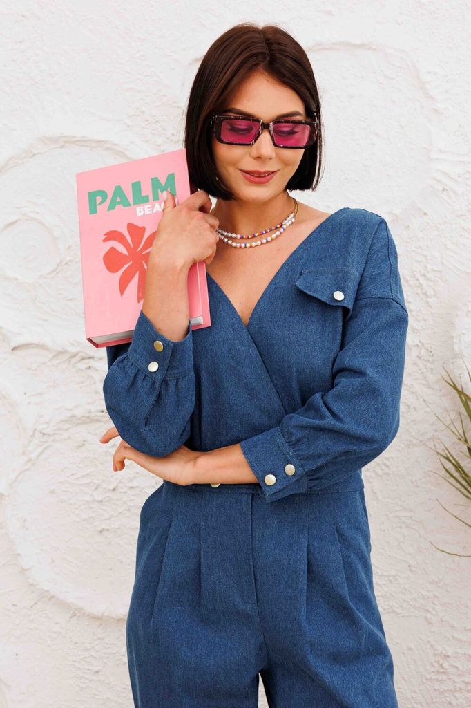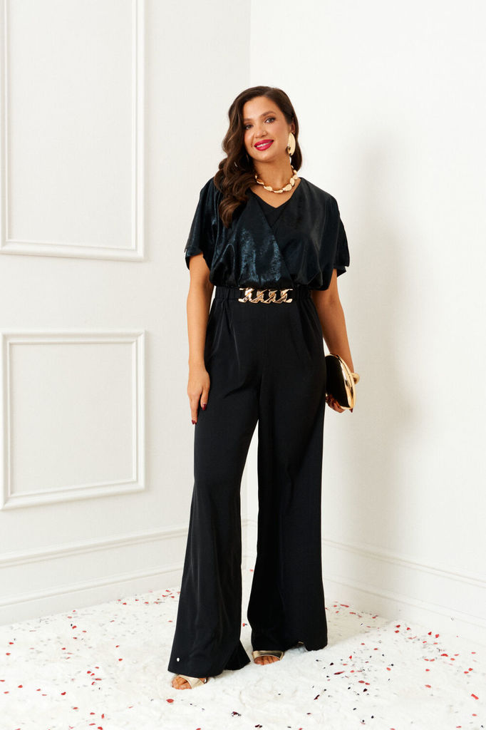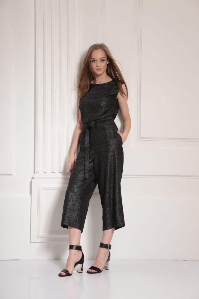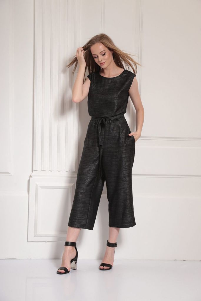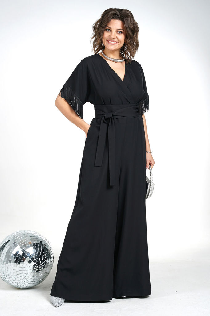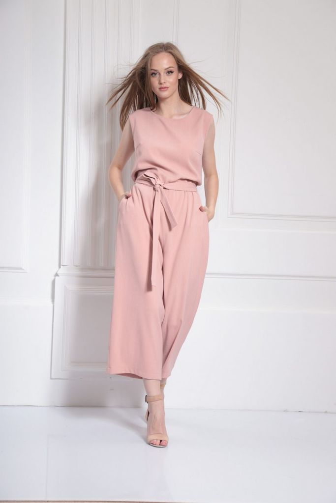 Состав: Вискоза-18%; ПЭ-80%; Спандекс-2%; Комбинезон женский отрезной по линии талии, со спущенной линией плеча понизу с отделочной тесьмой «бахрама», с притачным поясом и съёмным завязывающимся поясо... Показать описанием по линии талии. С застёжкой по среднему шву спинки на потайную молнию. Лиф переда на запах. Лиф спинки с талевыми выточками. Брюки расширенного силуэта, передние части с косыми боковыми карманами, задние с талевыми выточками.