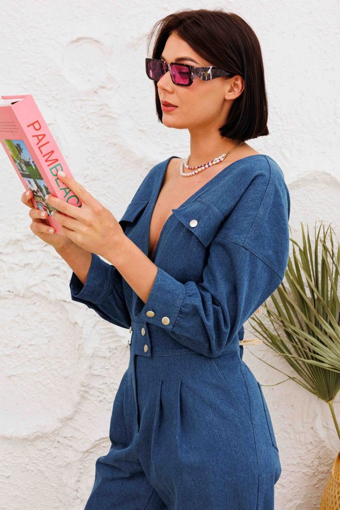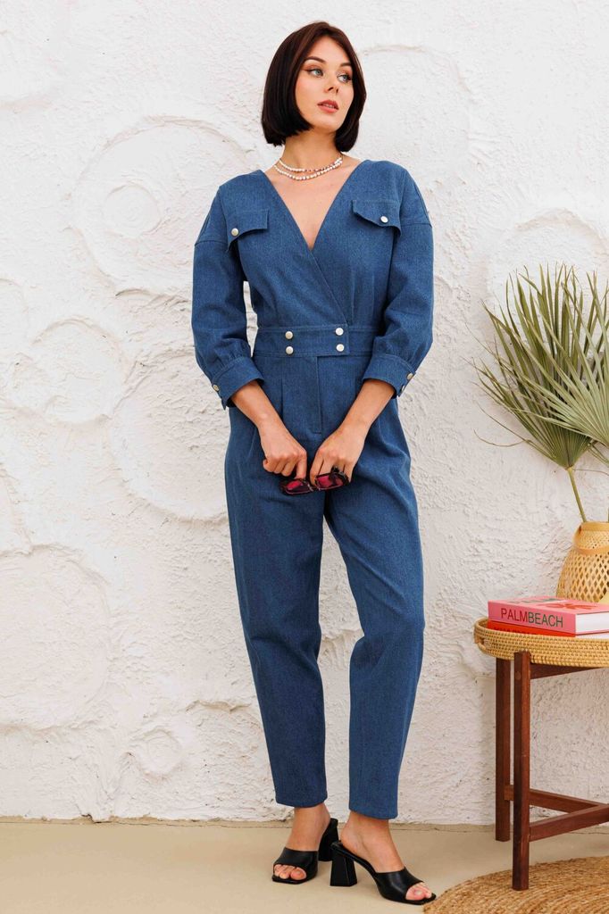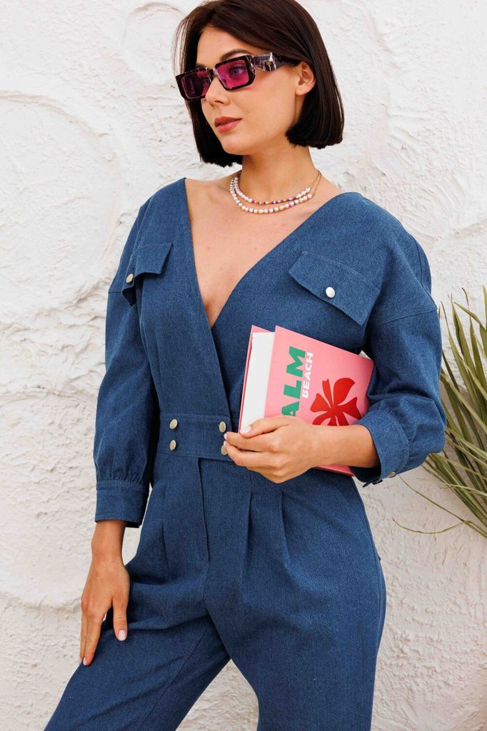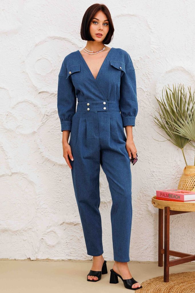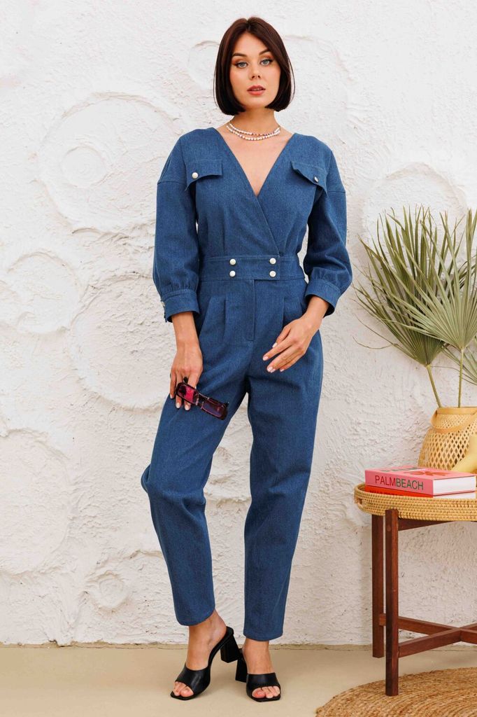 Состав: Хлопок-100%; Комбинезон выполнен из денима лиф по переду и спинке имеет v-образный вырез, с обработанными на запах деталями. пояс притачном с застежкой на пуговицы, обработан гульфик с молнией... Показать описание. По передним половинкам брючин в области поясаобработаны застроченные складки. В боковых швах обработаны карманы, по задним пловинкам брючин - накладные карманы. По лифу ткже обработаны клапаны с застежкой на пуговицы. плечевой шов спущен, рукав укорочен, с обработанной манжетой с застежкой на пуговицы