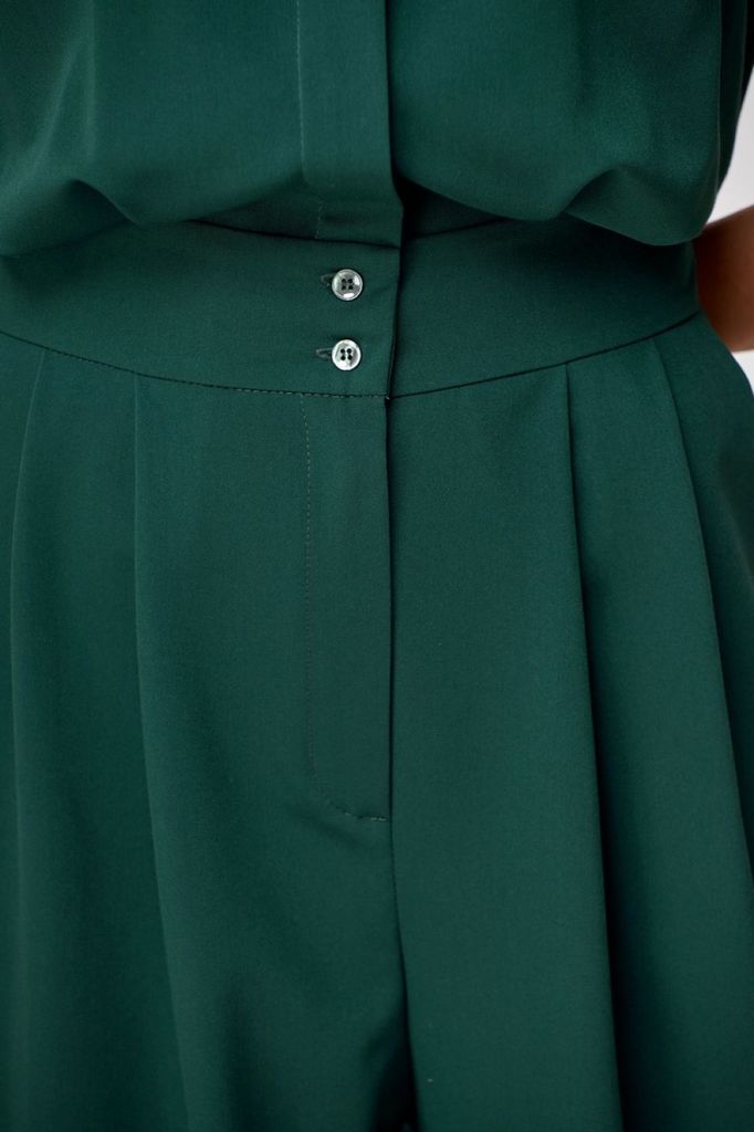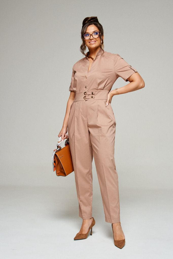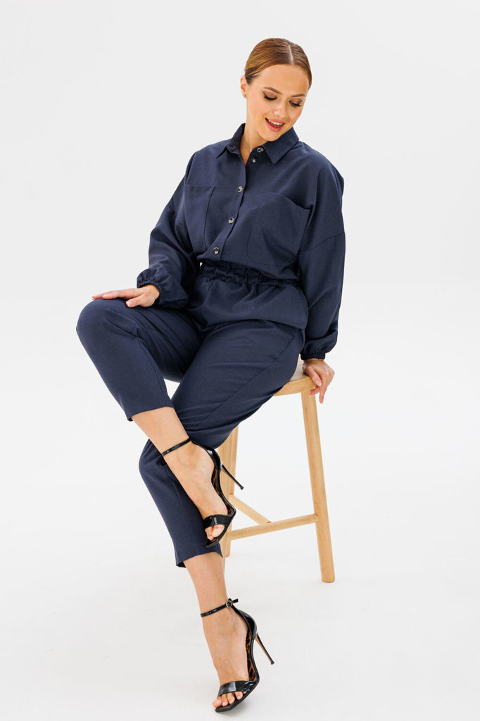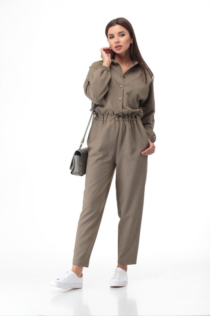 Состав: ПЭ-27%; Хлопок-71%; Эластан-2%; Обстоятельства, когда кажется, что нечего надеть, легко меняет хлопковый комбинезон. Строгий и свободный крой, классическая цветовая палитра стиля «милитари» - ... Показать описаниевсё, что необходимо для комфорта и уверенности! Комбинезон полуприлегающего силуэта из смесового полотна с хлопком. Лиф переда из двух частей с нагрудной вытачкой от бокового шва и мягкими складками от пояса. В верхней части переда выполнена двойная кокетка, переходящая на спинку. Спинка разрезная по среднему шву, с мягкими складками от пояса на талии. Рукав одношовный втачной короткий. По низу выполнена пата-пагон с фиксацией на пуговицу. Комбинезон отрезной по линии талии. На втачном поясе выполнены декоративные элементы-люверсы. V-образный вырез горловины оформлен классическим воротником-стойкой. Брюки комбинезона свободные, длиной до щиколотки, слегка заужены к низу. Спереди с мягкими складками, сзади с вытачками на талии от пояса. В боковых швах вверху выполнены функциональные карманы. Застёжка центральная по лифу на две петли и пуговицы, по брюкам на молнию. На поясе застёжка со смещением с помощью люверсов и пат-хлястиков на петли и пуговицы. Длина верхней части (по среднему шву спинки с воротником) ~ 39-40 см. Длина рукава ~ 24-25 см. Длина брючины (по боковому шву с поясом) ~ 105 см. № наименование измерения (см) размер доп. откл 46 48 50 52 КОМБИНЕЗОН: 1 Ширина изделия по груди (вдвое сложенном виде) 51 53 55 57 +1 2 Ширина изделия по талии (вдвое сложенном виде) 39 41 43 45 +1 3 Ширина изделия по бедрам (вдвое сложенном виде) 55 57 59 61 +1 4 Ширина плеча 12,6 12,8 13 13,2 +0,5 5 Ширина спинки (в самом узком месте) 40 41 42 43 +1 6 Длина изделия по середине спинки (до талии без воротника) 36 36,5 36,5 37 +1 7 Ширина рукава (вдвое сложенном виде) 18,5 19,2 19,8 20,5 +1 8 Длина рукава 24 24,5 25 25,5 +1 9 Длина брюк по боковому шву (без пояса) 97 97 97 97 +2 10 Длина брюк по шаговому (внутреннему) шву 71 70,5 70 69,5 +1,5 11 Ширина брюк по низу (вдвое сложенном виде) 18,5 19 19,5 20 +0,5 12 Обхват бедра (вдвое сложенном виде) 34 35 36 37 +1
