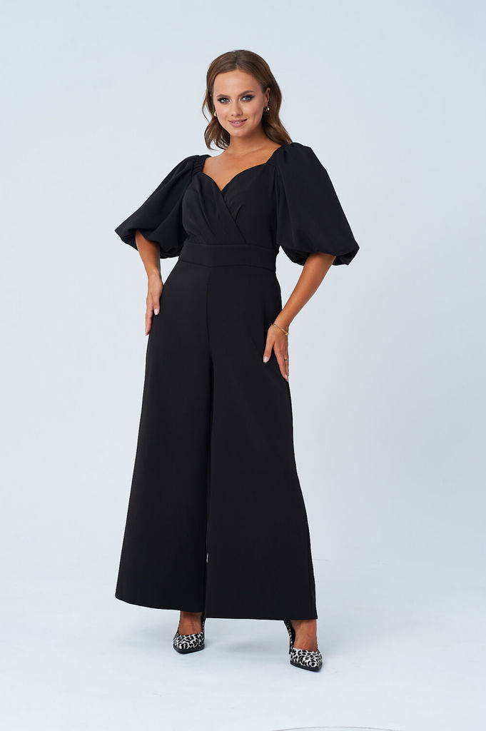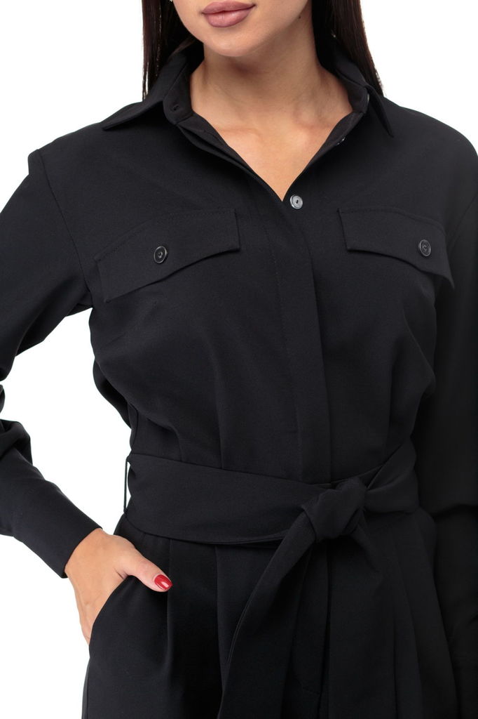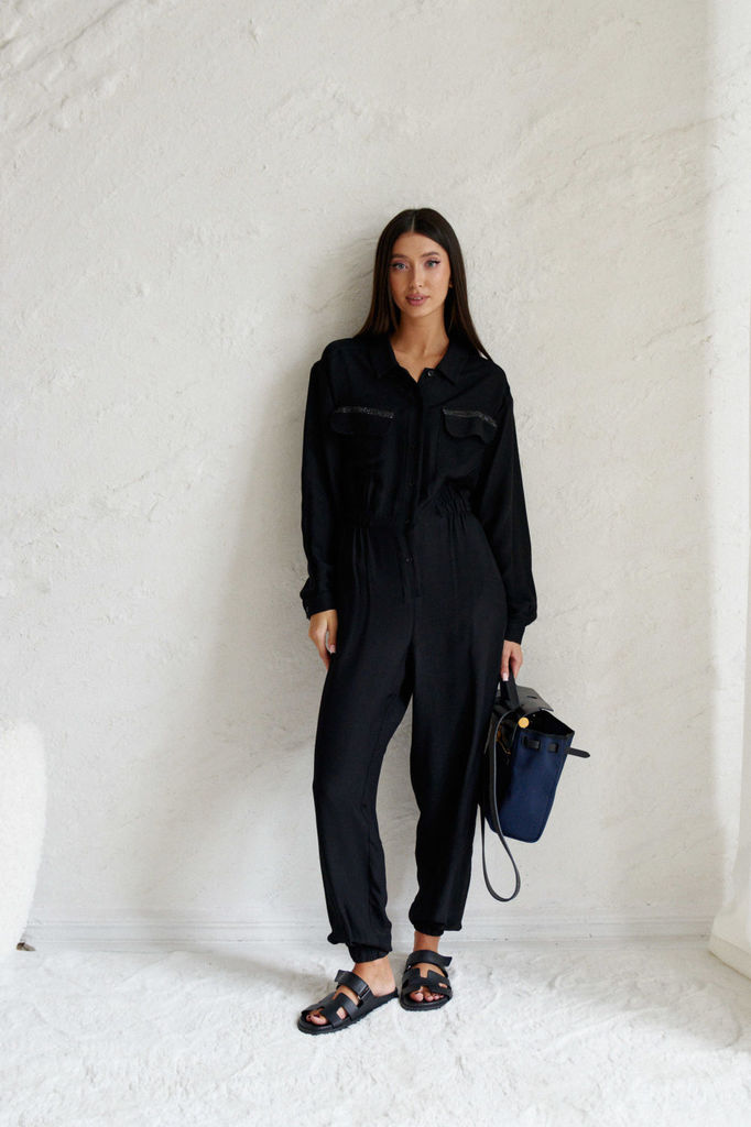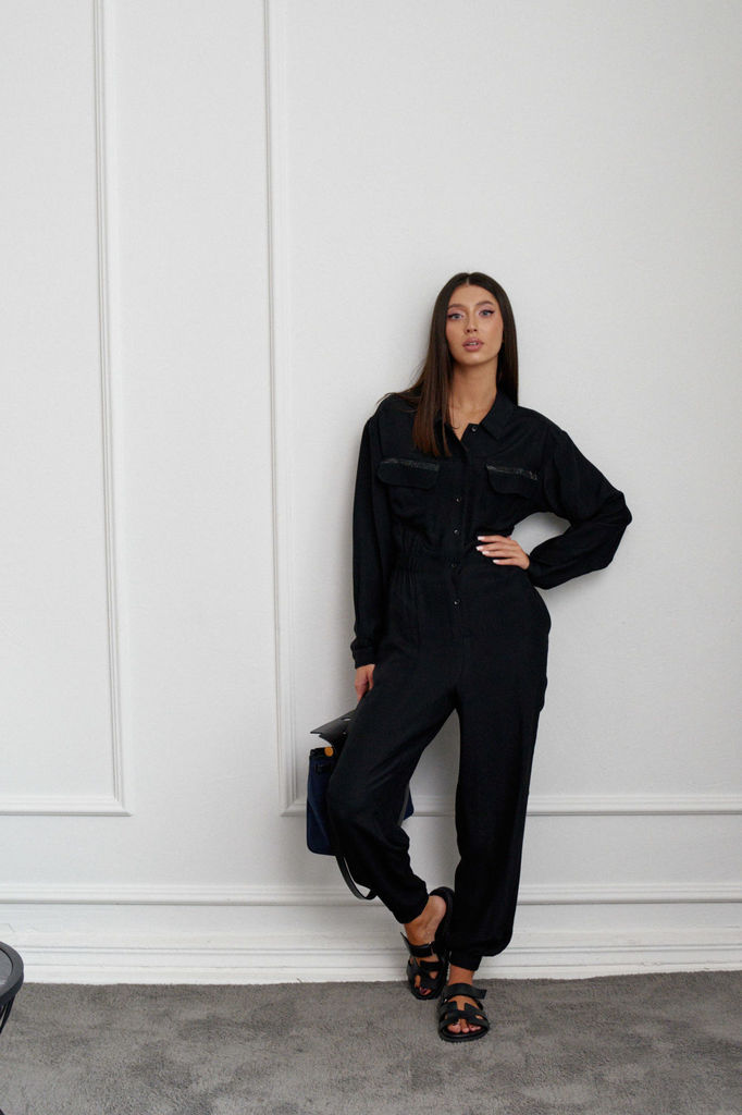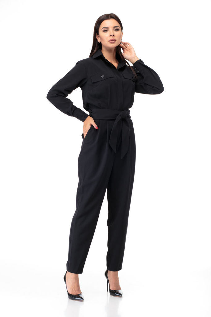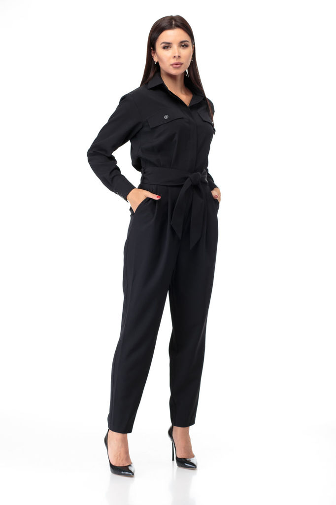 Состав: Вискоза-38%; ПЭ-62%; Комбинезон выполнен из полотна черного цвета. Комбинезон - яркий стильный образ, подойдет под низкий ход, высокий каблук, ботинки. Характеристики: полуприлегающий силуэт, ... Показать описаниеотрезной, отложной воротник, застежка центральная на планке на петли пуговицы, рукав втачной по низу рукава манжета на пуговичке, по переду крупные карманы с клапаном, по лини талии резинка, по заднему полотну имитация карманов с клапанами. Клапаны карманов украшены мелкими стразами. Низ брюк в изделии заканчивается резинкой. Длина по спинке 149, длина рукава 80 от края горловины.