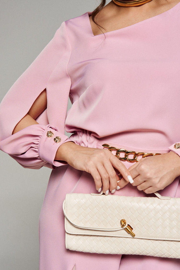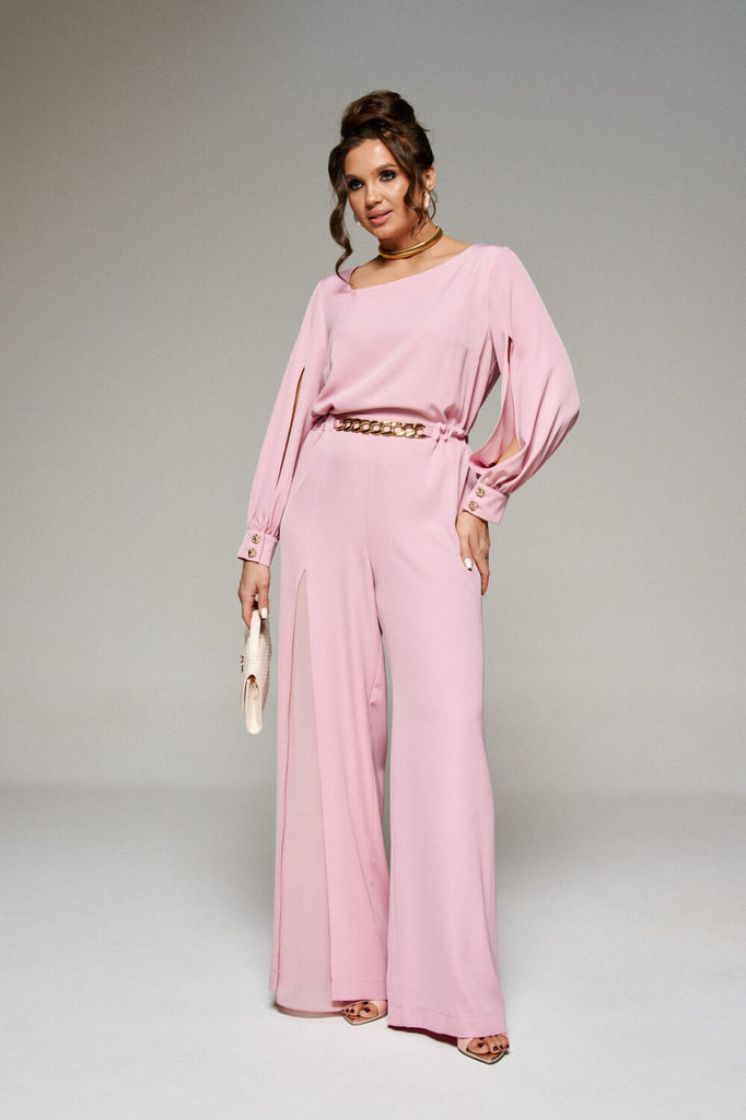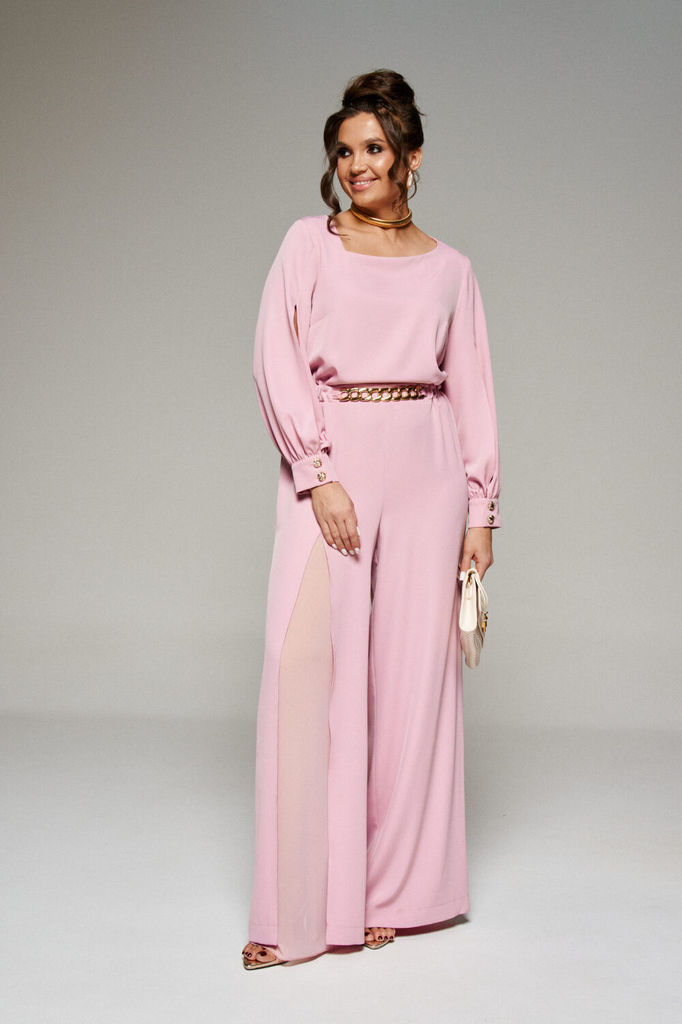 Состав: Комбинезон: Вискоза-15%; ПЭ-85%; Комбинезон: Вискоза-25%; ПЭ-75%; Это не только красивый, нарядный, но и очень практичный предмет гардероба. Соединение в одно целое женских брюк и верха, являе... Показать описаниется чрезвычайно функциональным решением. Комбинезон изготовлен из 2-х видов материала: лёгкого смесового полотна и шифоновой ткани. Предлагаемая модель свободного кроя. Передняя верхняя часть с нагрудными вытачками от бокового шва. Задняя верхняя часть комбинезона разрезная по среднему шву с вытачками на уровне талии и с потайной застежкой молнией от верха через пояс по задней части брюк. Рукав втачной длинный одношовный с декоративными разрезами спереди, в нижней части рукава мягкая сборка, заканчивается манжетой с застежкой на две петли и декоративные пуговицы. Горловина фигурная асимметричная, обработана обтачкой. Комбинезон отрезной по линии талии. Спереди подрезная планка шириной около 4 см с декоративным элементом «золотая цепь». Для удобства прилегания в боковые участки вставлена эластичная тесьма. Брюки комбинезона прямые, широкие, в стиле «палаццо» с мягкой сборкой от пояса. Справа верхняя передняя половинка разрезная по центру: от уровня бедер до низа обработан разрез, из-под которого выглядывает внутренняя отделочная деталь из шифона. Левая половинка брюк комбинезона цельная. Сзади по брюкам комбинезона от пояса расположены вытачки. Длина верхней части (по среднему шву спинки до пояса) – 40 см. Длина рукава – 61,5 см. Длина брюк (по боковому шву с поясом) –113 см. № наименование измерения (см) размер доп. откл 46 48 50 52 КОМБИНЕЗОН: 1 Ширина изделия по груди (вдвое сложенном виде) 51 53 55 57 +1 2 Ширина изделия по талии (вдвое сложенном виде с/без учета резинки) 36/ 49 38/ 51 40/ 53 42/ 55 +1 3 Ширина изделия по бедрам (вдвое сложенном виде) 54 56 58 60 +1 4 Ширина плеча 6,5 6,7 6,9 7,1 +0,5 5 Ширина спинки (в самом узком месте) 40 41 42 43 +0,5 6 Длина изделия по среднему шву спинки (до талии) 40 40 40 40 +1 7 Ширина рукава вверху (вдвое сложенном виде) 20 21 22 23 +0,5 8 Длина рукава 61,5 61,5 61,5 61,5 +1,5 9 Длина брюк по боковому шву (без пояса) 109 109 109 109 +2 10 Длина брюк по шаговому (внутреннему) шву 81,5 81,2 80,8 80,5 +2 11 Ширина брюк по низу (вдвое сложенном виде) 36 36,5 37 37,5 +1 12 Обхват бедра (вдвое сложенном. виде) 36,5 37,5 38,5 39,5 +1