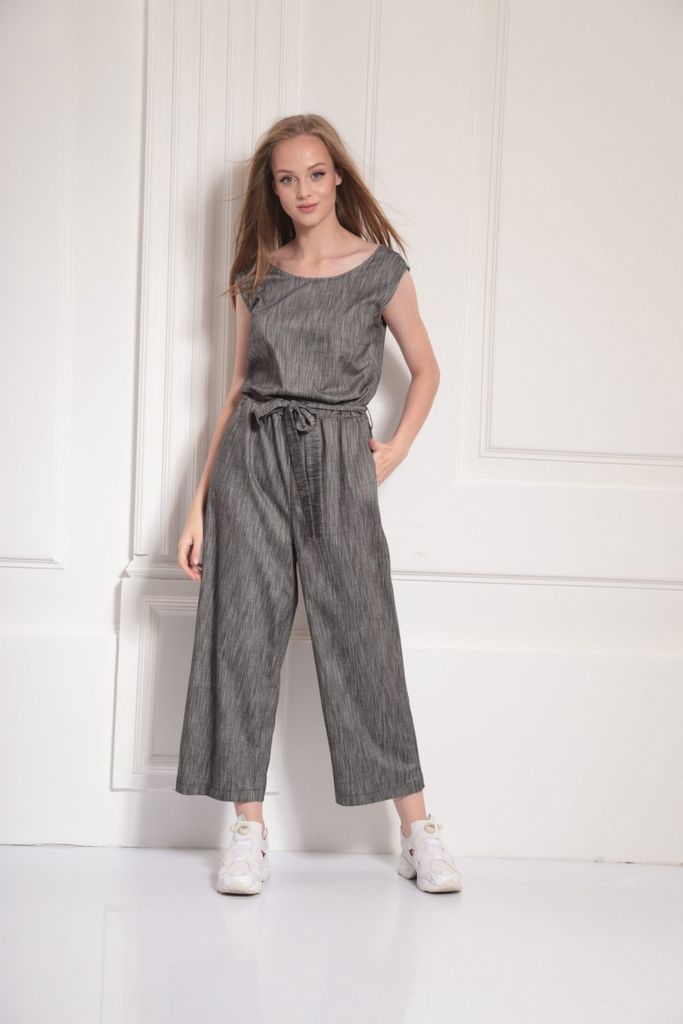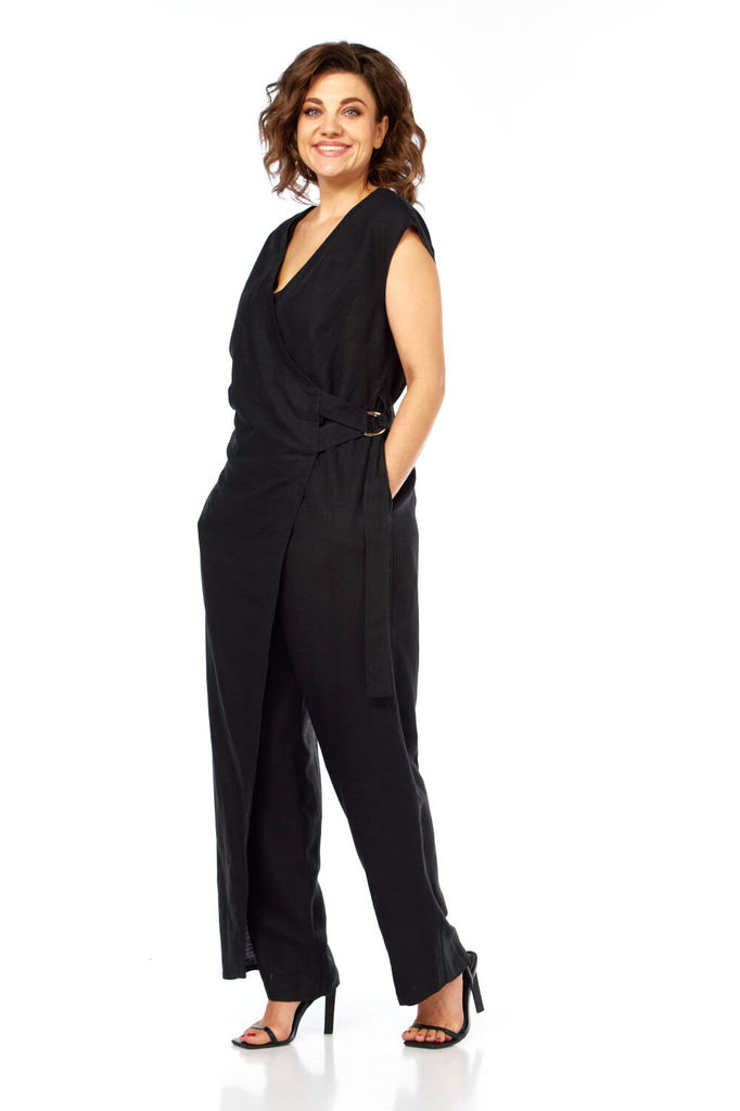 Состав: Вискоза-47%; Лён-53%; Комбинезон женский с центральной застежкой на потайную молнию и отлетной частью на запах с хлястиком и полукольцами. Задние половинки собраны на резинку в области талии. ... Показать описаниеПередние воловинки с нагрудными вытачками и резинкой в области талии + шлевки. В боковых швах обработаны карманы. Ширина по талии регулирется поясом, который вставлен в правый боковой шов. В области правого кармана отделка в виде металлической подвески. По краю борта отлетной чатси отделочная строчка на 3 см. Длина до талии 40 см, длина брючины от талии до низа по боковому шву 107 см