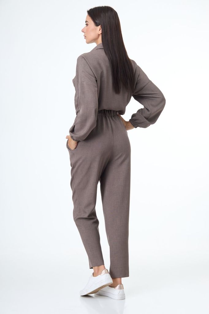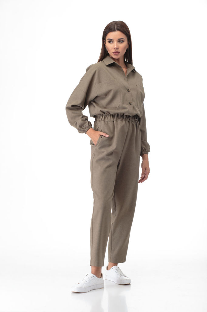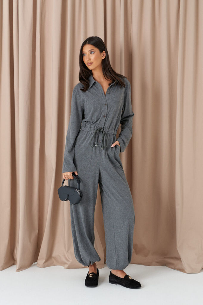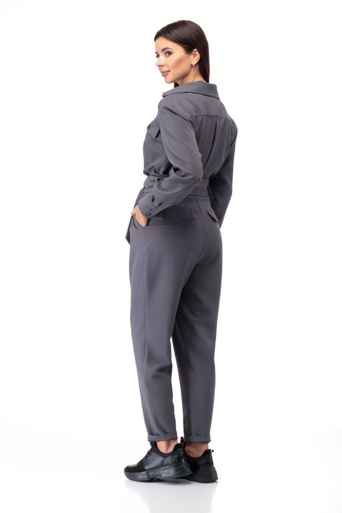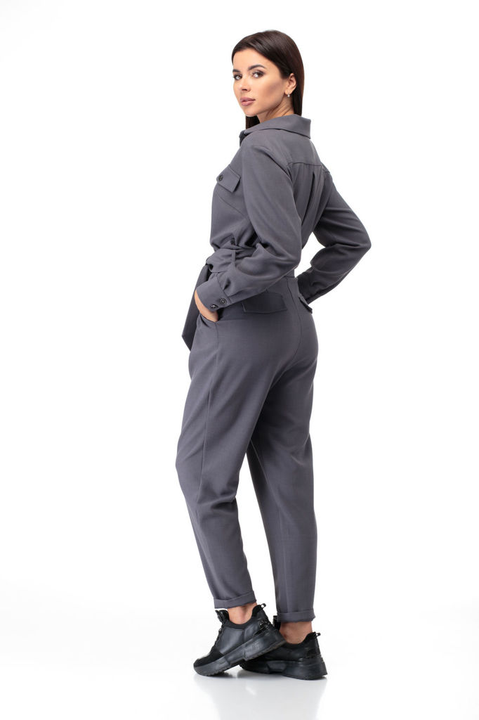 Комбинезон свободного кроя. Выполнен из трикотажа серого цвета. Без подкладки. Вырез горловины круглый. Воротник стойка. Застёжка центральная - пуговицы. Рукав втачной, спущенный, с манжетом на резинк... Показать описаниее. Пояс на резинке. Брюки с манжетом на резинке. В брючинах наклонные карманы. Длина спинки верха 38 см. Длина рукава (от линии втачивания) 60 см. Длина бокового шва брючины (с учётом пояса) 109 см