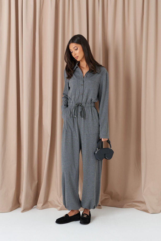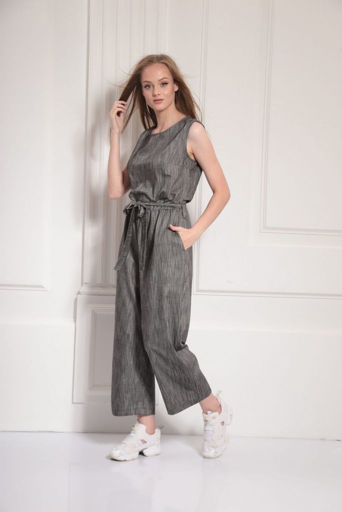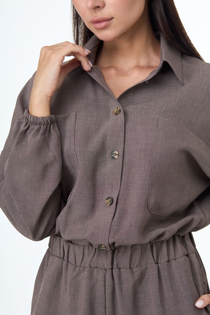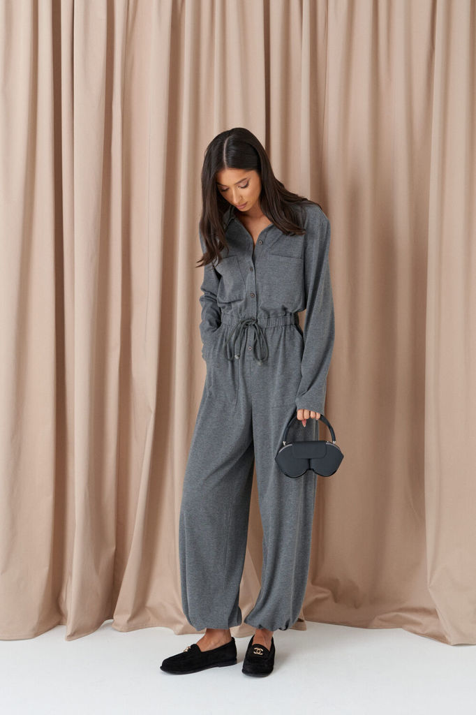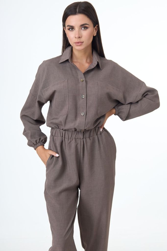 Комбинезон свободного кроя. Выполнен из трикотажа серого цвета. Без подкладки. Вырез горловины круглый. Воротник стойка. Застёжка центральная - пуговицы. Рукав втачной, спущенный, с манжетом на резинк... Показать описаниее. Пояс на резинке. Брюки с манжетом на резинке. В брючинах наклонные карманы. Длина спинки верха 38 см. Длина рукава (от линии втачивания) 60 см. Длина бокового шва брючины (с учётом пояса) 109 см