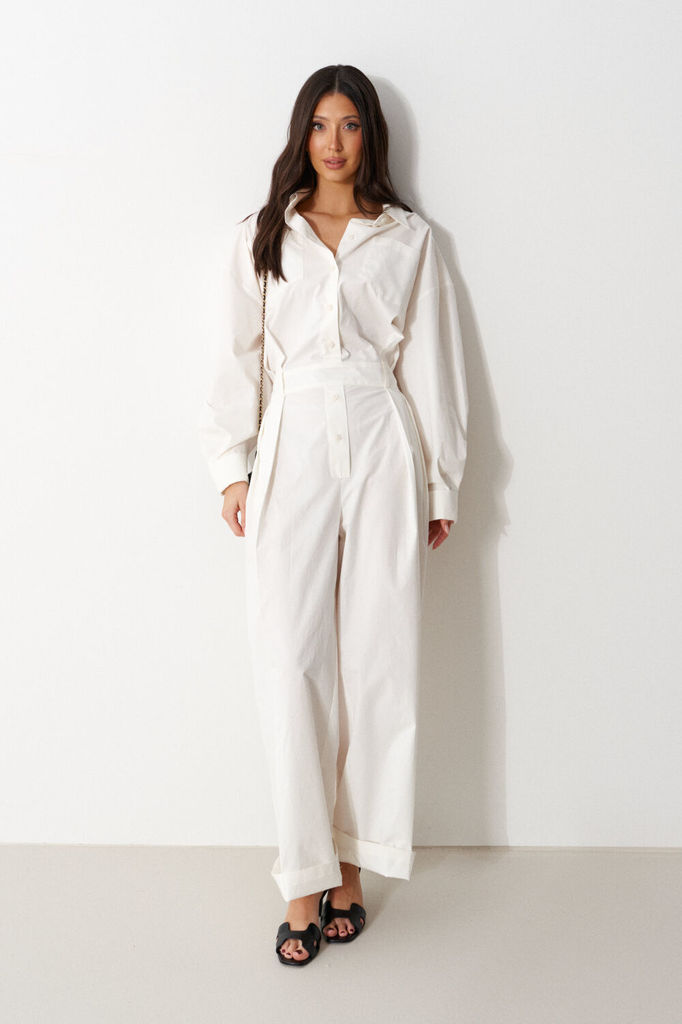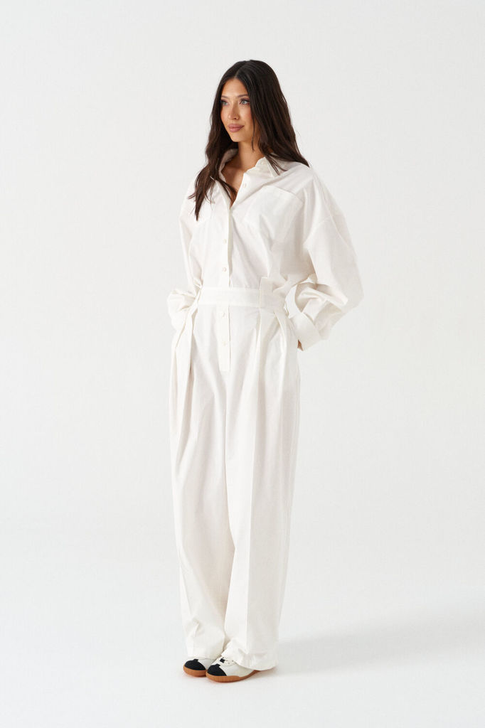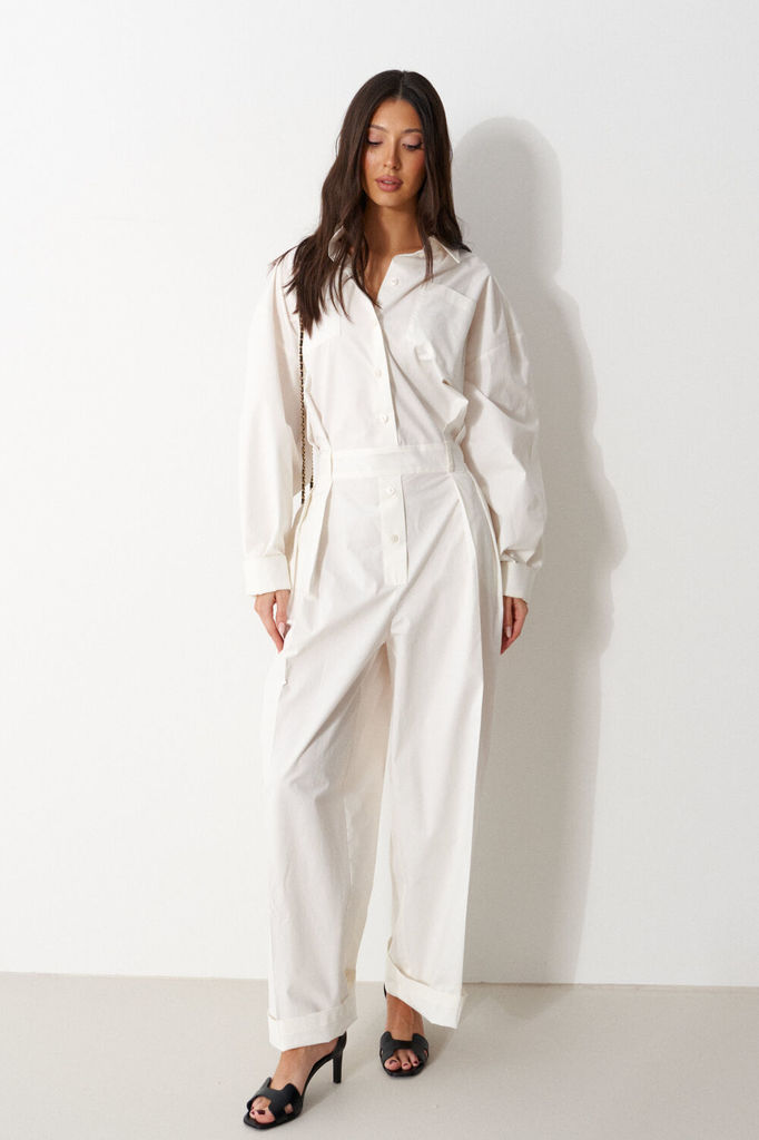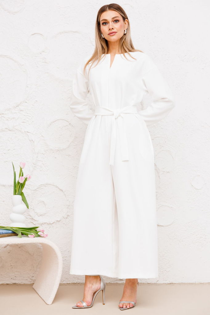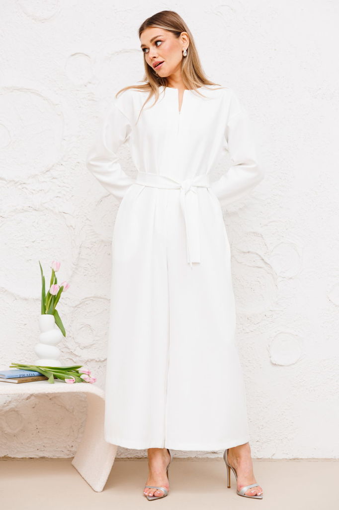 Комбинезон свободного кроя. Выполнен из хлопковой ткани молочного (тёплого белого) цвета. Без подкладки. Воротник отложной. Застёжка центральная - пуговицы. На уровне линии груди накладные карманы. Ру... Показать описаниекав втачной, спущенный, с манжетом с пуговицей. Пояс частично на резинке (резинка по задней части), со шлёвками. Брюки по переду со складками. По переду имитация застёжки. В боковых швах карманы. Длина рукава от линии втачивания 60 см. Длина спинки (до пояса) верха 48 см. Длина брючины по боковому шву (с учётом пояса) 110 см