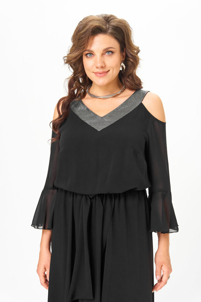 Состав: ПЭ-100%; Комбинезон выполнен из однотонной ткани плательно-костюмной группы, в качестве отделки использован однотонный шифон и материал с люрексом. Комбинезон отрезной по линии талии. Полочка ... Показать описаниелифа с нагрудными вытачками, спинка с потайной молнией в среднем шве. Горловина V-образной формы, обработана притачной планкой из материала с люрексом. Рукав с открытым плечом, выполнен из шифона. Длина рукава ?, по низу рукава обработан притачной волан. Нижняя часть комбинезона выполнена с запахом. По линии талии комбинезон на резинке. По боковым швам настрочены шлевки, через которые продет пояс, завязывающийся спереди. Лиф комбинезона Наименование измерений Откл. см 50 52 54 56 58 60 Основные измерения Ширина изделия на уровне линии груди ±1 54 56 58 60 62 64 Ширина изделия на уровне талии ±1 30-57 32-59 34-61 36-63 38-65 40-67 Ширина изделия на уровне линии бедер Длина изделия по центру спинки Ширина спинки ±0.5 38 38 38 41 41 41 Ширина полочки ±0.5 36.5 36.5 36.5 39.5 39.5 39.5 Длина рукава ±1 40.5 40.5 40.5 41 41 41 Ширина рукава в верхней части ±0.5 18.3 19.3 20.3 21.3 22.3 23.3 Ширина рукава по низу ±0.5 39 40 41 42 43 44 Дополнительные измерения Длина спинки до талии по центру ±1 33 33 33 33.8 33.8 33.8 Ширина кокетки спинки Длина полочки до талии по центру Ширина кокетки полочки Длина воротника Ширина манжеты рукава ±0.5 14 14 14 14 14 14 Длина шлицы (разреза)по спинке Длина пояса ±2 185 185 185 197 197 197 Ширина пояса ±0.5 5 5 5 5 5 5 __Брюки комбинезона__ Основные измерения Откл. 50 52 54 56 58 60 Ширина изделия по линии талии ±1 30-57 32-59 34-61 36-63 38-65 40-67 Ширина изделия по линии бедер Длина изделия по боковому шву от талии ±1 112 112 112 112 112 112 Длина изделия по шаговому шву ±1 80.5 80.5 80.5 79 79 79