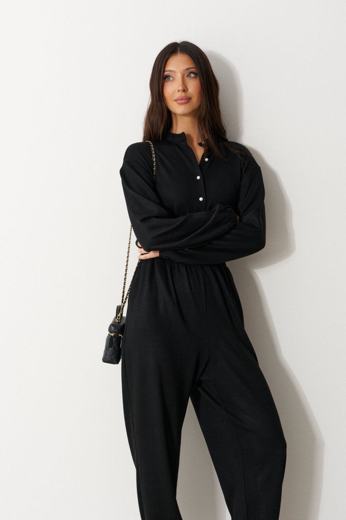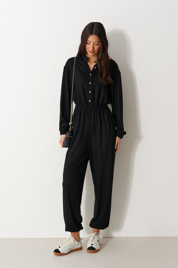Состав: Вискоза-38%; ПАН-33%; ПЭ-24%; Шерсть-5%; Комбинезон свободного кроя. Выполнен из трикотажа черного цвета. Без подкладки. Вырез горловины круглый. Воротник стойка. Застёжка центральная - пугови... Показать описаниецы. Рукав втачной, спущенный, с манжетом на резинке. Пояс на резинке. Брюки с манжетом на резинке. В брючинах наклонные карманы. Длина спинки верха 38 см. Длина рукава (от линии втачивания) 60 см. Длина бокового шва брючины (с учётом пояса) 109 см.