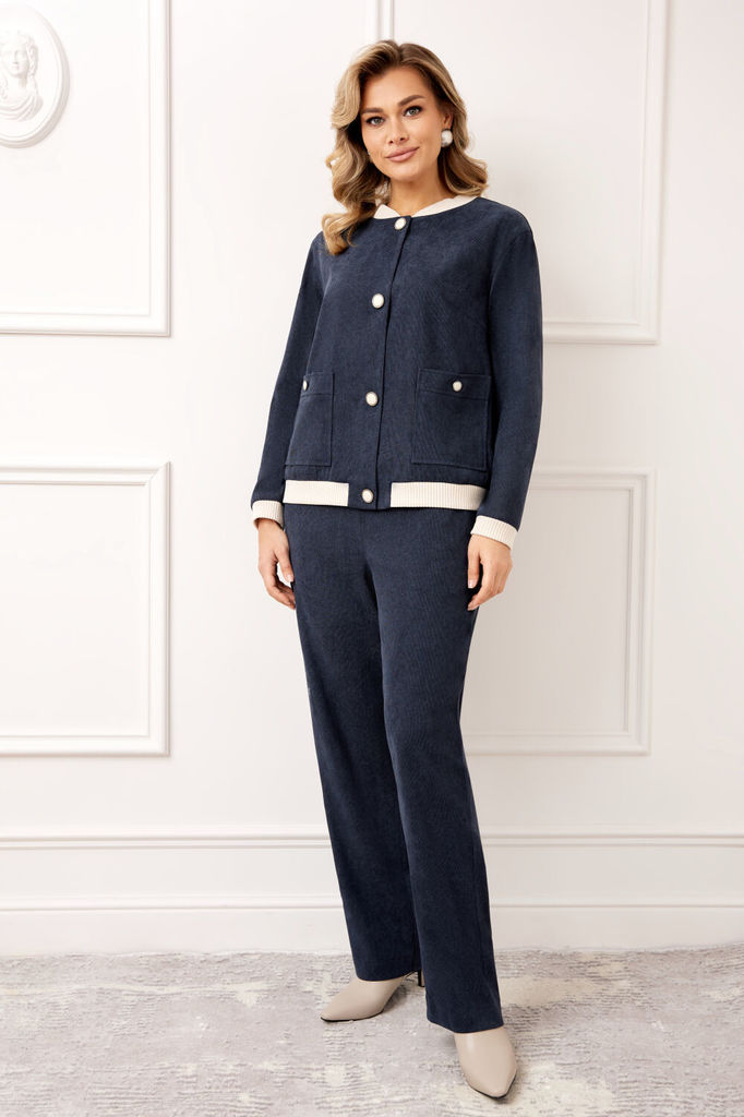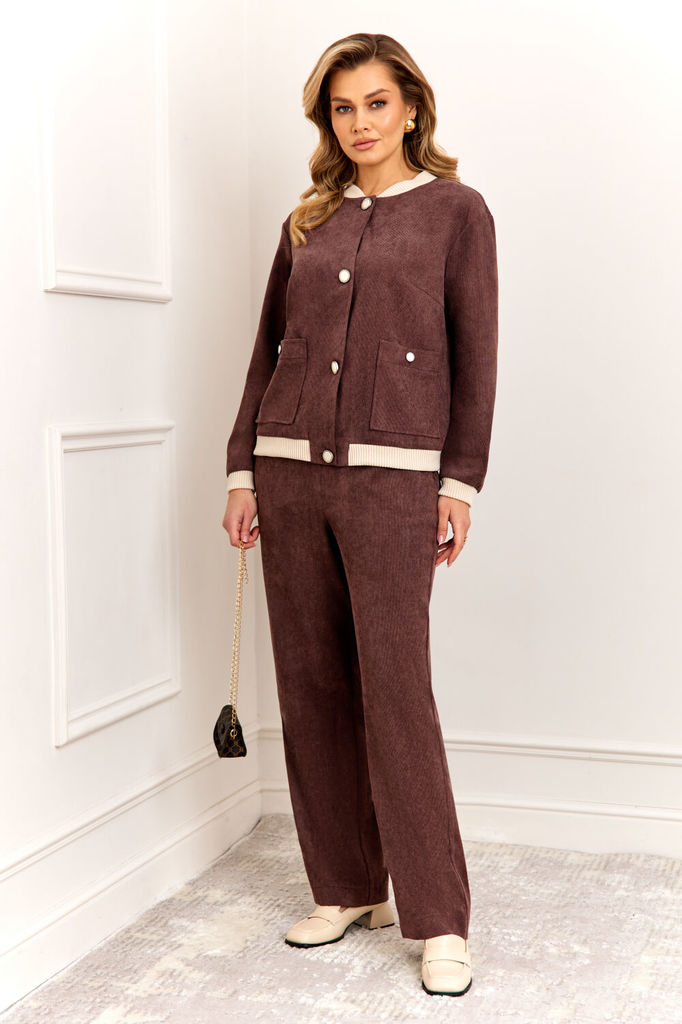 Состав: Вискоза-32%; ПЭ-65%; Эластан-3%; Стильный и современный комплект, состоит из бомбера и брюк. Бомбер полуприлегающего силуэта, выполнен из премиальной ткани Вельвет с добавлением вискозы. Бомбе... Показать описаниер без подкладки, по переду с застежкой на металлические пуговицы и накладными карманами с застежкой на пуговицу. Стойка горловины бомбера и манжета рукава выполнены из мягкого трикотажного довяза, что придет модели особый стиль и комфорт при носке. Рукав втачной, полной длины. Брюки прямые, слегка зауженные к низу, выполнены из премиальной ткани Вельвет с добавлением вискозы. Пояс брюк полностью на резинке, в боковых швах функциональные карманы.