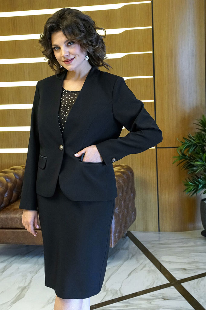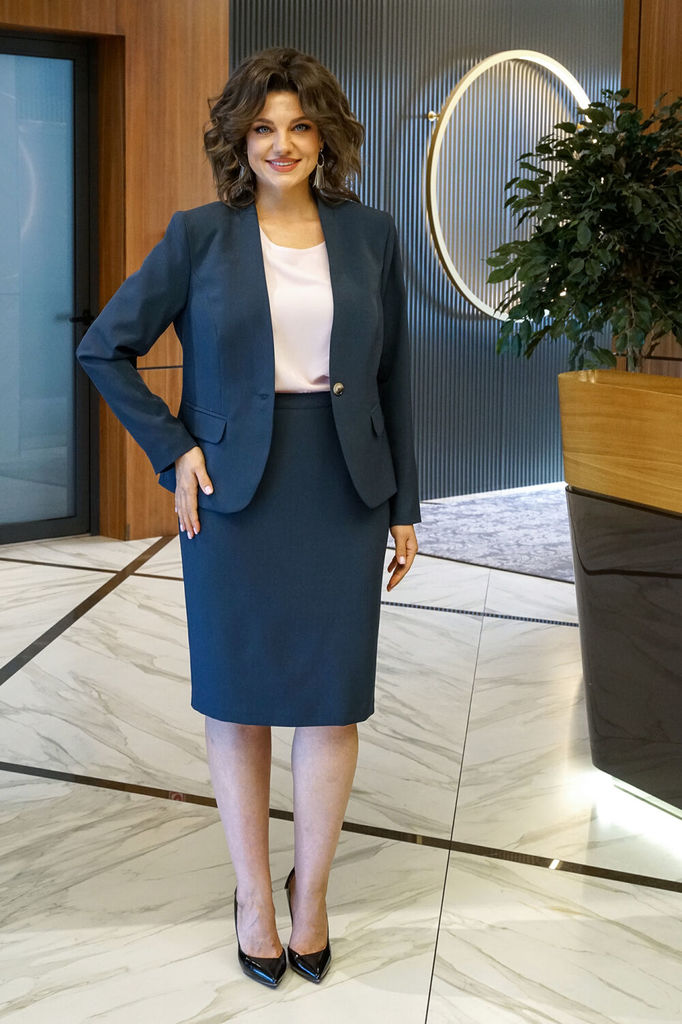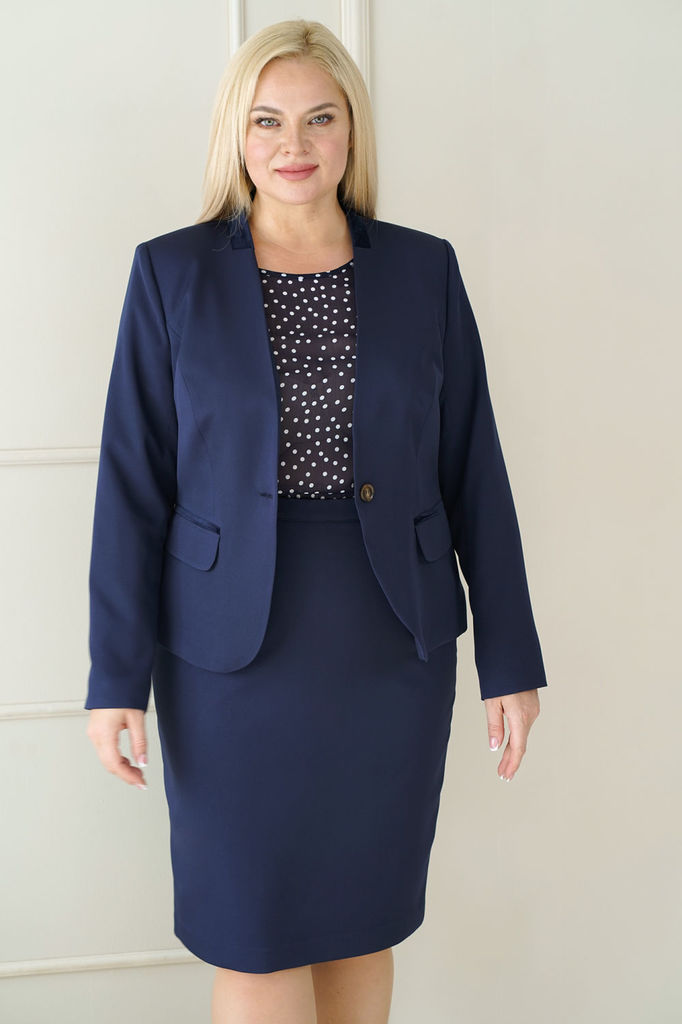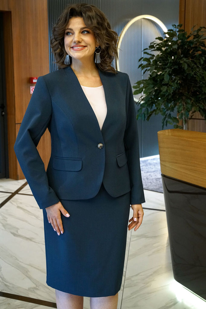 Состав: Костюм: ПЭ-97% Спандекс-3% Блуза: ПЭ-100% Жакет женский полуприлегающего силуэта, на подкладке, с центральной застёжкой на петлю и пуговицу. Перед с рельефными швами, с прорезными карманами с ... Показать описаниеклапаном и двумя обтачками. Спинка со средним швом и рельефными швами. Рукава втачные, двухшовные, длинные, на продолжении локтевого шва шлица  декорирована одной пришивной пуговицей. Воротник втачная стойка. Блуза женскаяР46-50 полуприлегающего силуэта, с разрезом виде капельки по центру горловины спинки с застёжкой на навесную петлю и пуговицу, низ фигурной формы. Перед с нагрудными выточками. Рукава втачные, крылышко по окату со сборкой. Р 52-60 полуприлегающего силуэта, низ фигурной формы. Перед с нагрудными выточками. Рукава втачные, крылышко по окату со сборкой. Юбка женская Р46-50 полуприлегающего силуэта книзу чуть зауженная, на подкладке, на притачном поясе, с застёжкой на потайную тесьму-молнию в среднем шве заднего полотнища и пуговица по поясу.Переднее полотнище с талевыми выточками.Заднее полотнище с талевыми выточками и средним швом заканчивающийся шлицей. Юбка женскаяР52-54 полуприлегающего силуэта книзу чуть зауженная, на подкладке, на притачном поясе по боковым на резинке, с застежкой на потайную тесьму-молнию в среднем шве заднего полотнища и пуговица по поясу.  Переднее полотнище с талевыми выточками. Заднее полотнище с талевыми выточками и средним швом заканчивающимся шлицей.