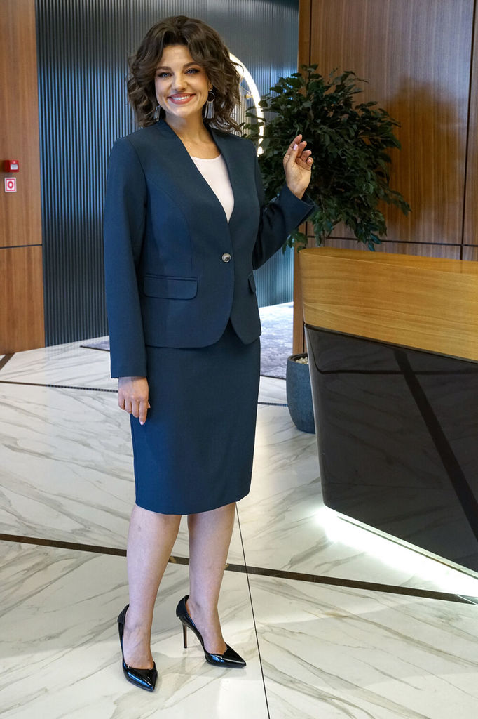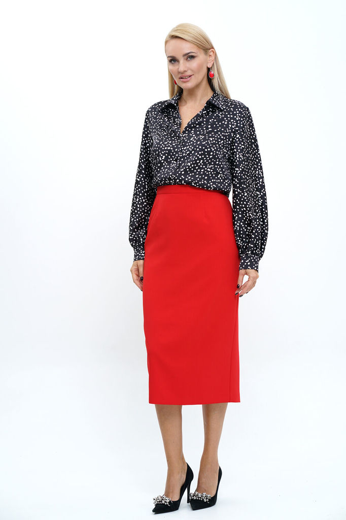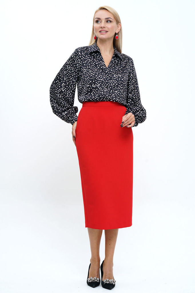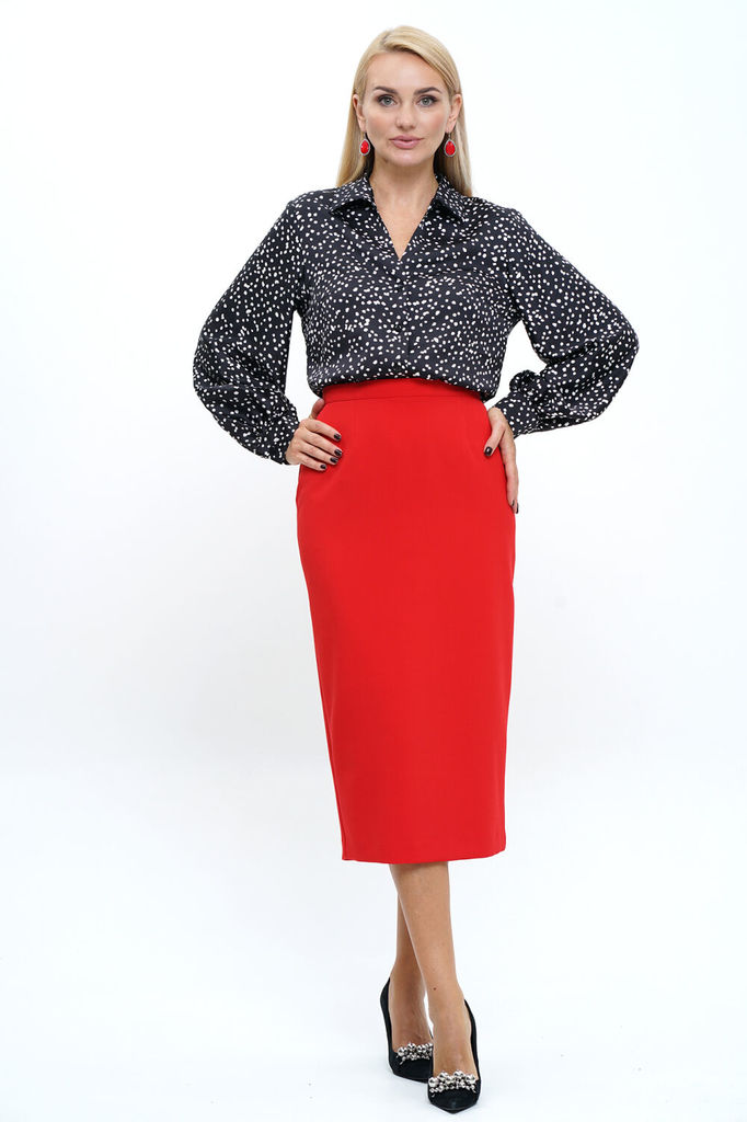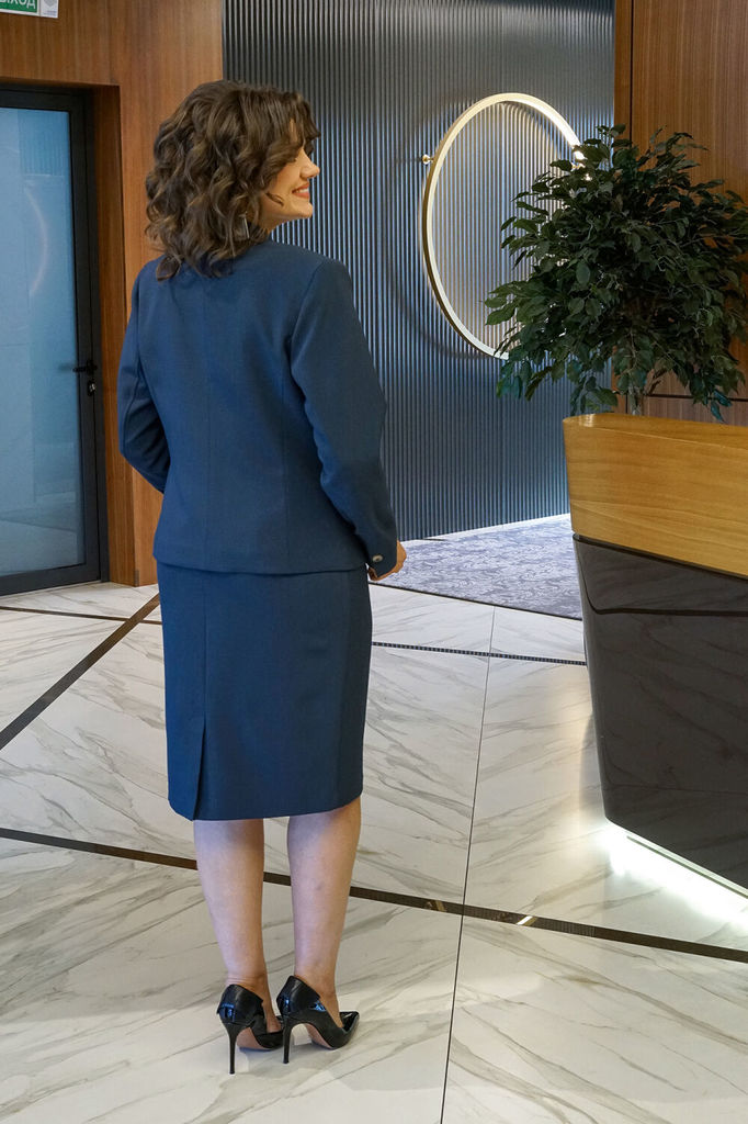 Состав: Костюм: ПЭ-97% Спандекс-3% Блуза: ПЭ-100% Жакет женский полуприлегающего силуэта, на подкладке, с центральной застёжкой на петлю и пуговицу. Перед с рельефными швами, с прорезными карманами с ... Показать описаниеклапаном и двумя обтачками. Спинка со средним швом и рельефными швами. Рукава втачные, двухшовные, длинные, на продолжении локтевого шва шлица  декорирована одной пришивной пуговицей. Воротник втачная стойка. Блуза женскаяР46-50 полуприлегающего силуэта, с разрезом виде капельки по центру горловины спинки с застёжкой на навесную петлю и пуговицу, низ фигурной формы. Перед с нагрудными выточками. Рукава втачные, крылышко по окату со сборкой. Р 52-60 полуприлегающего силуэта, низ фигурной формы. Перед с нагрудными выточками. Рукава втачные, крылышко по окату со сборкой. Юбка женская Р46-50 полуприлегающего силуэта книзу чуть зауженная, на подкладке, на притачном поясе, с застёжкой на потайную тесьму-молнию в среднем шве заднего полотнища и пуговица по поясу.Переднее полотнище с талевыми выточками.Заднее полотнище с талевыми выточками и средним швом заканчивающийся шлицей. Юбка женскаяР52-54 полуприлегающего силуэта книзу чуть зауженная, на подкладке, на притачном поясе по боковым на резинке, с застежкой на потайную тесьму-молнию в среднем шве заднего полотнища и пуговица по поясу.  Переднее полотнище с талевыми выточками. Заднее полотнище с талевыми выточками и средним швом заканчивающимся шлицей.