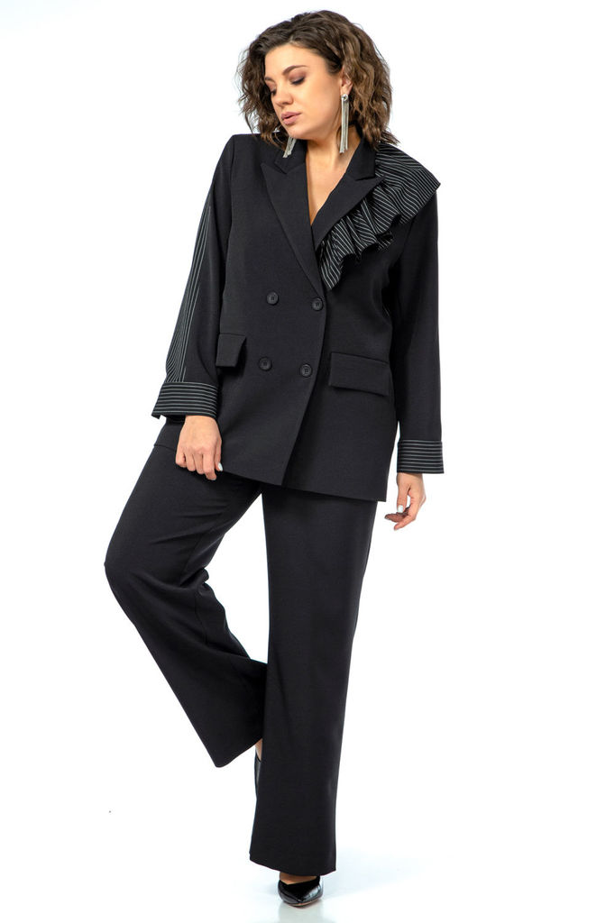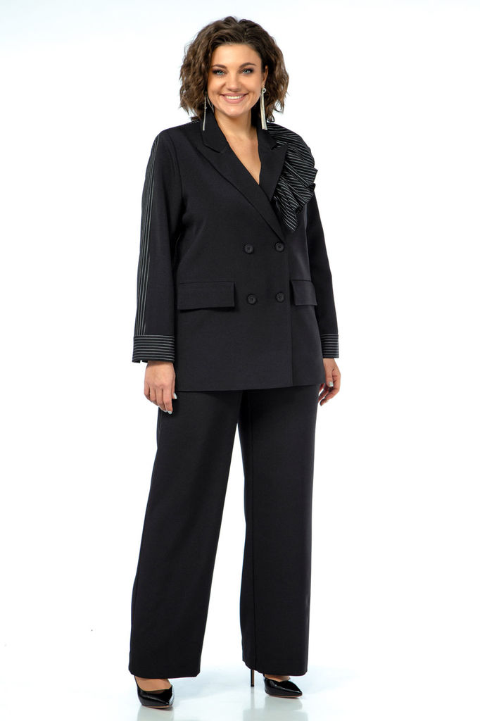 Состав: Костюм: ПЭ-96% Спандекс-4% Костюм: Вискоза-33% ПЭ-64% Спандекс-3% Жакет прямого, свободного силуэта, с двух-бортной застёжкой на петли и пуговицы и с в внутренней застёжкой на петлю и пуговицу... Показать описание, перед и спинка на подкладке, по левой стороне декорирован съёмной оборкой пристёгивающаяся под лацканом на пришивные кнопки. Перед  с прорезными карманами с листочкой и клапаном. Рукава втачные, двухшовные, длинные, понизу с разрезом в локтевом шве и притачными манжетами застёгивающиеся на навесную петлю и пуговицу. Воротник пиджачного типа. Брюки  широкие, свободного прямого силуэта, на притачной поясе. Застёжка на тесьму-молнию в среднем шве переда и петлю и пуговицу по поясу. Передние части с талевой выточкой и косыми боковыми карманами. Задние части с талевой выточкой.