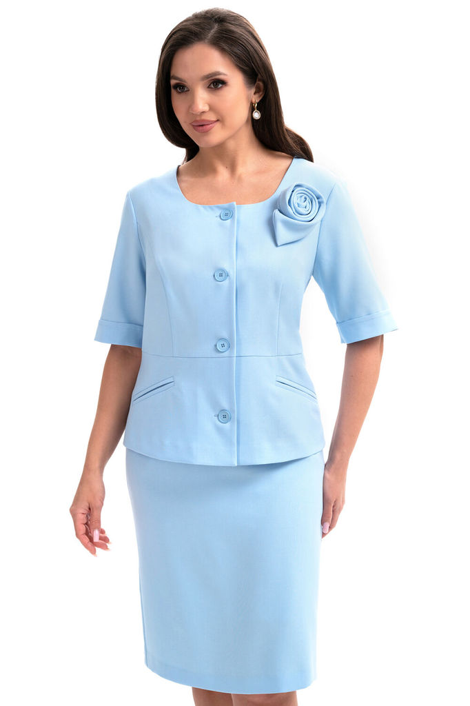 Состав: Вискоза-25% ПЭ-70% Спандекс-5% Комплект женский двух-предметный состоящий из жакета и юбки. Жакет полуприлегающего силуэта, с застёжкой на петли и пуговицы, отрезной по линии талии переда. Дек... Показать описаниеорирован съёмным цветком.  Перед с рельефными швами, с прорезными карманами с двумя обтачками. Спинка со средним швом и рельефными швами. Рукава втачные, одношовные, короткие, понизу имитацией цельнокроеной манжеты. Юбка полуприлегающего силуэта книзу чуть зауженная, на подкладке, с притачным поясом, с застежкой в среднем шве заднего полотнища на потайную молнию и петлю, пуговицу по краю пояса. Переднее полотнище с талевыми выточками. Заднее полотнище с талевыми выточками и средним швом заканчивающимся шлицей.