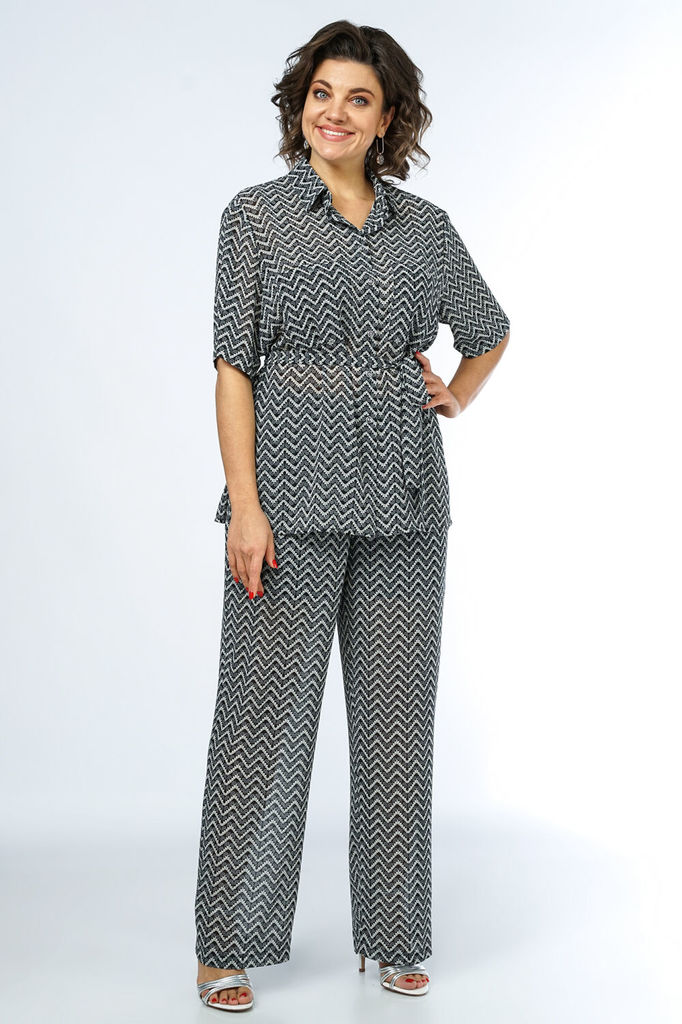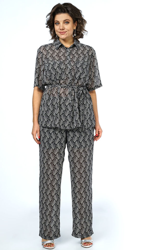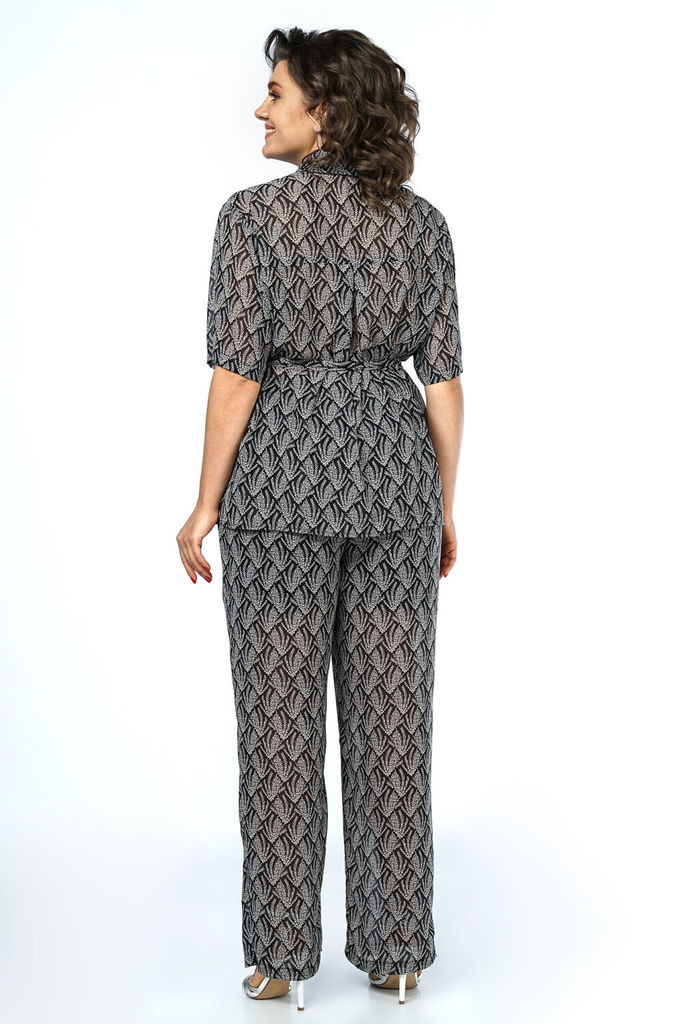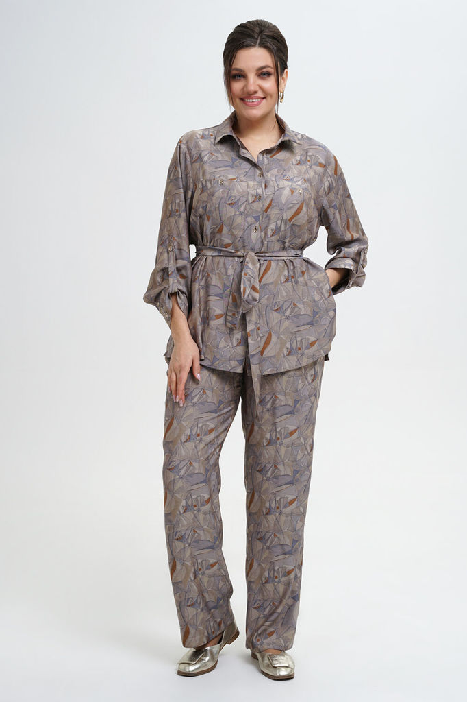 Состав: Блуза: Вискоза-97% Спандекс-3% Брюки: Вискоза-32% ПЭ-65% Эластан-3% Комплект женский 2-х предметный состоит из блузы и брюк. Блуза женская прямого, свободного силуэта, с завязывающимся поясом,... Показать описание со спученной линией плеча, с разноуровневым низом (спинка длиннее на 4,0см), по боковым с разрезами. Брюки женские полуприлегающие по бёдрам и талии,  книзу расширенные, на притачном поясе, застёжка по среднему шву переда «гульфик» и на петлю и пуговицу по поясу. Передние части с мягкой застроченной складкой от линии талии и чуть ниже линии бёдер. Задние части с талевыми выточками.