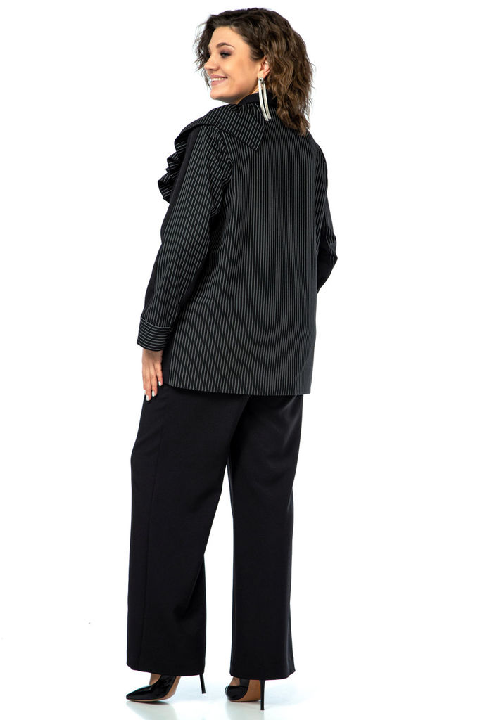 Состав: Костюм: ПЭ-96% Спандекс-4% Отделка: Вискоза-33% ПЭ-64% Спандекс-3% Жакет прямого, свободного силуэта, с двух-бортной застёжкой на петли и пуговицы и с внутренней застёжкой на петлю и пуговицу,... Показать описание перед и спинка на подкладке, по левой стороне декорирован съёмной оборкой пристёгивающаяся под лацканом на пришивные кнопки.  Перед с прорезными карманами с листочкой и клапаном. Рукава втачные, двушовные, длинные, понизу с разрезом в локтевом шве и притачными манжетами застёгивающиеся на навесную петлю и пуговицу. Воротник пиджачного типа. Брюки широкие, свободного прямого силуэта, на притачном поясе. Застёжка на тесьму-молнию в среднем шве переда и петлю и пуговицу по поясу. Передние части с талевой выточкой и косыми боковыми карманами. Задние части с талевой выточкой. Размерный ряд 44-54 Жакет Длина изделия (по среднему шву спинки)  71 71 71 72 72 Ширина изделия (на уровне глубины проймы) 1/2 54 56 58 60 62 Ширина спинки 40  41 42 43 44 Ширина переда  38 39 40 41 42 Длина рукава    59 59 59 59 59 Ширина рукава (на уровне глубины проймы) 1/2 17,3  18 18,7 19,4 20,1 Ширина изделия (по линии талии) 1/2 53 55 57 59 61 Ширина изделия (по линии бедер) 1/2  54 56 58 60 62 Длина входа в карман 15  15 15 15 15 Ширина плеча 12,8  12,8 13 13 13 Брюки Длина брюк от талии по боковому шву  109 109 109 109 109 Ширина брюк (по линии бедер) ? 48 50 52 54 56 Ширина брюк (по линии талии) ?  38 40 42 44 47 Длина брюк (по шаговому) 81,5  81,5 81,5 81,5 81,5 Ширина брюк (по линии низа) 1/2  24,5 25 25,5 26 26,5 Ширина брюк (по линии шага) 1/2 30,5 32 33,5 35 36,5
