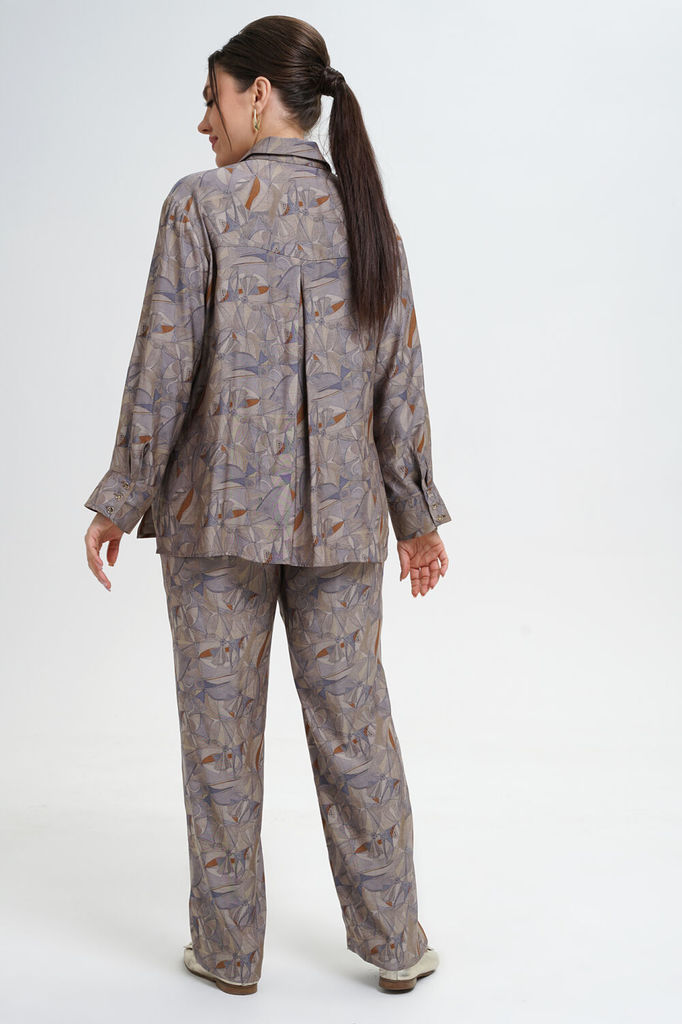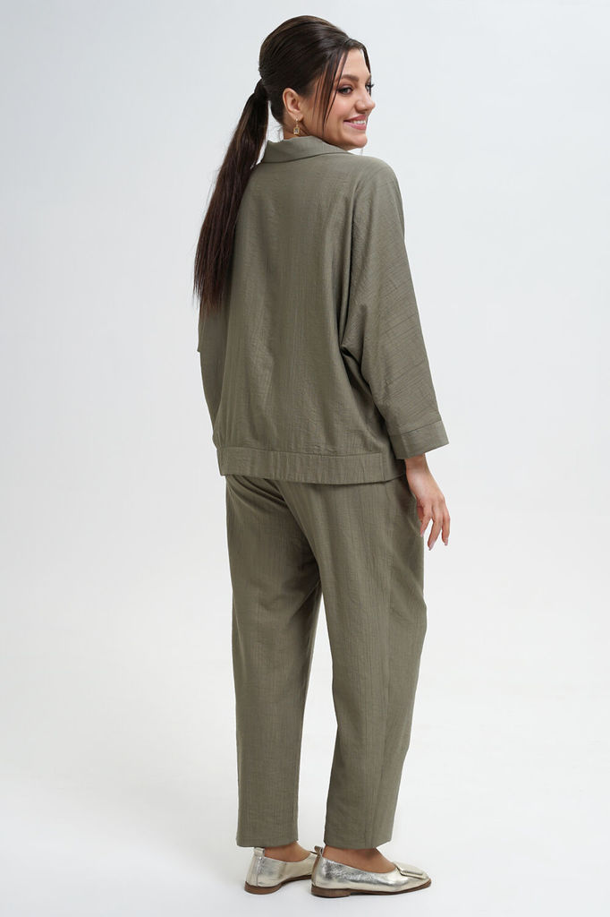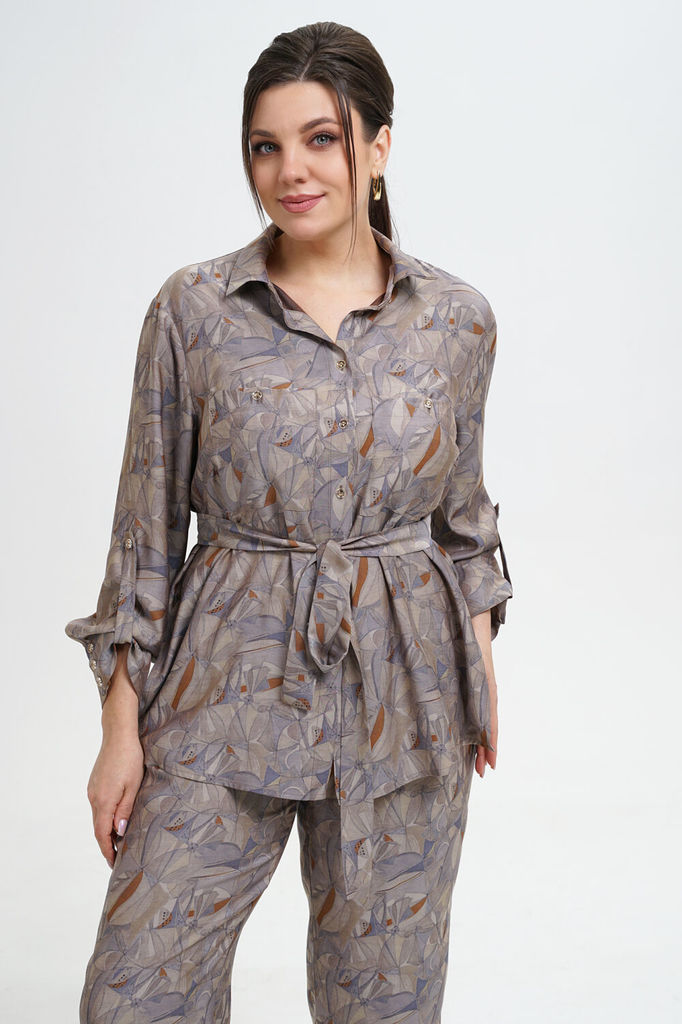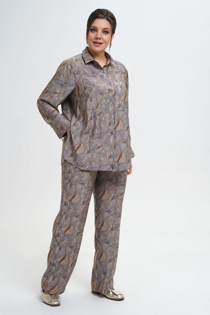 Состав: Вискоза-37% ПЭ-60% Спандекс-3% Блузка прямого, свободного силуэта, в дополнении пояс, с застёжкой на петли, пуговицы, по боковым разрезы. Перед с нагрудными выточками, накладными карманами при... Показать описаниестёгивающиеся на петлю, пуговицу. Спинка с притачной кокеткой и мягкой встречной складкой. Рукава втачные, одношовные, длинные, понизу с разрезом, мягкой складкой и притачными манжетами на петли, пуговицы, с патой фиксируемая длину рукава на петлю, пуговицу. Воротник стояче отложной на отрезной стойке на петлю, пуговицу. Брюки прямого, свободного силуэта, с притачным поясом на резинке. Передние части с косыми боковыми карманами.