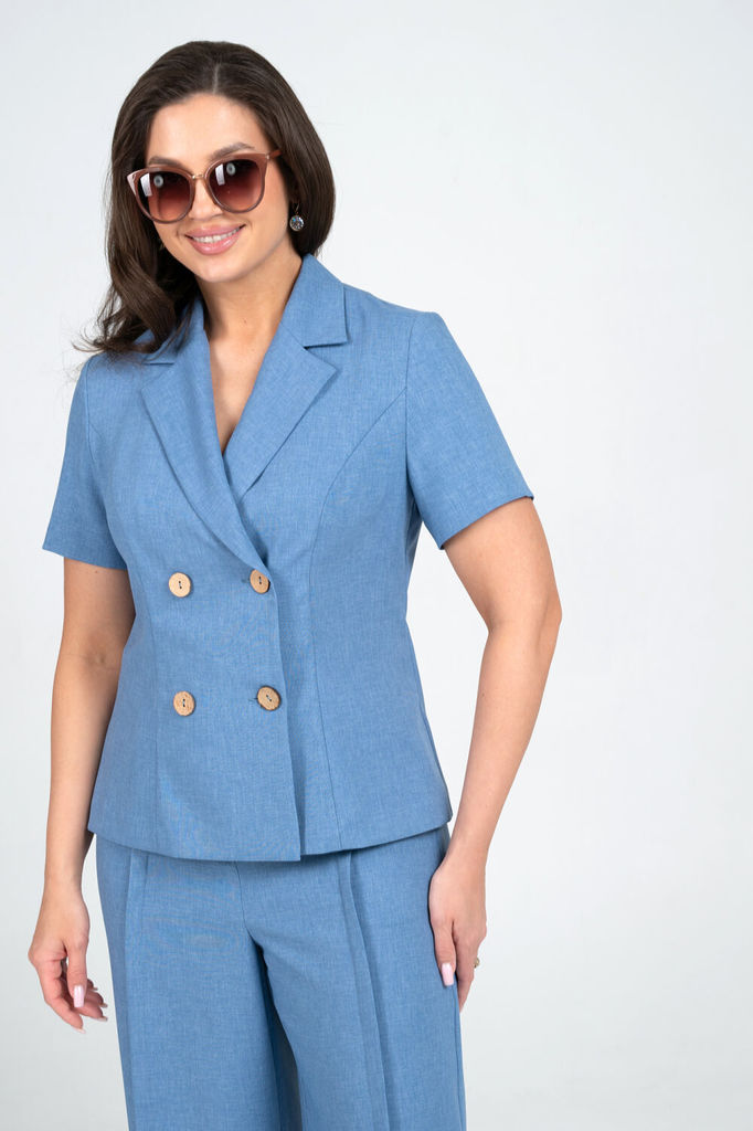 Состав: Жакет: Хлопок-100% Брюки: Вискоза-25% ПЭ-70% Спандекс-5% Комплект женский 2-х предметный состоит из жакета и брюк. Жакет полуприлегающего силуэта, с застёжкой на петли, пуговицы. Перед с отлож... Показать описаниеными лацканами, с нагрудными выточками, накладными карманами. Рукава втачные, одношовные, понизу с притачными манжетами и патой фиксируемая пуговицей. Воротник отложной. Брюки  широкие, свободного прямого силуэта, на притачном поясе по боковым на резинке. Застёжка типа «гульфик» на молнию и по краю пояса на петлю, пуговицу. Передние части с талевыми выточками и косыми боковыми карманами. Задние части с талевыми выточками.