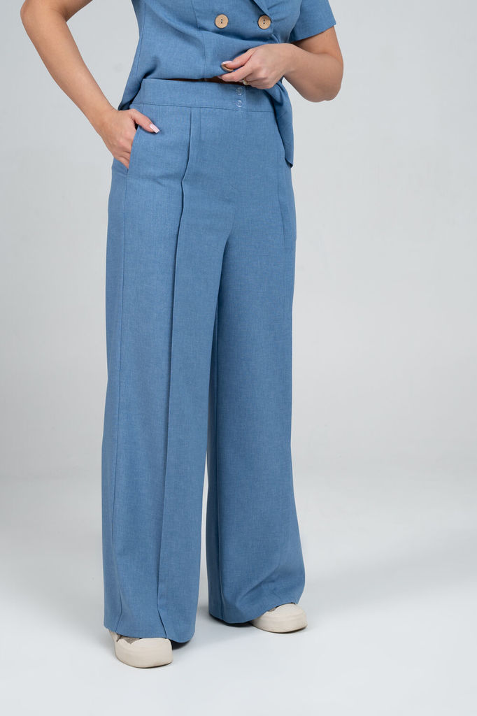 Состав: Вискоза-33% ПЭ-64% Спандекс-3% Комплект женский 2-х предметный состоит из блузы и брюк. Ткань плательно-костюмного ассортимента,лен-вишер.Блуза женская прямого, свободного силуэта, с центральн... Показать описаниеой застёжкой по цельнокроеной планке на петли и пуговицы. Декорированная нашивкой верху левого накладного кармана. Перед с нагрудными выточками и нагрудными накладными карманами. Спинка с притачной кокеткой. Рукава втачные, одношовные, короткие. Воротник стояче-отложной на отрезной стойке, застёгивающейся на петлю и пуговицу. Брюки женские прямые, свободного силуэта,  длинные, на притачном поясе. Застежка обработана в среднем шве на тесьму-молнию типа «гульфик» и по краю пояса на петлю и пуговицу.    Передние части с боковыми косыми карманами
