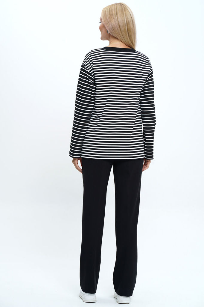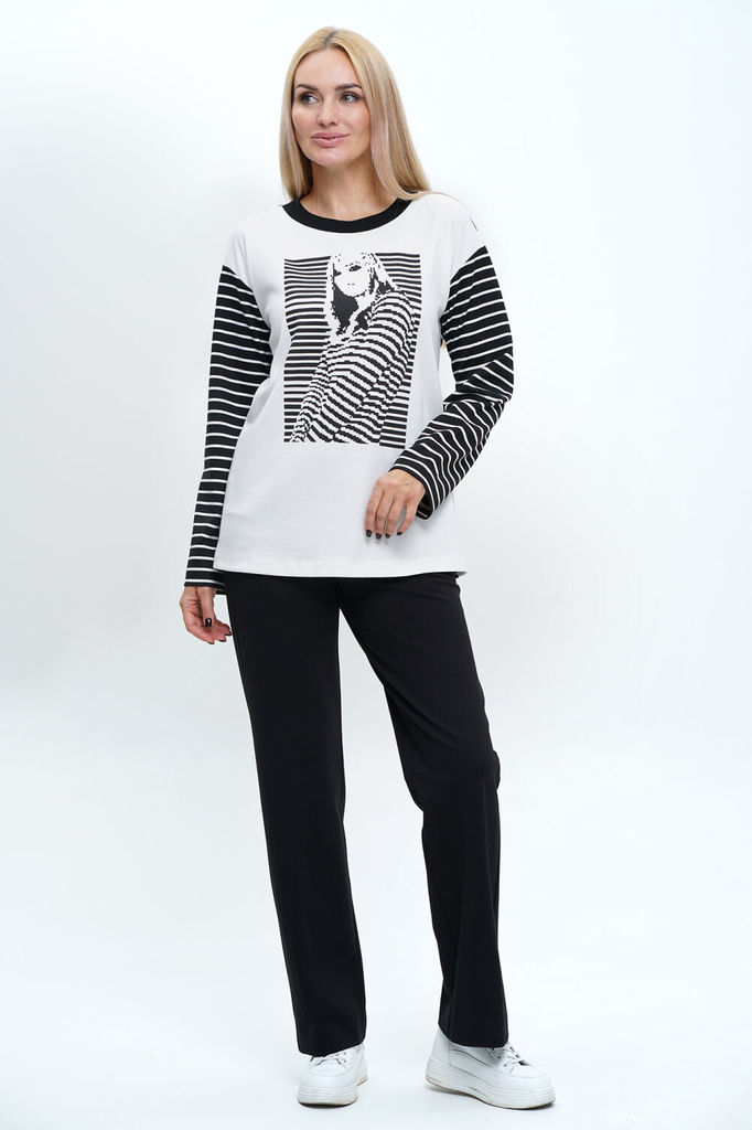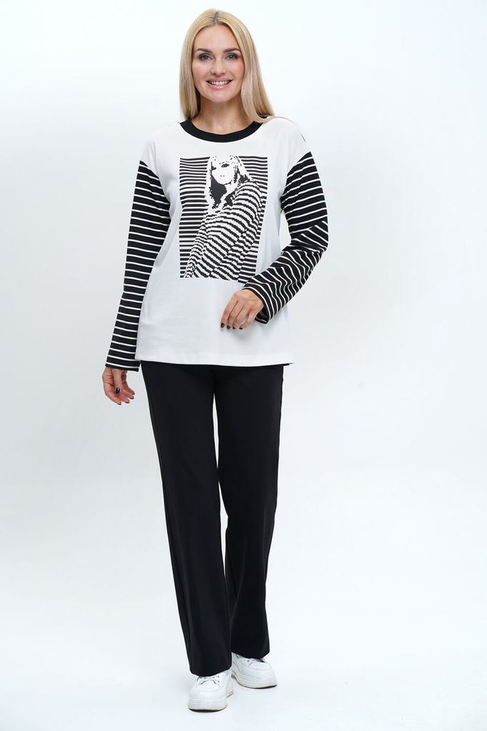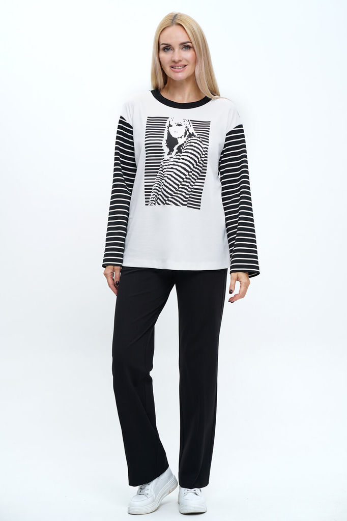 Состав: Спандекс-5% Хлопок-65% Нейлон-30% Блузон прямого, свободного силуэта, со спущенной линией плеча, плечевой шов смещённый на перед, с разно уровневым низом. Перед с рельефными швами заканчивающи... Показать описаниееся разрезами. Спинка понизу отрезная. Рукава цельнокроеные с боковыми частями переда и спинки. По горловине бейка. Декорированный блузон по переду печатью. Брюки типа «банан» с притачным поясом на резинке. Передние части с косыми боковыми карманами.