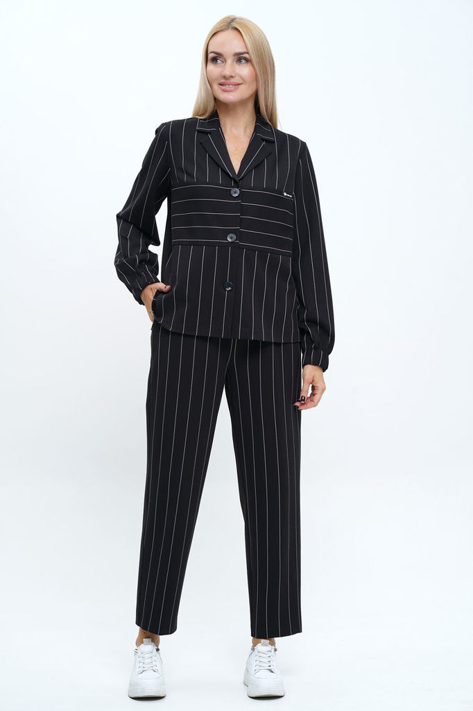 Состав: ПЭ-95% Эластан-5% Жакет полуприлегающего силуэта, на подкладке (спинка частично), с застёжкой на пели и пуговицы. Перед и спинка с притачной кокеткой. Перед с отложными лацканами, с рельефными... Показать описание швами, по боковой части накладные кармы. Спинка со средним швом и рельефными швами. Рукава втачные, двухшовные, длинные. Воротник по кокетке шалька. Брюки женские длинные, со сгибом, верхний край обработан притачным поясом по боковым на резинке, застежка типа «гульфик» молнию и по краю пояса на петлю, пуговицу.  Передние части с имитацией косых карманов. Задние части с талевыми выточками