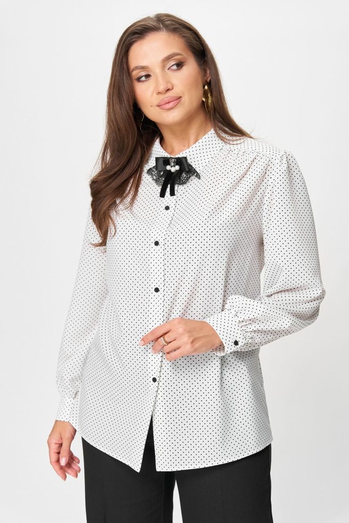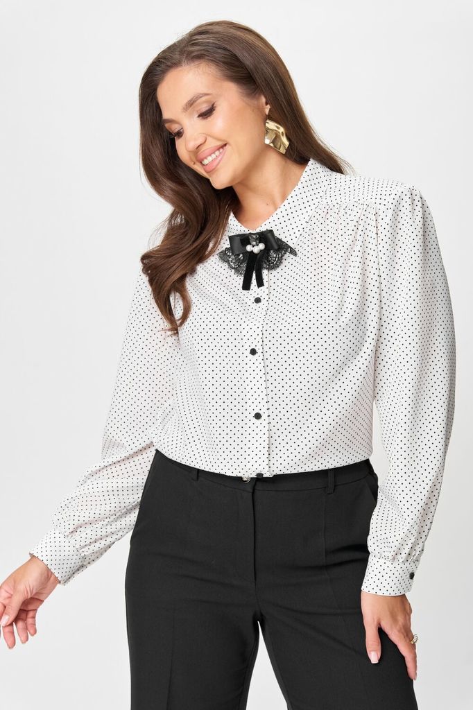 Состав: ПЭ-100%; Блузка в горох с объемными рукавами на манжетах прекрасно впишется в любой гардероб. Изделие с планкой на пуговицах прекрасно сидит на фигуре, прямой крой вещи вытягивает силуэт, скры... Показать описаниевает несовершенства и подчёркивает достоинства. Модель из крепа подойдет для носки в теплую погоду, зимой под жакет, жилет, кардиган, прекрасно сочетается не только с классическими брюками и юбками. Дизайнерская брошь ручной работы дополняет и украшает блузку. Таблица измерений изделия в готовом виде М 5028 Наименование измерений/размер 50 52 54 56 58 60 Ширина по линии груди 56 58 60 62 64 66 Ширина по линии низа 58 60 62 64 66 68 Длина изделия по спинке 68 68 68 68 68 68 Длина рукава 60 60 60 60 60 60 Допустимые отклонения +-1-1,5 см