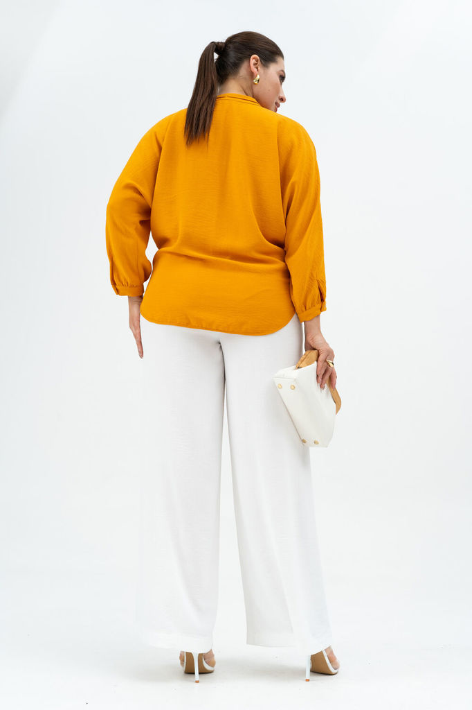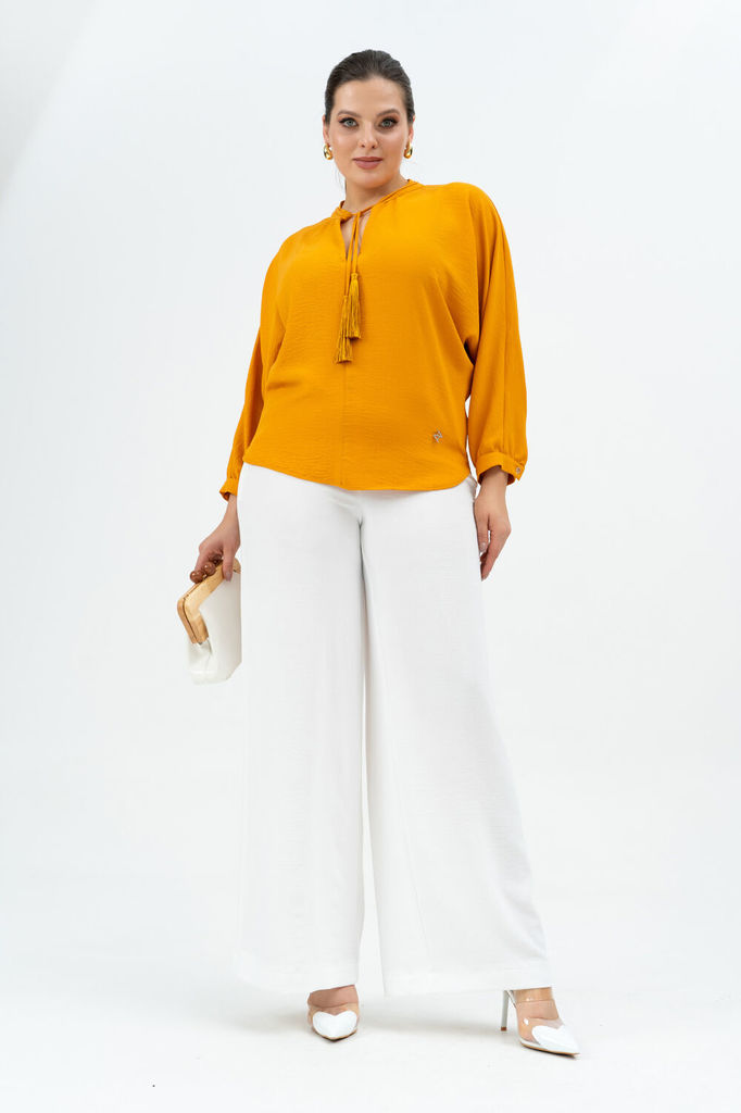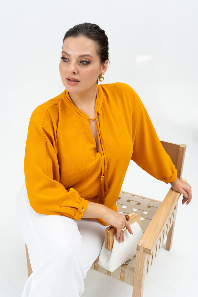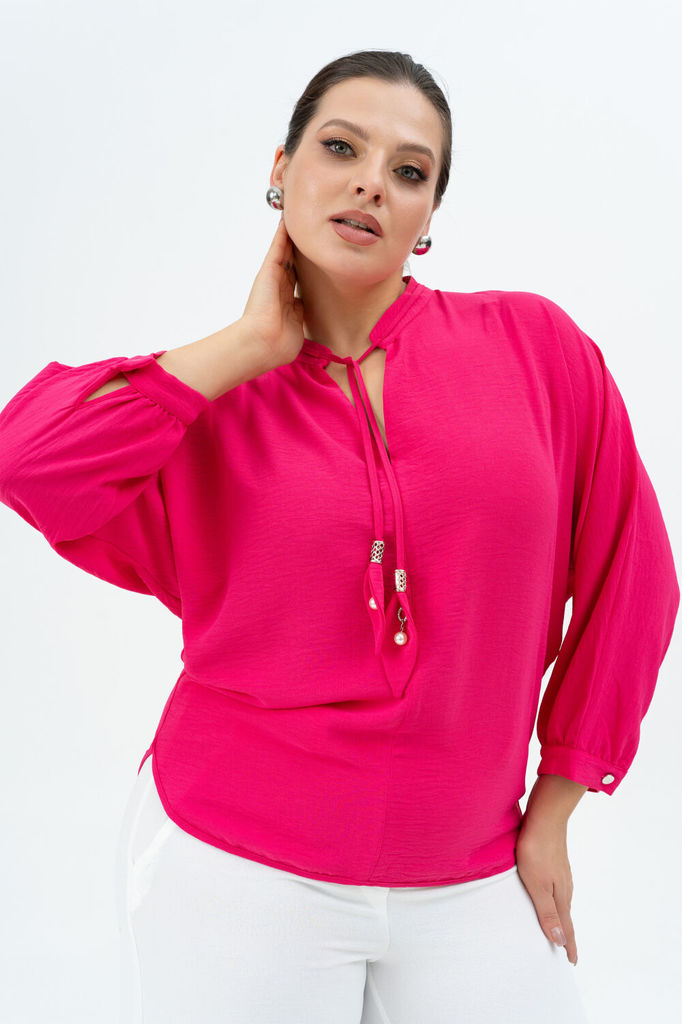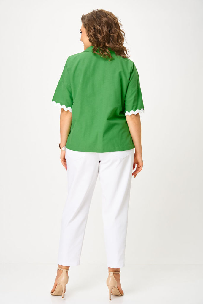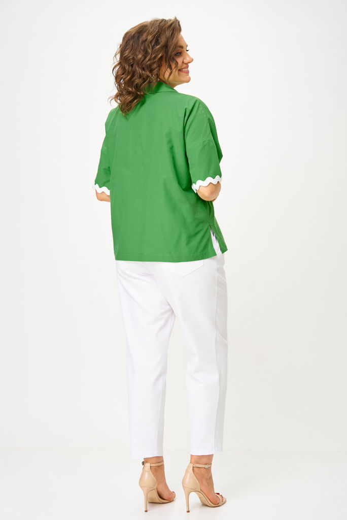 Состав: ПЭ-85%; Хлопок-15%; Женская блузка с отделкой и тесьмой по переду, с втачными рукавами, идеальный выбор для современных женщин, ценящих комфорт и стиль. Свободный крой предоставляет свободу дв... Показать описаниеижений и делают модель еще более удобной. Блузка имеет V-образный вырез горловины, отложной воротник, широкие рукава длины 3/4. Данная модель - идеальный выбор для женщин размера Plus size, прекрасно сочетается с различными типами низа, что позволяет легко комбинировать ее с любыми предметами гардероба. Ткань блузки не мнется, приятная на ощупь. Блузка стильная и элегантная, идеально подойдет для работы, учебы или отдыха, обеспечивая комфорт и стиль вне зависимости от обстоятельств. Таблица измерений изделия в готовом виде М 5033 Наименование измерений/размер 50 52 54 56 58 60 Ширина по линии груди 56 58 60 62 64 66 Ширина по линии низа 59 61 63 65 67 69 Длина изделия по спинке 65 65 65 65 65 65 Длина рукава 39 39 39 39 39 39 Допустимые отклонения +-1-1,5 см
