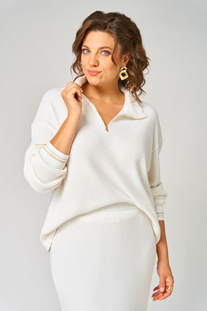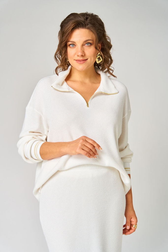 Состав: Вискоза-33%; ПЭ-64%; Эластан-3%; Трикотажный женский джемпер с воротником-стойкой на молнии — это идеальный выбор для создания стильного и уютного образа в прохладное время года. Изготовленный... Показать описание из мягкого трикотажа, в состав которого входит смесовая вискоза, этот джемпер приятно облегает тело и обеспечивает максимальный комфорт. Свободный прямой крой со спущенной линией плеча создает расслабленный силуэт, который идеально подходит для удобной носки и позволяет свободно двигаться. Длинные рукава на манжетах с полосками добавляют изделию изысканности и стиля, а также защищают от холода. Воротник-стойка на молнии не только добавляет оригинальности, но и позволяет регулировать тепло, что делает этот джемпер универсальным элементом гардероба. Он отлично сочетается как с брюками, так и с юбками, позволяя создавать разнообразные образы для разных случаев — от прогулок, праздников до встреч с друзьями или даже для работы в офисе. Таблица измерений изделия в готовом виде М 3015 Наименование измерений/размер 52 54 56 58 60 62 Ширина по линии груди 58 60 62 64 66 68 Ширина по линии бёдер 60 62 64 66 68 70 Длина изделия по спинке 61 61 61 61 61 61 Длина рукава от горловины 74 74 74 74 74 74 Допустимые отклонения +-1-1,5 см