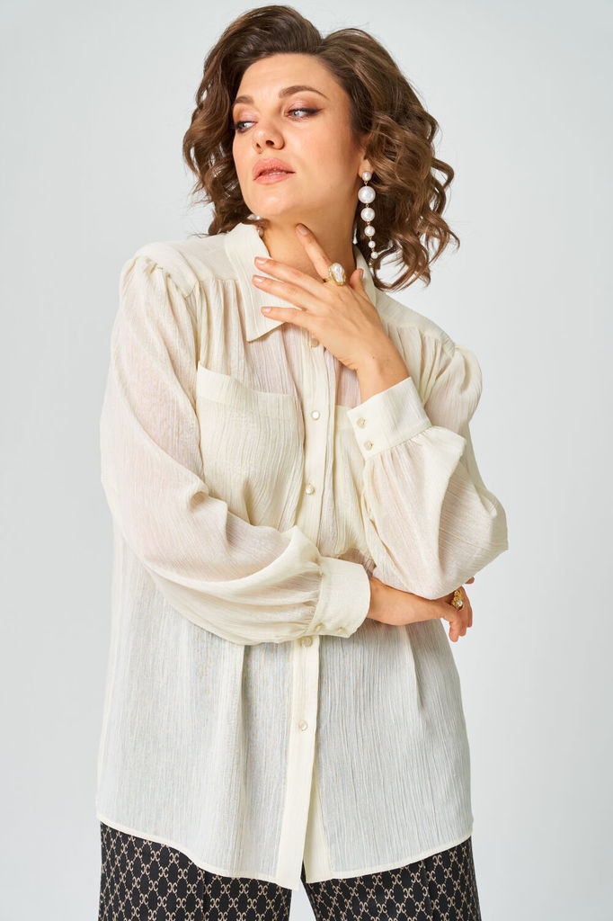 Состав: ПЭ-100%; Блузка из шифона с эффектом крэш и объемными рукавами на манжетах прекрасно впишется в любой гардероб. Изделие с планкой на пуговицах прекрасно сидит на фигуре, прямой крой вещи вытяг... Показать описаниеивает силуэт, скрывает несовершенства и подчёркивает достоинства. Модель подойдет для носки в теплую погоду, зимой под жакет, жилет, кардиган, прекрасно сочетается не только с классическими брюками и юбками. Таблица измерений изделия в готовом виде М 5043 Наименование измерений/размер 50 52 54 56 58 60 Ширина по линии груди 57 59 61 63 65 67 Ширина по линии бёдер 60 62 64 66 68 70 Длина изделия по спинке 68 68 68 68 68 68 Длина рукава 60 60 60 60 60 60 Допустимые отклонения +-1-1,5 см