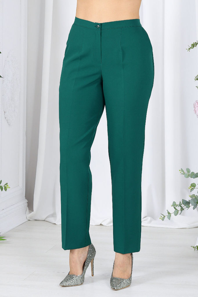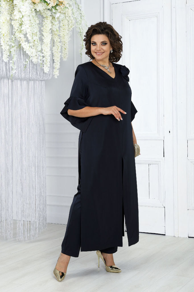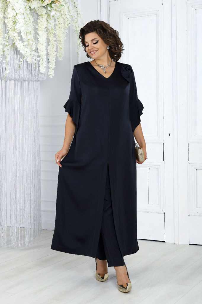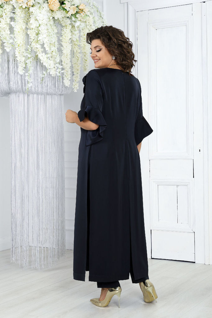 Состав: ПЭ-95%; Спандекс-5%; Представляем вашему вниманию вечерний брючный костюм, созданный с особым вниманием к стилю и комфорту женщин больших размеров. Этот изысканный комплект выполнен из высокок... Показать описаниеачественного сатина, придавая вашему образу нежность и элегантность. Длинная туника этого костюма не только подчеркивает его изысканный характер, но и служит важным элементом создания правильного силуэта для женщин с великолепными формами. Ее линии и длина прекрасно балансируют фигуру, придавая ей гармоничность и элегантность. Комплект брючный 2-х предметный, состоящий из туники и брюк, выполненных из плательной ткани «сатин». Туника полуприлегающего силуэта. Длина по среднему шву спинки 136 см. Перед с нагрудными вытачками, идущими из пройм, с центральным средним швом, в нижней части которого обработан разрез. Спинка с талиевыми вытачками, со средним швом, в верхней части которого расположена застежка на потайную тесьму-молнию, в нижней части-разрез. Ширина отделочной строчки по центральным разрезам переда и спинки-4,0 см. В боковых швах переда и спинки разрезы расположены от уровня талии до низа. Ширина отделочной строчки по боковым разрезам - 1,0 см. Горловина переда V-образной формы, горловина спинки округлая. Рукава втачные, одношовные, с притачными по низу фигурными обтачными воланами. Длина рукава от плечевого шва до низа волана - 36 см, длина рукава по нижнему шву до низа волана-59 см. Туника с плечевыми накладками, со съемным декоративным цветком «роза», выполненным из основной ткани. Брюки классические, с посадкой на талии, на притачном поясе с 5-ю шлевками, с застёжкой на тесьму-«молния», расположенную в среднем шве передних половинок, и 1 петлю и 1 пуговицу на поясе. Передние половинки брюк с двумя, застроченными от пояса вниз, односторонними складками, с боковыми наклонными карманами. Задние половинки брюк с талиевыми вытачками, идущими от пояса вниз. Для лучшего прилегания брюк в области талии в поясе по задним половинкам вставлена резинка. Размерный ряд 46/48/50/52/54/56/58/60/62 ОГ   92-96/96-100/100-104/104-108/108-112/112-116/116-120/120-124/124-128 ОТ   80-84/84-88/88-92/92-96/96-100/100-104/104-108/108-112/112-116 ОБ   100-104/104-108/108-112/112-116/116-120/120-124/124-128/128-132/132-136 Длина брюк по боковому шву с учетом пояса р.46,48 - 100,5 см, р.50-52 - 101,5 см,  р.54,56 -102,5 см, р. 58-62 - 104 см Длина туники по середине спины р.46-52 - 133,5 см, р.54-65 - 135 см Срок исполнения заказа 7-10 дней!