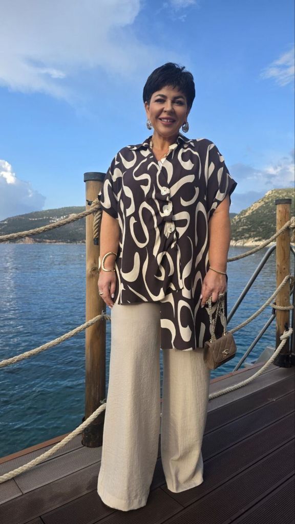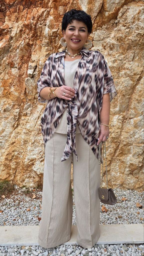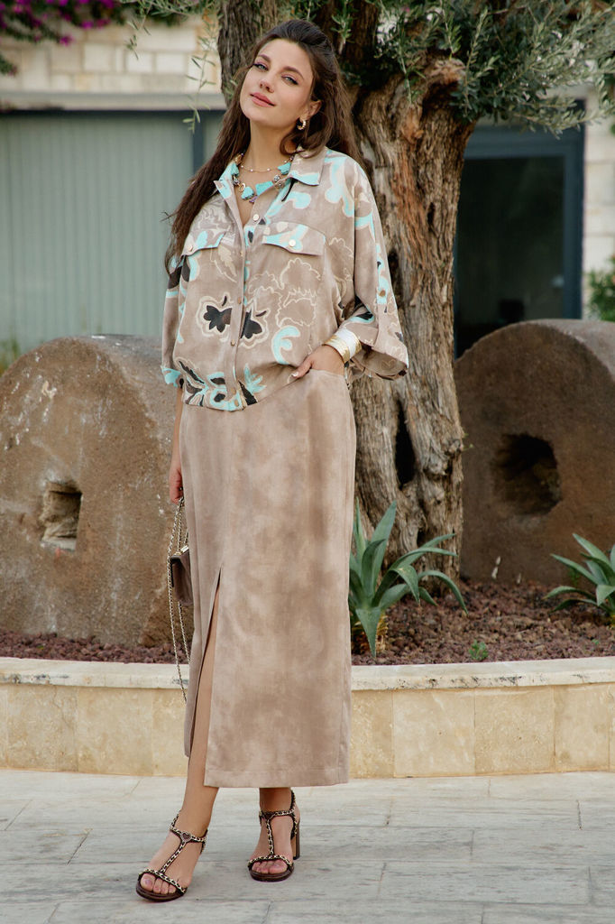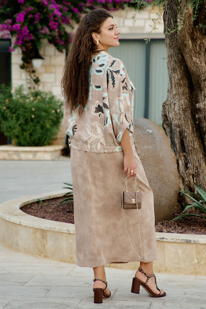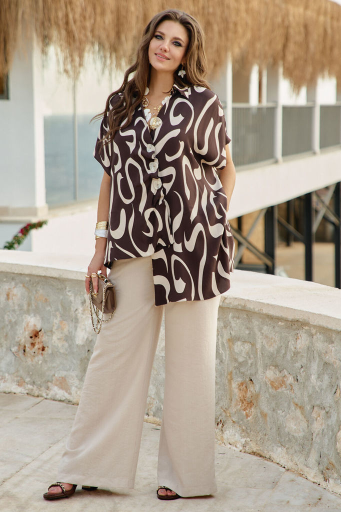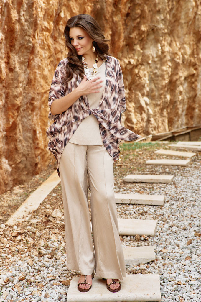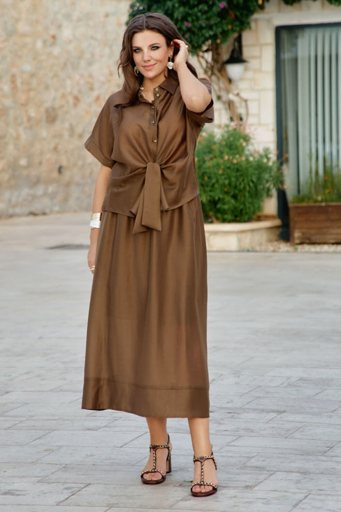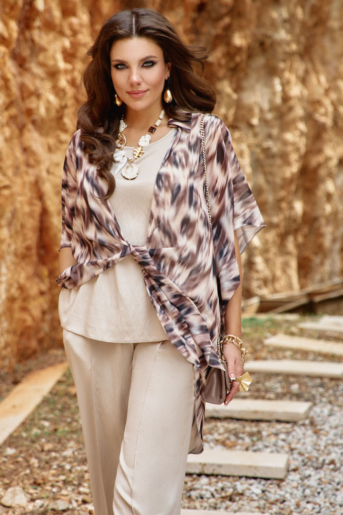 Состав: Блуза: ПЭ-100%; Блуза: Вискоза-83%; Нейлон-17%; Модель отшивается под заказ. Срок пошива от 3 недель. Комплект женский двухпредметный, состоящий из блузки и блузы. Комплект воплощает философию... Показать описание тихой элегантности, где настоящая роскошь проявляется в качестве материалов, продуманном крое и гармоничном сочетании пастельных оттенков. Этот комплект — не просто две вещи, а гардеробная система, которая учит: инвестировать в качественные базовые вещи — которые прослужат не один сезон, добавлять акцентные элементы — которые оживляют базовый гардероб, выражать свою индивидуальность — через выбор принтов и сочетаний. Блузка является «акцентным пятном» данного комплекта, выполнена в бежево-коричневой гамме, принт динамичный, создающий иллюзию движения даже когда блузка висит на вешалке. Блузка «оверсайз» силуэта, без застёжки с воротником рубашечного типа, по переду завязывается на декоративный узел. Рукав в блузке цельнокроеный с фигурной проймой. Для форменного силуэта боковые швы блузки переходят на перёд. Спинка с отрезной кокеткой. Низ в блузке фигурный, ассиметричный. Блуза прямого силуэта с широкими бретелями, с округлой формой горловины, нагрудными вытачками. В боковых швах от низа разрезы, низ фигурной формы. Длина блузки 97 см (р 52-56), 98 см (р 58-62). Длина майки 66 см (р 52-56), 67 см (р 58-62). Блузка 52 54 56 58 60 62 обхват груди 192 192 192 202 202 202 ширина рукава внизу 47 47 47 50 50 50 Майка 52 54 56 58 60 62 обхват груди 112 116 120 124 128 132 ширина изделия внизу 122 126 130 134 138 142
