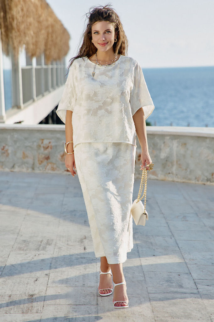 Состав: Блуза: ПЭ-100%; Юбка: ПЭ-100%; Подкладка: ПЭ-97%; Спандекс-3%; Модель отшивается под заказ. Срок пошива от 3 недель. Комплект женский юбочный, состоящий из блузы и юбки. Комплект идеально подх... Показать описаниеодит для вечерних торжеств, где важна каждая деталь, чтобы подчеркнуть изысканную женственность и уверенность в себе — светлый, элегантный и чуть волнующий наряд, который оставляет за собой шепот восхищения. Сочетание матового атласа и зеркального блеска пайеток создает идеальный дуэт. Блуза свободного силуэта, горловина округлой формы. По переду джемпера декоративная отлетная складка, с воланом с заложенными декоративными складками, он живет своей жизнью, колышется при каждом шаге, добавляя динамики и легкости верху. Он не пришит намертво, он «отлетает», создавая ощущение незавершенности и художественного хаоса. Рукав в блузе цельнокроеный, длиной ?. Спинка в блузе со средним швом. Низ в блузе ассиметричный. Юбка прямого силуэта, длины миди с притачным поясом с эластичной тесьмой-резинкой в круговую, что обеспечивает максимально удобную посадку на любой тип фигуры. В среднем шве юбки разрез от низа. Длина спинки блузы 60 см (р 52-56), 61 см ( р 58-62), длина по переду право/лево 58/67 см (р 52-56), 59/69 см (р 58-62). Длина рукава 41 см. Длина юбки 90 см. Блуза 52 54 56 58 60 62 обхват груди 116 120 124 130 134 138 ширина по низу 124 128 132 136 140 144 Юбка 52 54 56 58 60 62 обхват талии 84/114 88/118 92/122 96/126 100/130 104/134 обхват бедер 120 124 128 132 136 140 ширина пояса 4 4 4 4 4 4