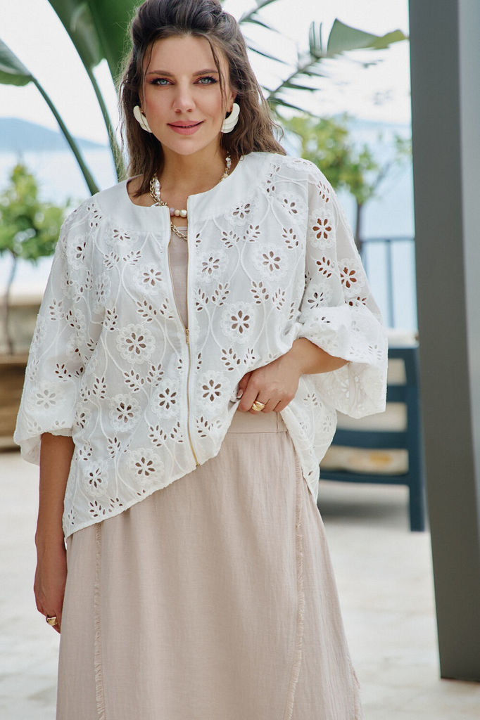Состав: Вискоза-58%; ПА-13%; ПЭ-29%; Модель отшивается под заказ. Срок пошива от 3 недель. В мире, где часто приходится выбирать между практичностью и красотой, этот блузон предлагает третье — искусст... Показать описаниево повседневности, которое можно носить на себе, как вторую кожу, но которая гораздо интереснее первой. Летний блузон молочного оттенка с объёмным фактурным принтом — это не просто предмет одежды, а носимое искусство. Он сочетает в себе скульптурность рельефных узоров и нежность пастельного оттенка, свободный силуэт и сложную фактуру. Блузон свободного силуэта, укороченный. Горловина округлой формы. По переду и спинке блузона вертикальные рельефы. Рукав цельнокроеный с фигурной линией низа. По спинке блузона застёжка на тесьму-молнию. Низ в блузоне ассиметричный. Советы по носке: не перегружать аксессуарами — фактура уже самодостаточна, сочетать с простым низом — чтобы блузон был звездой образа, играть с длиной — заправлять или носить навыпуск. Длина блузон 63 см, длина рукава 42 см (р 50-54), 43 см (р 56-60). Блузон 50 52 54 56 58 60 обхват груди 146 146 146 158 158 158 ширина изделия внизу 124 128 132 136 140 144 ширина рукава внизу 44 44 44 47 47 47