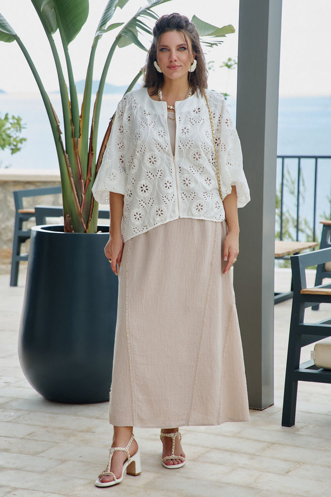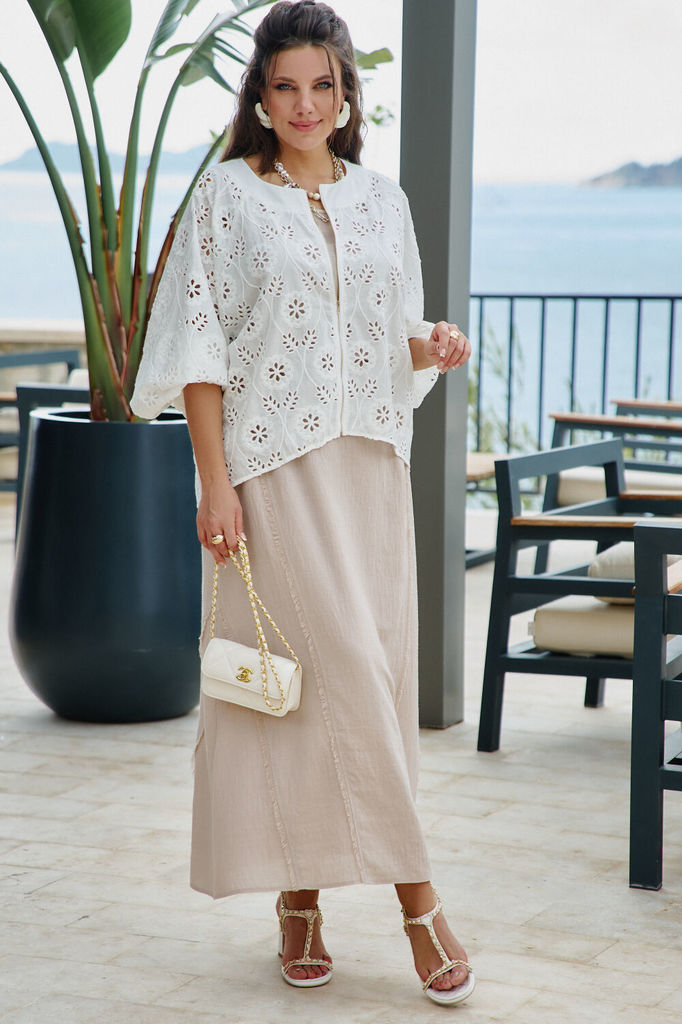Состав: Хлопок-100%; Модель отшивается под заказ. Срок пошива от 3 недель. Этот летний костюм становится настоящим обаянием, который притягивает взгляды окружающих, придавая каждой женщине уверенность... Показать описание и шарм. Костюм идеально подходит как для прогулок по солнцу, так и для вечерних встреч в уютных кафе, даря своему обладателю ощущение легкости и свободы. Каждый шаг в этом наряде станет шагом к светлому настроению, а гармоничное сочетание ткани ришелье и отделочных деталей из однотонной джинсовой ткани привлекут восхищенные взгляды на каждого, кто имеет счастье пройти мимо. Блузка прямого силуэта с центральной застёжкой на петли-пуговицы по планке, отложным воротником рубашечного типа. По переду блузки отрезная кокетка и декоративные клапаны кармана из отделочной ткани. По спинке блузки отрезная кокетка из однотонной ткани. Линия плеча спущенная. Рукав втачной, короткий из ришелье. В боковых швах блузки разрезы. Воротник, планка, кокетка переда и спинки блузки, клапана карманов выполнены из отделочной однотонной ткани- джинса, который гармонично сочетается с основной тканью- ришелье. Юбка трапециевидного силуэта с отрезной кокеткой из однотонной ткани. По переду юбки застежка на тесьму молнию в гульфике и пуговицу в поясе. Пояс в юбке притачной со шлёвками, вставкой эластичной тесьмы-резинки в бочках от талиевых вытачек. По переду юбки прорезные карманы. По заднему полотнищу юбки отрезная кокетка из однотонной ткани со средним швом. Юбка на подкладке. Обращаем Ваше внимание, что фурнитура может незначительно отличаться от фото. Длина блузки 66 см (р.50-54), 67 см (р.56-60). Длина рукава 12 см. Длина юбки 88 см. блузка 50 52 54 56 58 60 обхват груди 122 122 122 134 134 134 обхват талии ширина изделия внизу 124 124 124 136 136 136 ширина рукава внизу 46 46 46 49 49 49 юбка 50 52 54 56 58 60 ширина по талии в собранном виде 80 84 88 92 96 100 ширина по талии в растянутом виде 100 104 108 112 116 120 ширина на уровне линии бедер 126 130 134 138 142 146