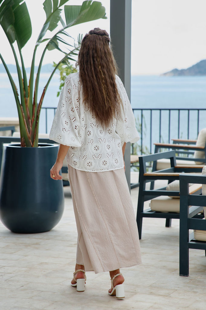 Состав: ПЭ-100%; Модель отшивается под заказ. Срок пошива от 3 недель. Общий образ — союз современных линий и благородного сияния. Контраст между строгой геометрией прямоугольной блузы и плавной свобо... Показать описаниедой рукавов, и между богатым блеском ткани создаёт костюм, который подходит для торжественных мероприятий и вечерних встреч, сохраняя при этом эффект лёгкой воздушности и неповторимой эстетики. Это наряд, в котором каждый штрих продуман до мельчайших деталей, чтобы подчеркивать женственность и уверенность в любом световом окружении. Грациозный костюм встречает восходящую элегантность — блуза прямоугольного силуэта с рукавом кимоно и юбка миди, завязывающаяся впереди узлом, выполнены в стильном перламутровом оттенке. Блуза держится по линии плеча строго и уверенно, но её рукав-кимоно добавляет свободную плавность движению и нежную асимметрию. Головина по форме «лодочка», линия плеча спущенная. Фасон прямоугольной блузы подчеркивает минимализм, который обретает характер за счёт текстуры и сияния. Рукав-кимоно свободен в движении, но его концы и края тщательно обработаны, образуя спокойную, но выразительную линию по всей длине руки. Юбка миди завершает композицию: она облегает талию и плавно расходится к низу, не теряя движения. Завязка спереди образует аккуратный узел, который служит ярким акцентом и одновременно функциональной деталью, позволяющей регулировать посадку. Лаконичная посадка сочетается с мягким мерцанием ткани — переливы ткани, будто собрались в узоре мелких светлячков, танцующих на поверхности материала.В оригинальности образу помогает отсутствие лишних деталей — всё в этом костюме рождает ощущение продуманной сдержанности. Длина по спинке блузы 54,5 см (р 50-54), 56,5 см (р 56-60). Длина рукава 54 см (р 50-54), 55 см (р 56-60). Длина юбки 98 см. Блуза 50 52 54 56 58 60 ширина на уровне глубины проймы 264 264 264 270 270 270 ширина на уровне талии (по низу изделия) 128 132 136 140 144 148 ширина рукава внизу 24 24 24 26 26 26 Юбка 50 52 54 56 58 60 длина 98 98 98 98 98 98