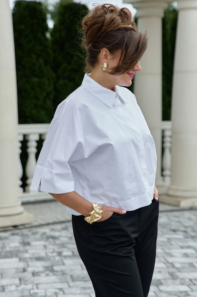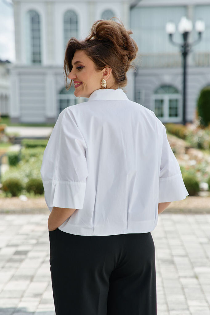 Состав: Спандекс-3%; Хлопок-66%; Нейлон-31%; Модель отшивается под заказ. Срок пошива от 3 недель. Наш хит в стильном исполнении. База, которая должна быть в Вашем гардеробе! Данная модель даёт возмож... Показать описаниеность одеть ее не только на деловые офисные мероприятия, но и на вечерние торжественные события, дополнив ее аксессуарами. Блузка свободного силуэта, укороченная с ассиметричной линией низа, с центрально-бортовой потайной застёжкой на петли- пуговицы и воротником рубашечного типа. Низ блузки оформлен декоративными складками переходящими с левой детали на спинку. Спинка в блузке без особенностей. Рукав цельнокроеный с притачной широкой манжетой с декоративным разрезом по низу. Обращаем Ваше внимание, что фурнитура может незначительно отличаться от фото. Длина блузки по спинке 56,5 см (р 50-54), 58,5 см (р 56-60). Длина рукава блузки 51 см (р 50-54), 52 см (р 56-60). Блузка 50 52 54 56 58 60 ширина изделия на уровне проймы 152 156 160 164 168 172 ширина изделия внизу 120 124 128 132 136 140 ширина рукава вверху 47 47 47 52 52 52 длина по спинке 56,5 56,5 56,5 58,5 58,5 58,5