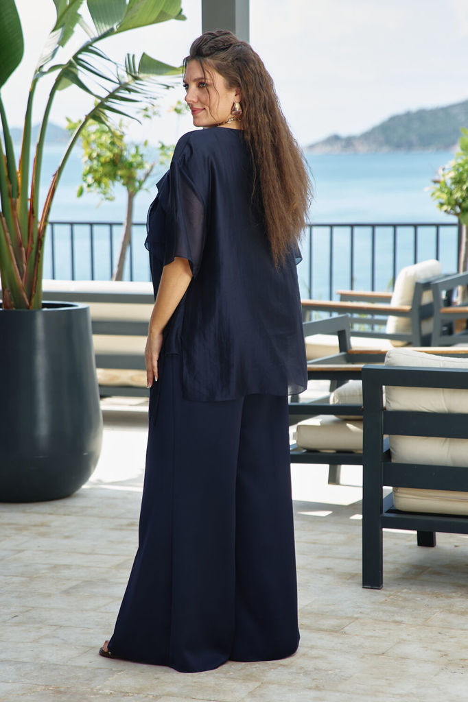 Состав: Блуза: Вискоза-39%; Район-61%; Брюки: ПЭ-100%; Модель отшивается под заказ. Срок пошива от 3 недель. Это стильный и современный ансамбль, который состоит из блузы и брюк. Изысканный женский ко... Показать описаниемплект идеален для торжественных мероприятий, он станет жемчужиной вашего гардероба. Брючный комплект можно дополнить минималистичными украшениями, которые подчеркнут утончённость, завершая этот элегантный, но уверенный образ.Блуза (состав: 61% район, 39% вискоза) свободного силуэта с асимметричной формой горловины: одно плечо открыто, расположен декоративный элемент чёрного цвета из отделочной ткани. Рукав цельнокроеный. Спинка без особенностей. Блуза на подкладке. Брюки (состав: 100% полиэстер) свободного кроя выполнены из плотной, матовой ткани чёрного цвета. Их широкий фасон и высокая посадка на талии создают элегантный и удлинённый силуэт, а также контрастируют с лёгким и воздушным верхом. Пояс в брюках притачной со вставкой эластичной тесьмы-резинки в бочках. По переду брюк от пояса застрачивается складка. В среднем шве брюк застёжка на потайную тесьму молнию и пуговицу в поясе. Длина блузы 56,5 см (р 52-56), 57,5 см (р 58-62), длина рукава 36,5 см (р 52-56), 37,5 см (р 58-62). Длина брюк 108 см. Блуза 52 54 56 58 60 62 ширина на уровне проймы 194 194 194 202 202 202 обхват бедер 122 126 130 134 138 142 Брюки 52 54 56 58 60 62 ширина по талии 84/98 88/102 92/106 96/110 100/114 104/118 обхват бедер 122 126 130 134 138 142