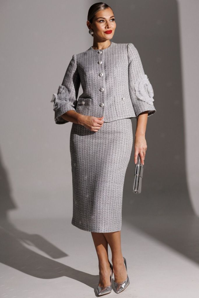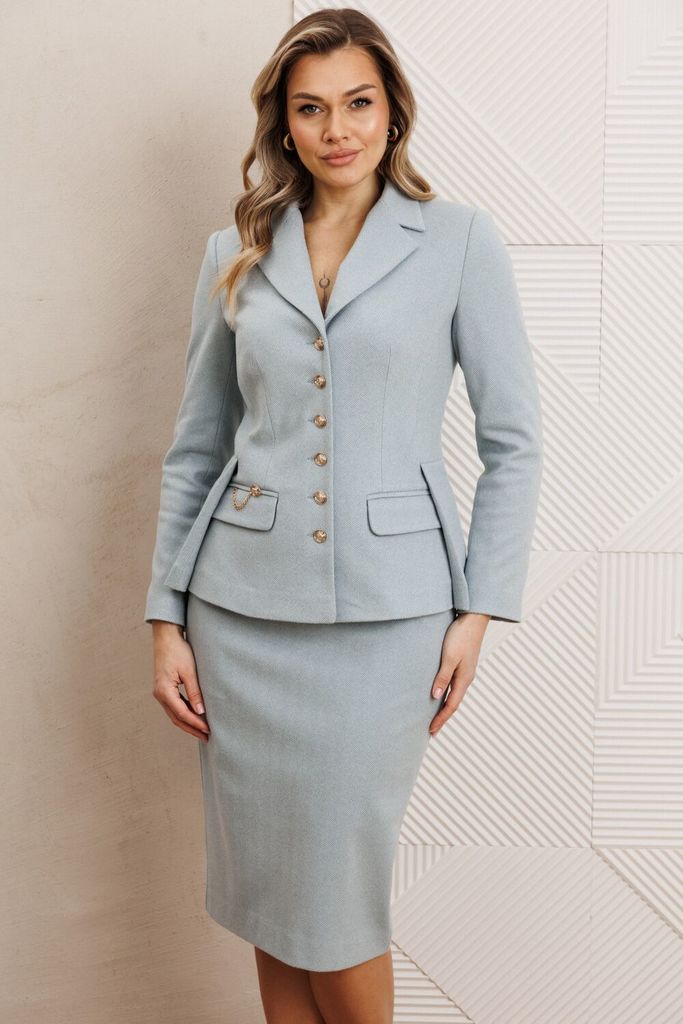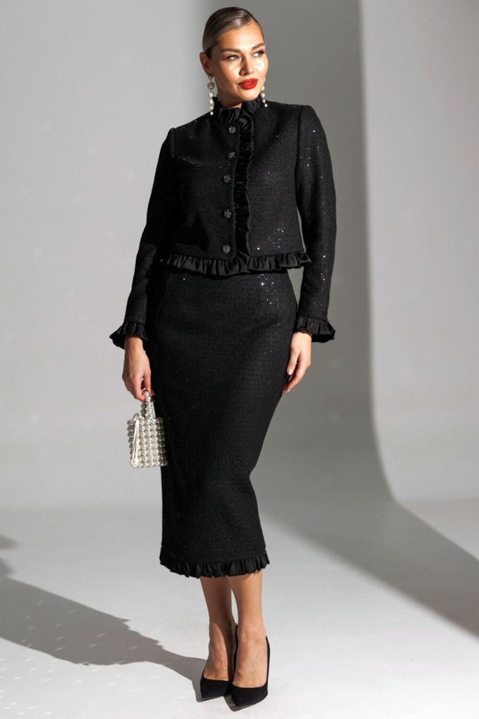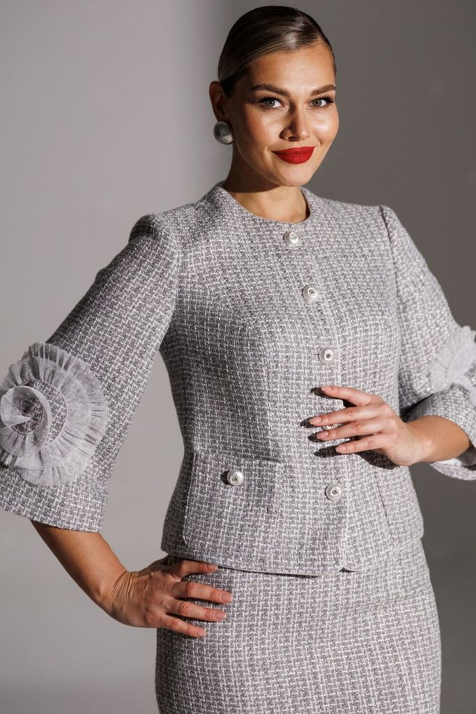 Состав: Хлопок-15%; Люрекс-1%; Полиакрил-84%; Костюм в стиле Шанель, состоящий из жакета и юбки, представляет собой элегантный и стильный ансамбль. Жакет полу прилегающего силуэта имеет центральную за... Показать описаниестежку на петли пуговицы, что придает ему изысканный вид. Спинка жакета оформлена средним швом, а передняя часть украшена талиевыми вытачками, заканчивающимися разрезами, над которыми аккуратно настрочены клапаны с пуговицами. Воротник пиджачного типа добавляет строгости, а рукава длиной 3/4 с шлицей в локтевом шве подчеркивают женственность образа. Юбка выполнена в прямом силуэте с эффектным разрезом по переду, который декорирован отделочной тканью «плиссе», придающей дополнительный шарм. Пояс юбки притачной с резинкой сзади обеспечивает комфортную посадку, а боковая молния облегчает надевание. Вся конструкция костюма выполнена на подкладке, что обеспечивает удобство и приятные тактильные ощущения. Такой костюм идеально подходит для офисной обстановки или деловых встреч, сочетая в себе классический стиль и современные акценты. длина жакета по спинке: 53 см длина рукава: 48 см длина юбки с поясом: 82 см