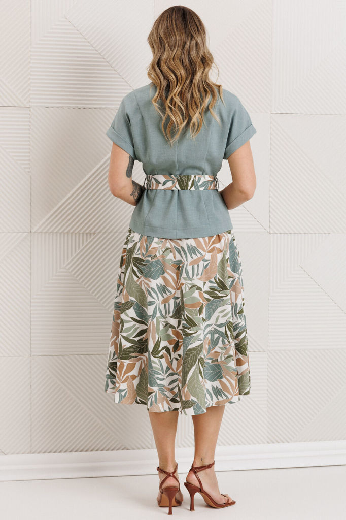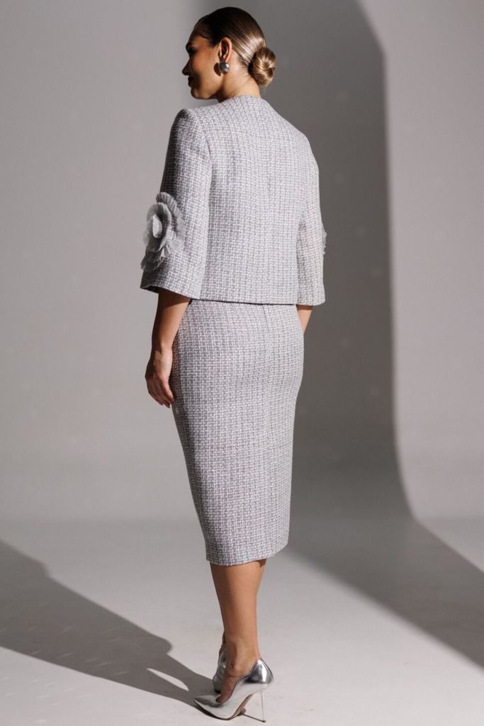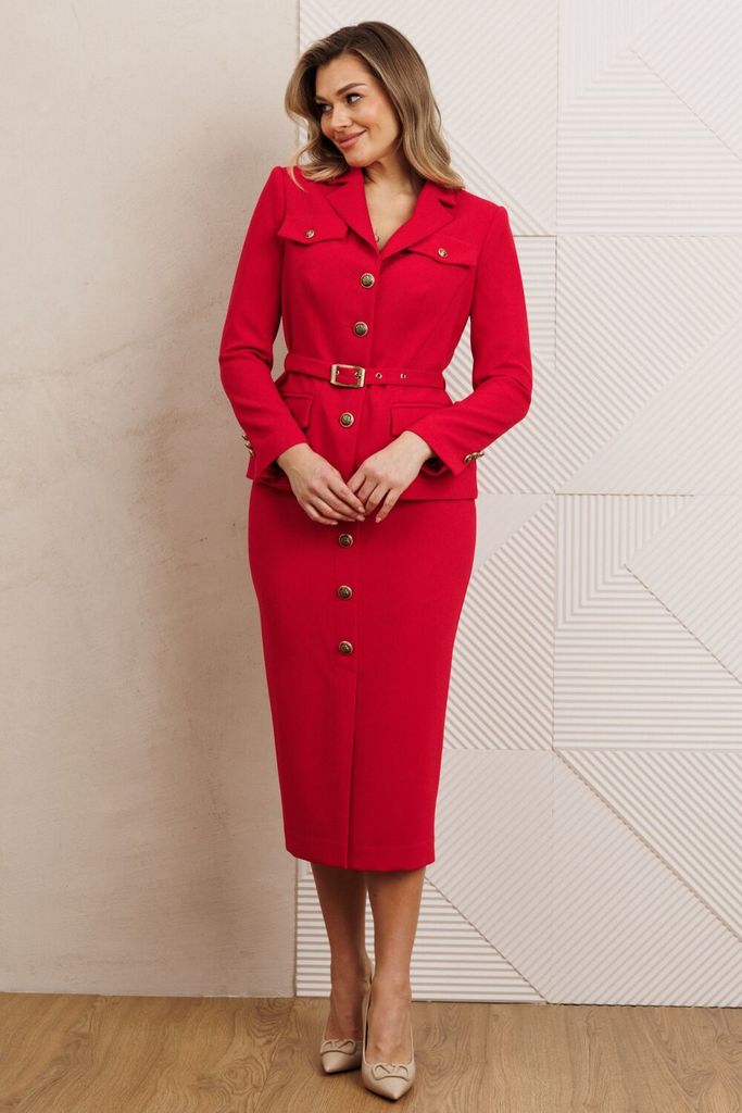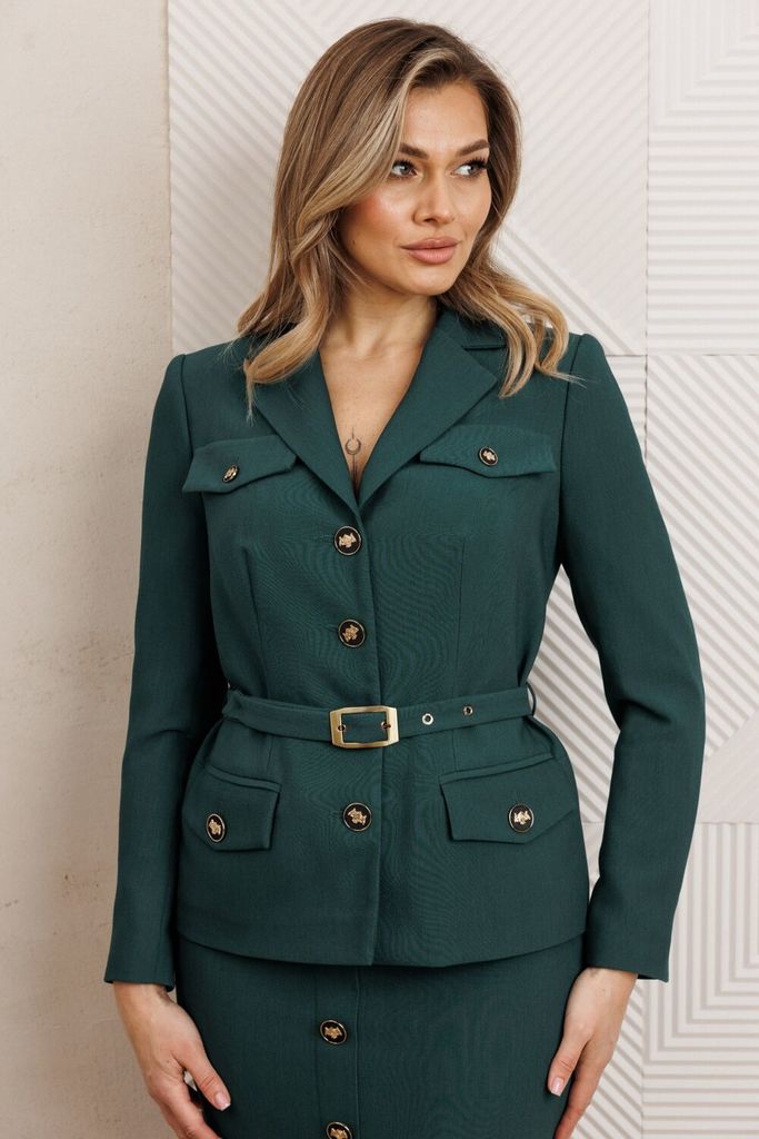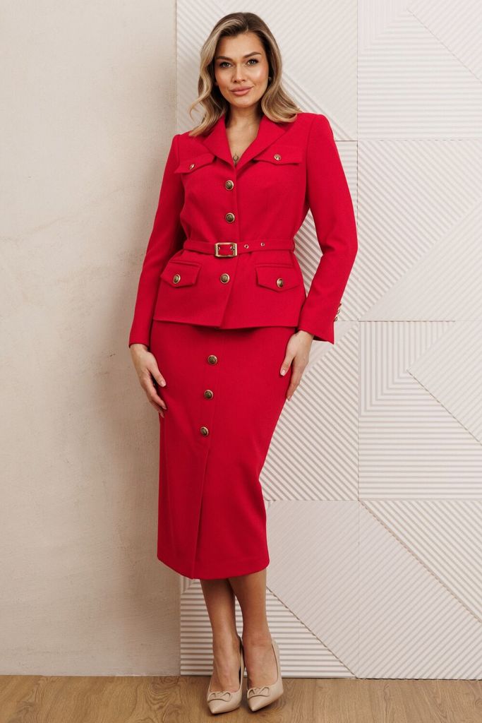 Состав: Вискоза-33%; ПЭ-65%; Спандекс-2%; Комплект, состоящий из жакета и юбки. Жакет полуприлегающего силуэта с центральной застежкой на петли-пуговицы. Спинка со средним швом. По переду – талиевые в... Показать описаниеытачки, карманы с клапаном и декоративные клапаны в области груди. Воротник пиджачного типа. Рукава втачные, двухшовные. Локтевой шов заканчивается отлетной шлицей с декором из ряда пуговиц. Жакет на подкладке. Жакет дополнен съёмным поясом с пряжкой. Юбка-карандаш - воплощение классической офисной элегантности. Ее строгий силуэт, подчеркивающий линию бедер, создает безупречно профессиональный образ. Юбка зауженная к низу. Изюминка дизайна спереди: элегантная шлица, декорированная аккуратной отделкой из пуговиц. Эта деталь не только добавляет динамику и визуальный интерес, но и обеспечивает свободу движения. Боковая застежка-молния обеспечивает аккуратную посадку и легкое надевание, сохраняя чистоту линий спереди и сзади. Притачной пояс с резинкой сзади. На подкладке. Такая юбка является не просто базовой вещью, а законченным стильным акцентом Вашего делового гардероба. Она безупречно сочетается с блузами, жакетами и топами, создавая элегантный и уверенный ансамбль. Замеры 46-52: Жакет: Длина спинки 63 63 63 63 Ширина спинки 39 39,5 40 40,5 Ширина на уровне глубины проймы 51 53 55 57 Ширина по линии талии 49 51 53 55 Длина рукава 61 61 61 61 Ширина по линии бедер 55 57 59 61 Ширина рукава вверху 16,5 17,5 18,5 19,5 Ширина плеча 12 12,3 12,5 12,7 Юбка Длина по боковому шву 84 84 84 84 Ширина по линии талии 39 41 43 45 Ширина по линии бедер 51 53 55 57